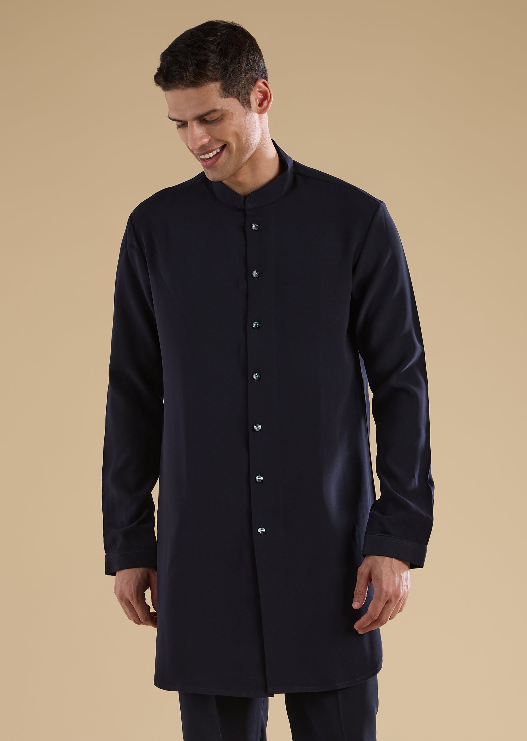 Striking and contemporary with regal detailing, this navy blue Indo-Western set is crafted from premium imported fabric for a luxurious statement. Designed with a mandarin collar, full sleeves, and side... More Product Details