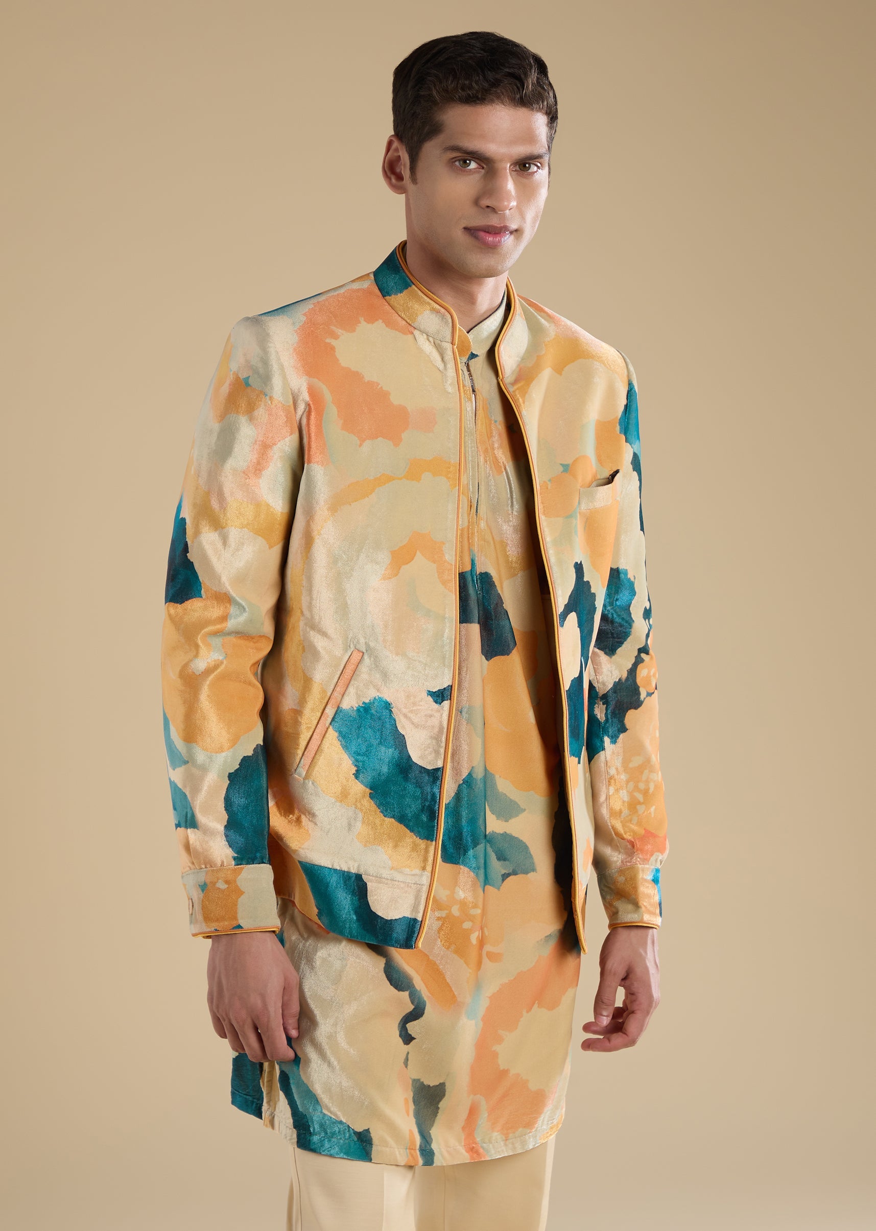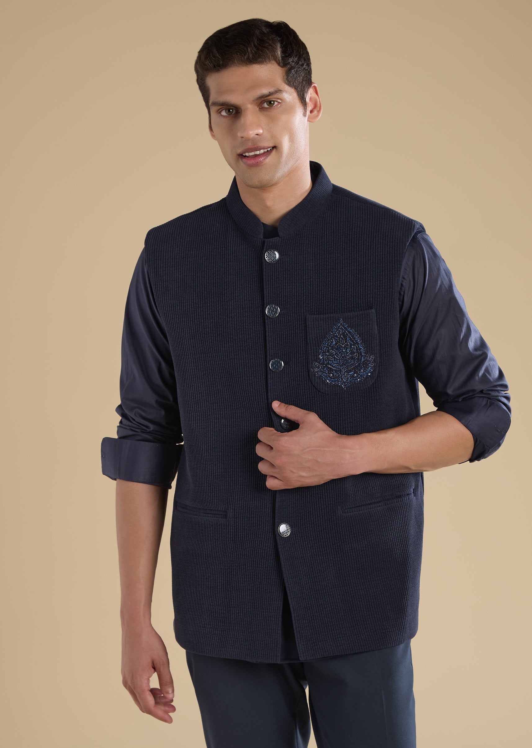 Crafted in corduroy, this navy blue jacket kurta features subtle thread embroidery. Designed with a mandarin collar, full sleeves and front button with hook-eye closure, it’s a versatile festive pick for sangeet and celebrations. Awarded as the Most Trusted Brand, we're delivering styles you love, just as promised.