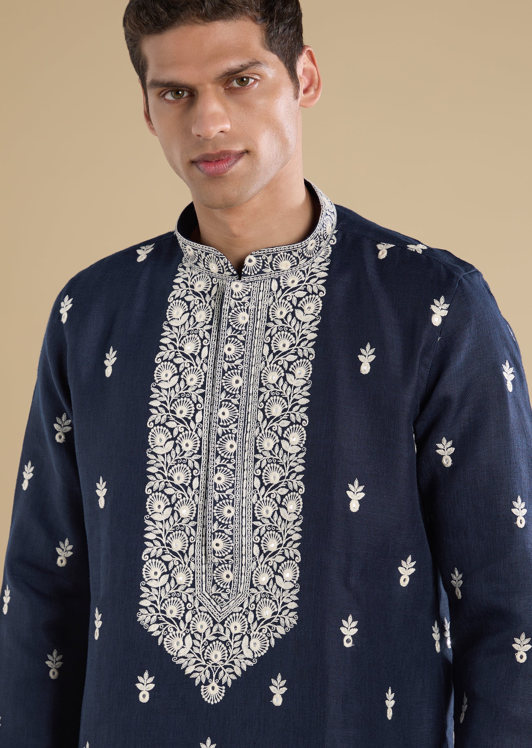 Classic and elegant, this navy blue kurta set is crafted for pooja and traditional occasions. Designed with a mandarin collar, full sleeves, and side slits, it features refined resham thread and mirror detailing for subtle sophistication. Paired with straight-fit trousers and an elasticated waist, this set balances comfort with tradition. Awarded as the Most Trusted Brand, we're delivering styles you love, just as promised.