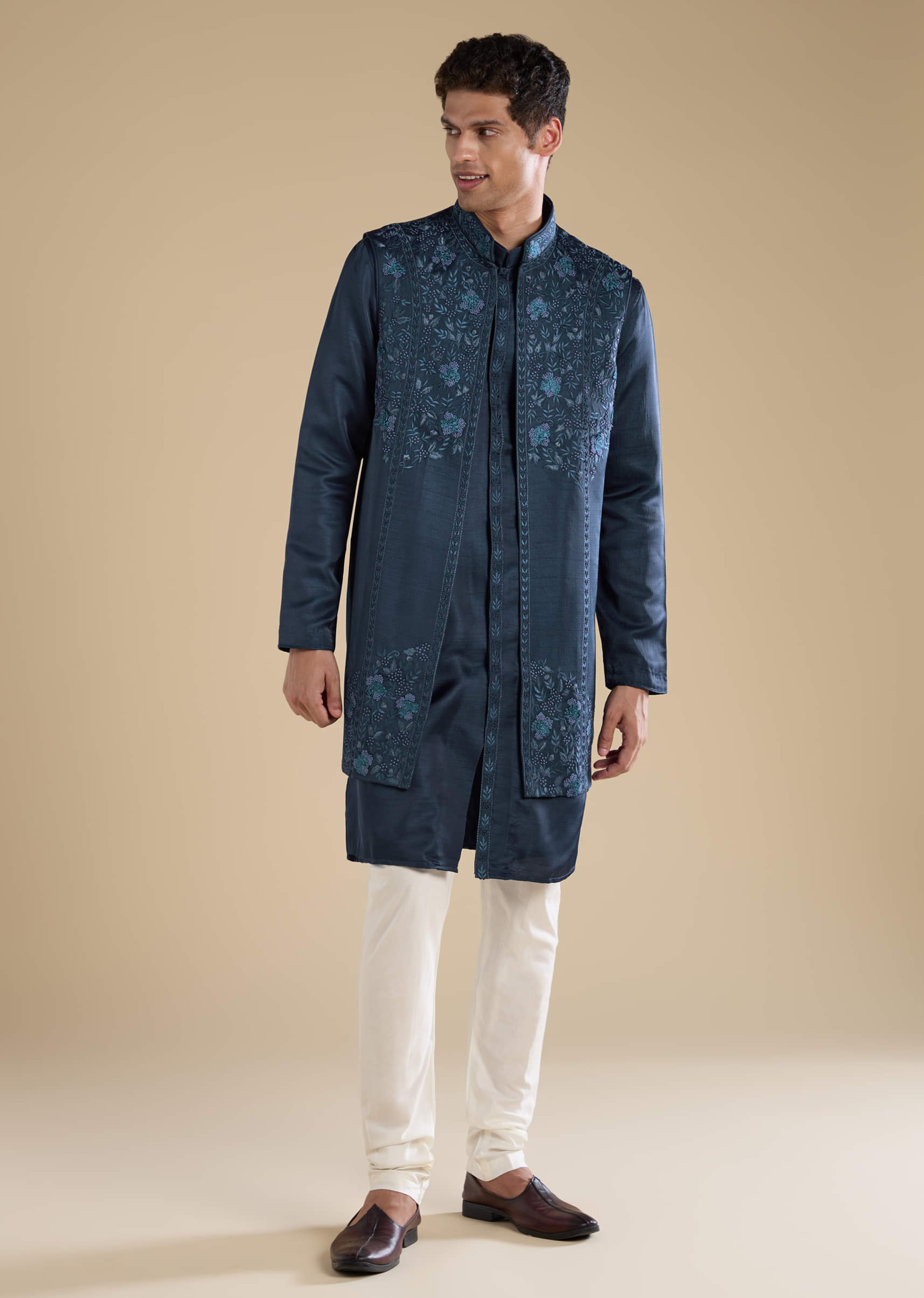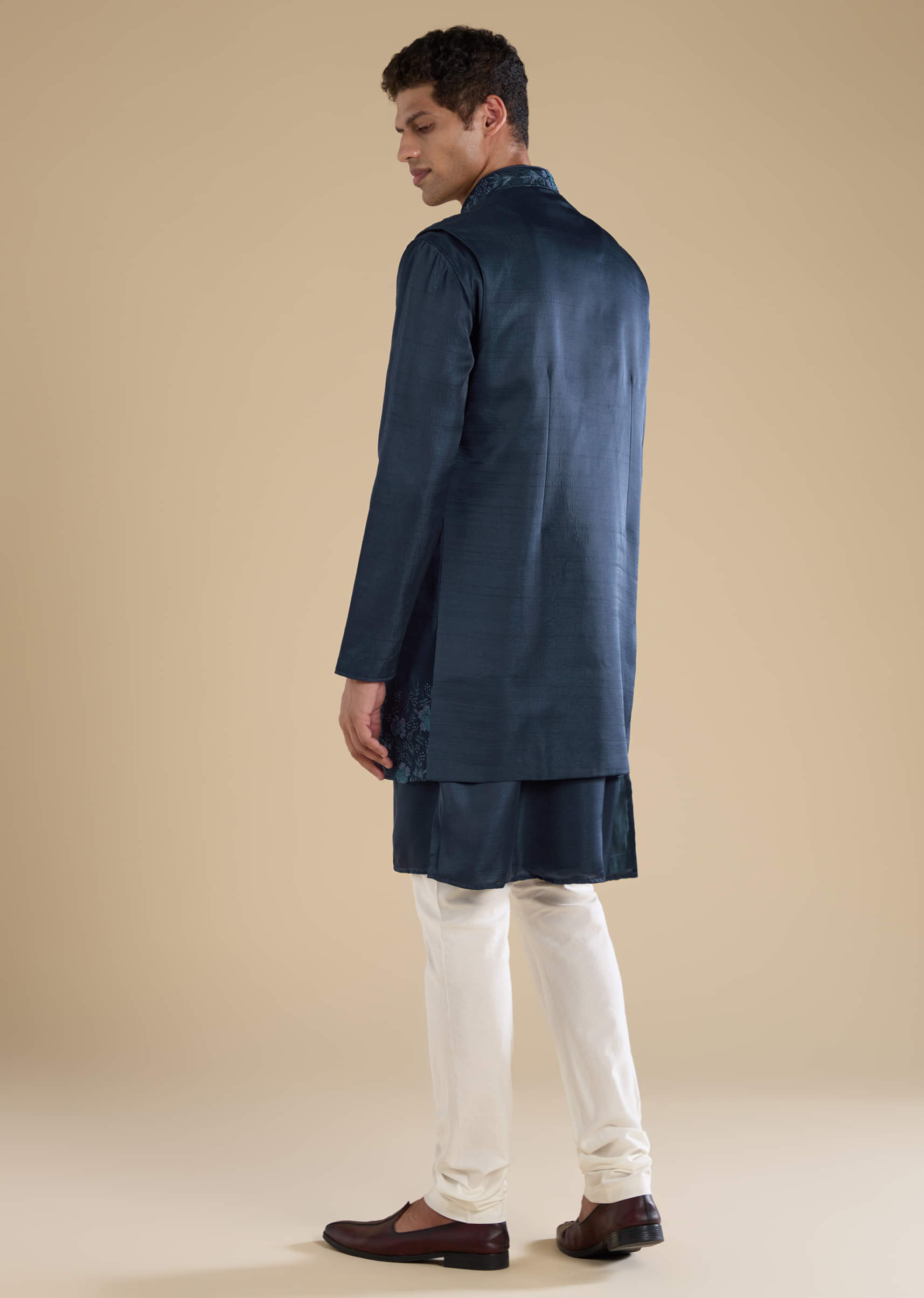 Navy Blue Embroidered Mens Jacket Kurta and Pant Set
