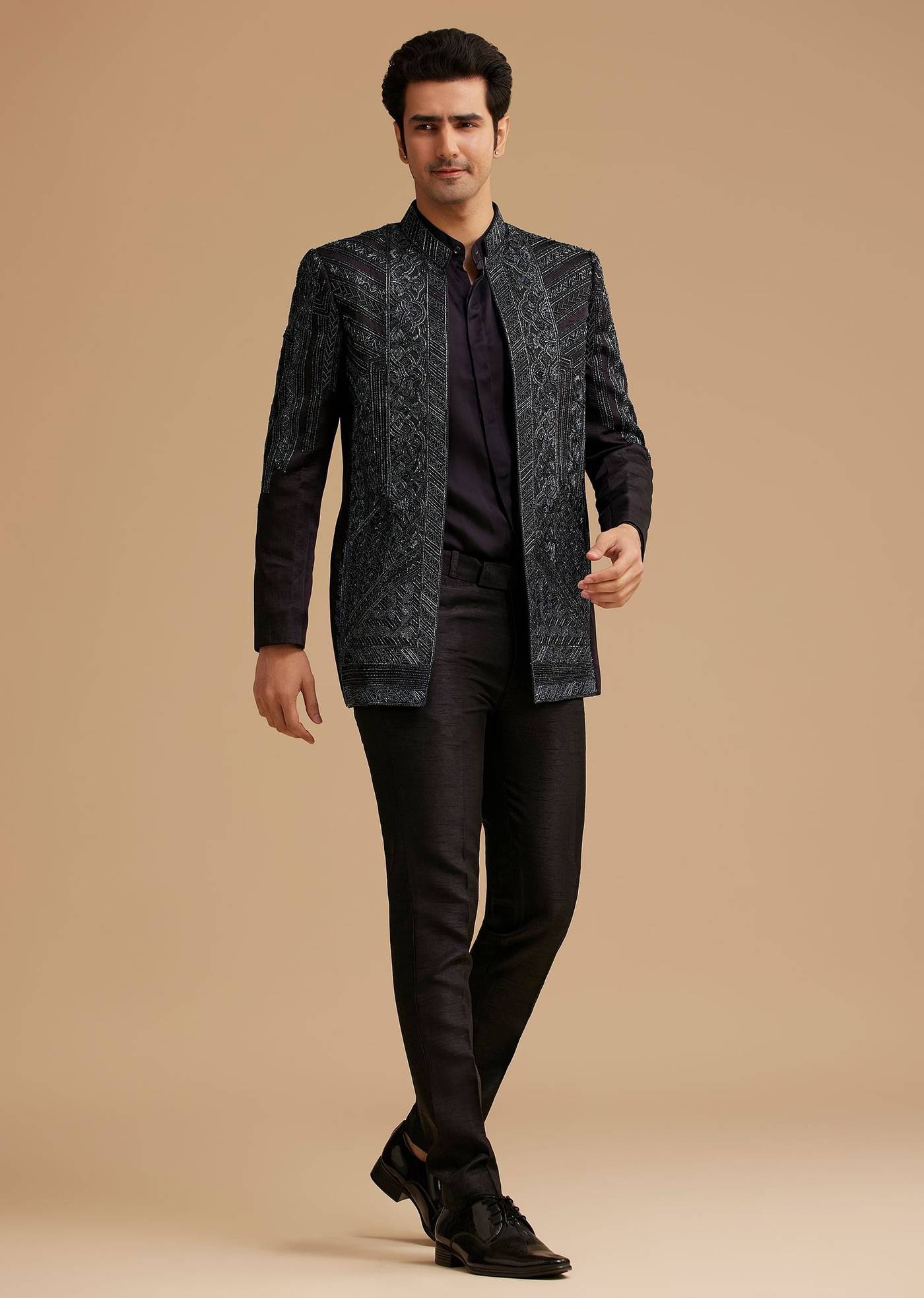 Make a powerful statement in this navy blue Jodhpuri suit, adorned with exquisite cut dana and sali embroidery. The structured silhouette is enhanced by a sleek Chinese-collared shirt and regular-fit... More Product Details