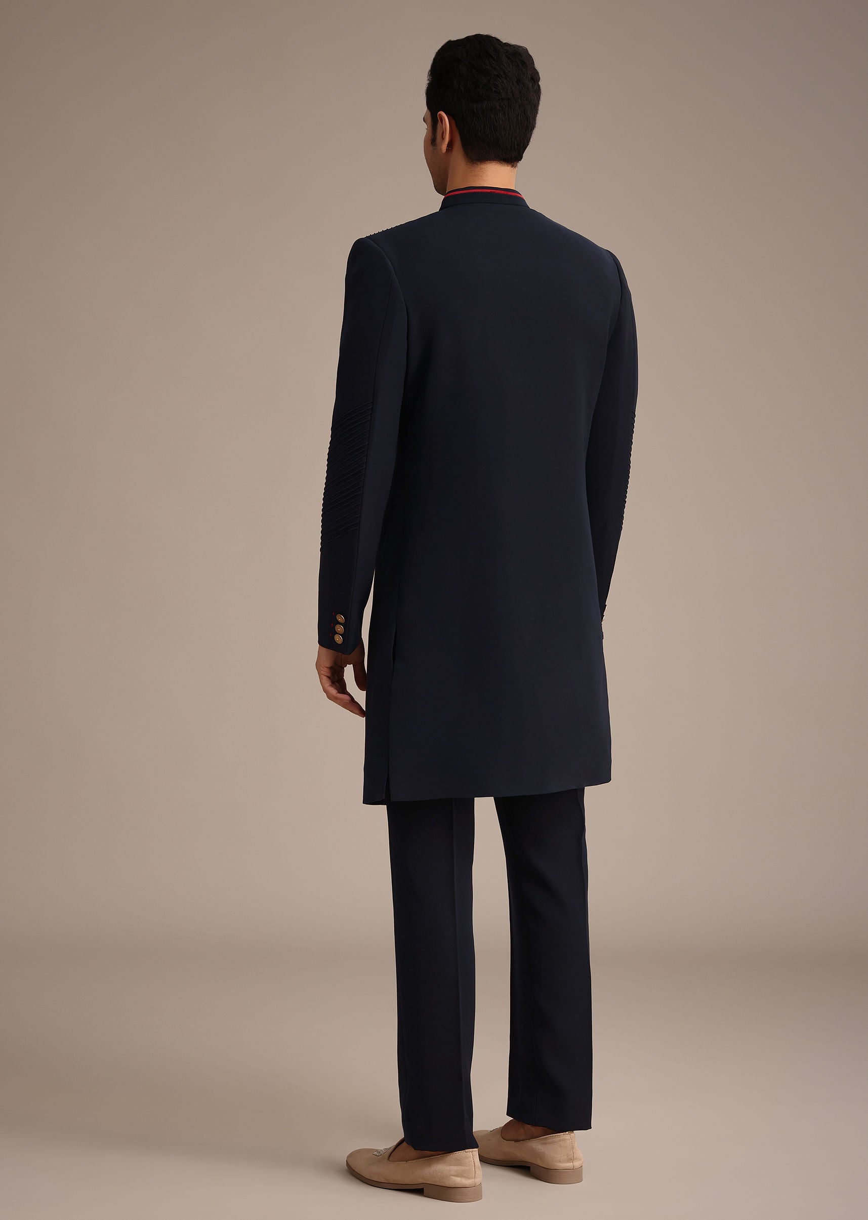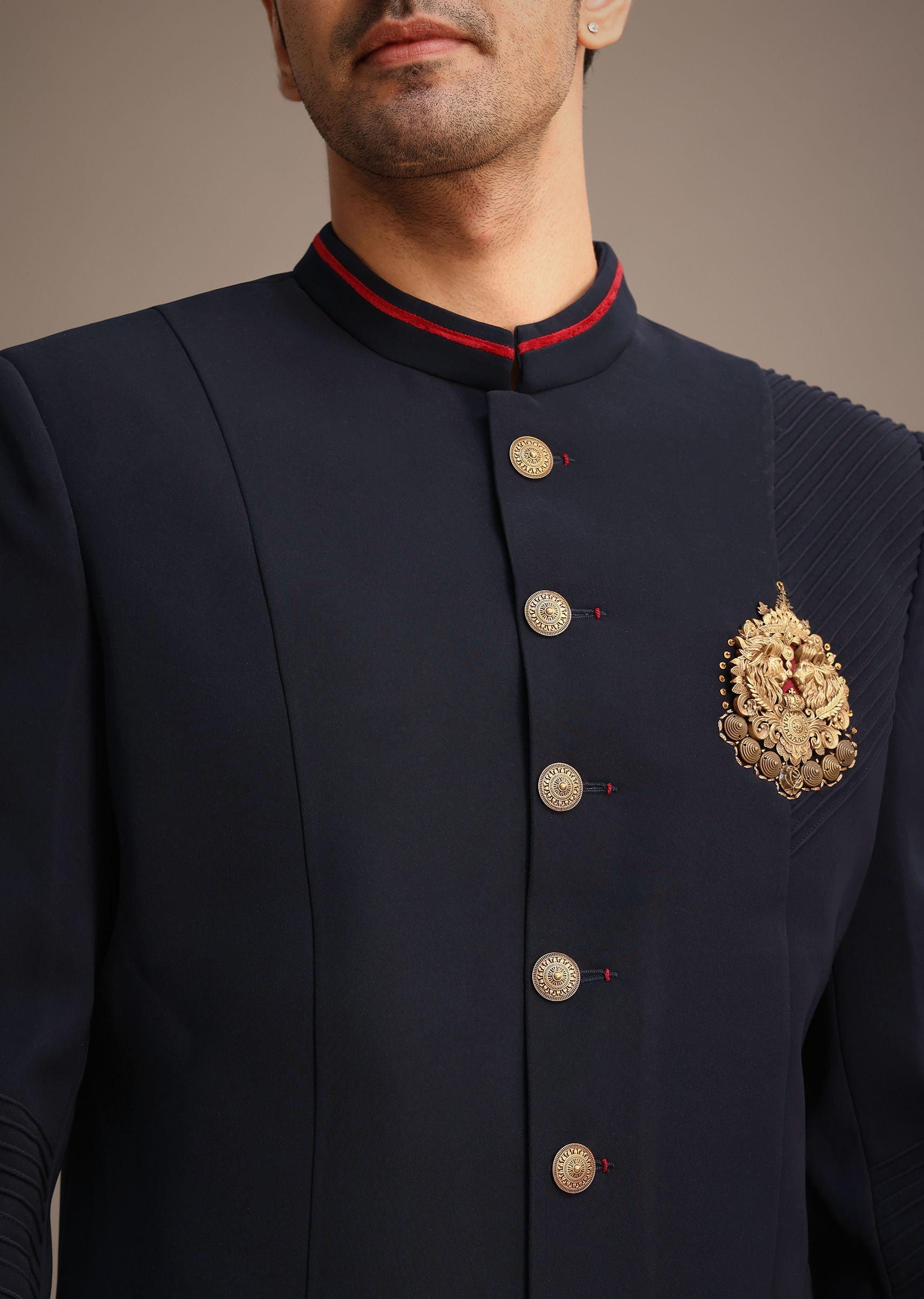 Navy Blue Indowestern Set With Animal Motif Brooch