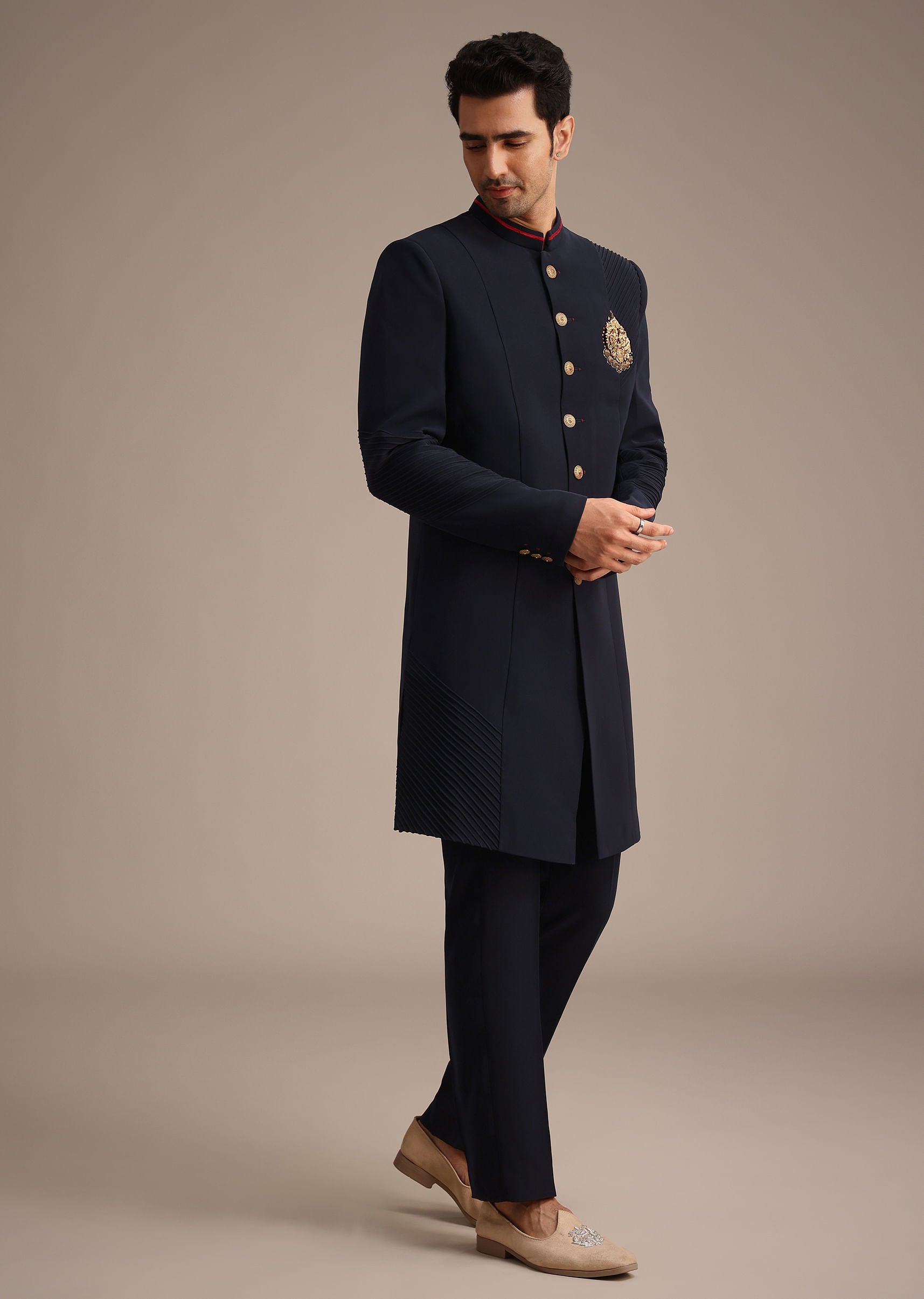 Radiate elegance and charm everywhere you go in this minimal and elegant navy blue indowestern set. Expertly crafted, the jacket is accented with a mandarin collar, front buttons and full sleeves. Highlighted with an animal motif metal brooch, this set is complemented with matching bottoms. Perfect for year round festivities. Awarded as the Most Trusted Brand, we're delivering styles you love, just as promised.