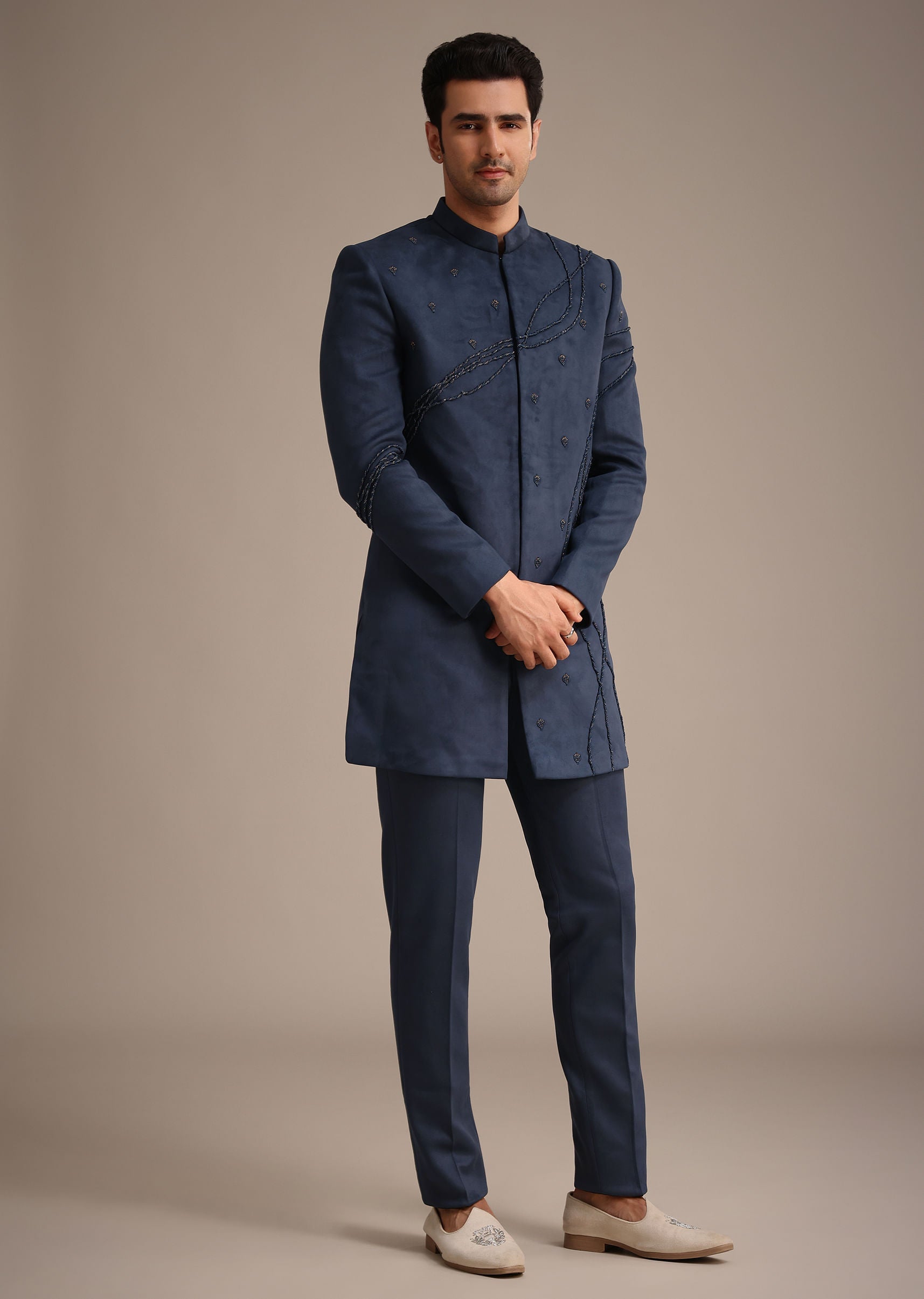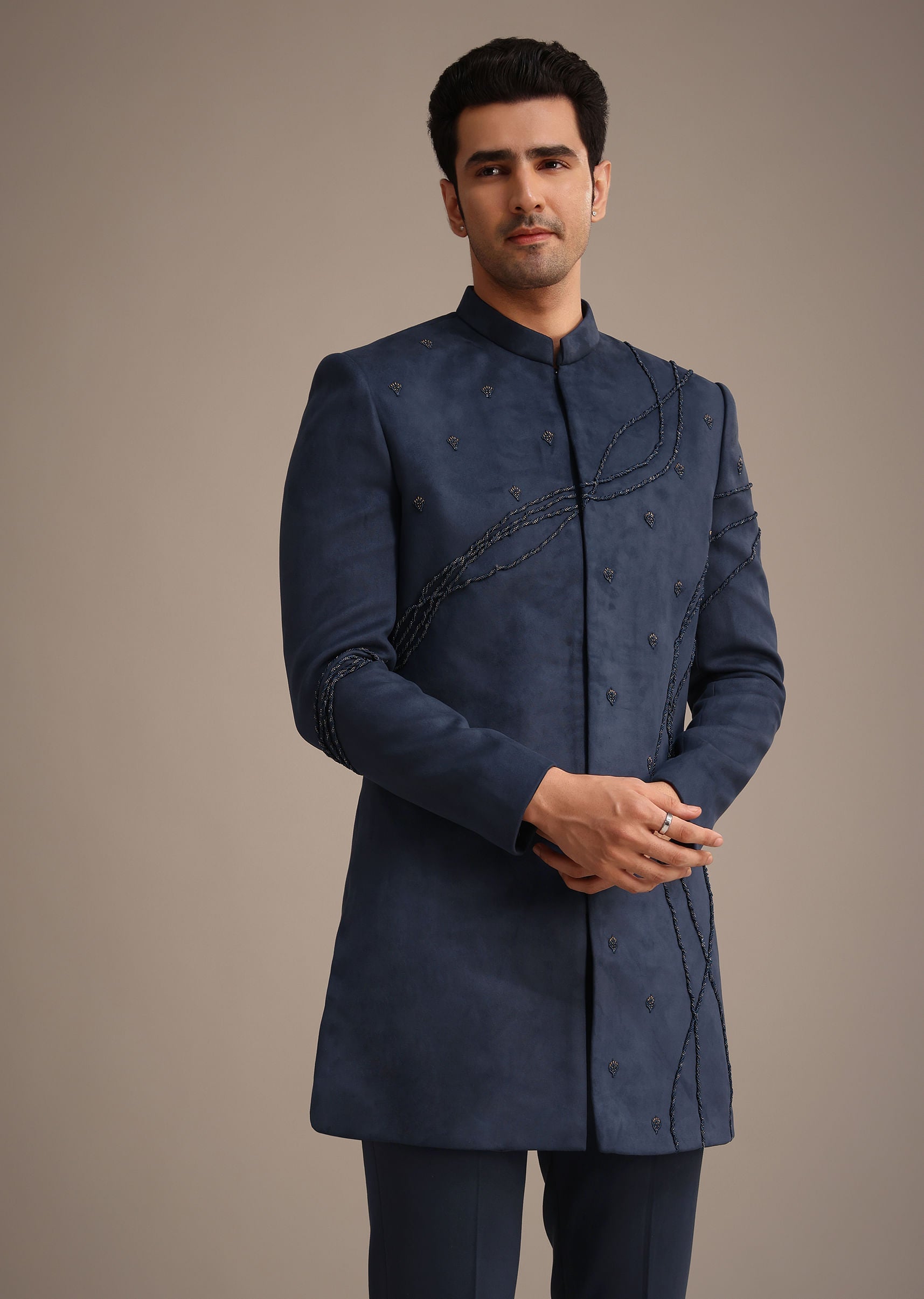 Introducing our navy blue indowestern set that will charm the crowd at every occasion. Tailored with a stylish mandarin collar, front hook-eye placket and full sleeves, the comfortable design offers an elegant appeal. Adorned with intricate dori hand embroidery, this set is complemented with matching bottoms. An ideal choice for year round weddings and festivities. Awarded as the Most Trusted Brand, we're delivering styles you love, just as promised.