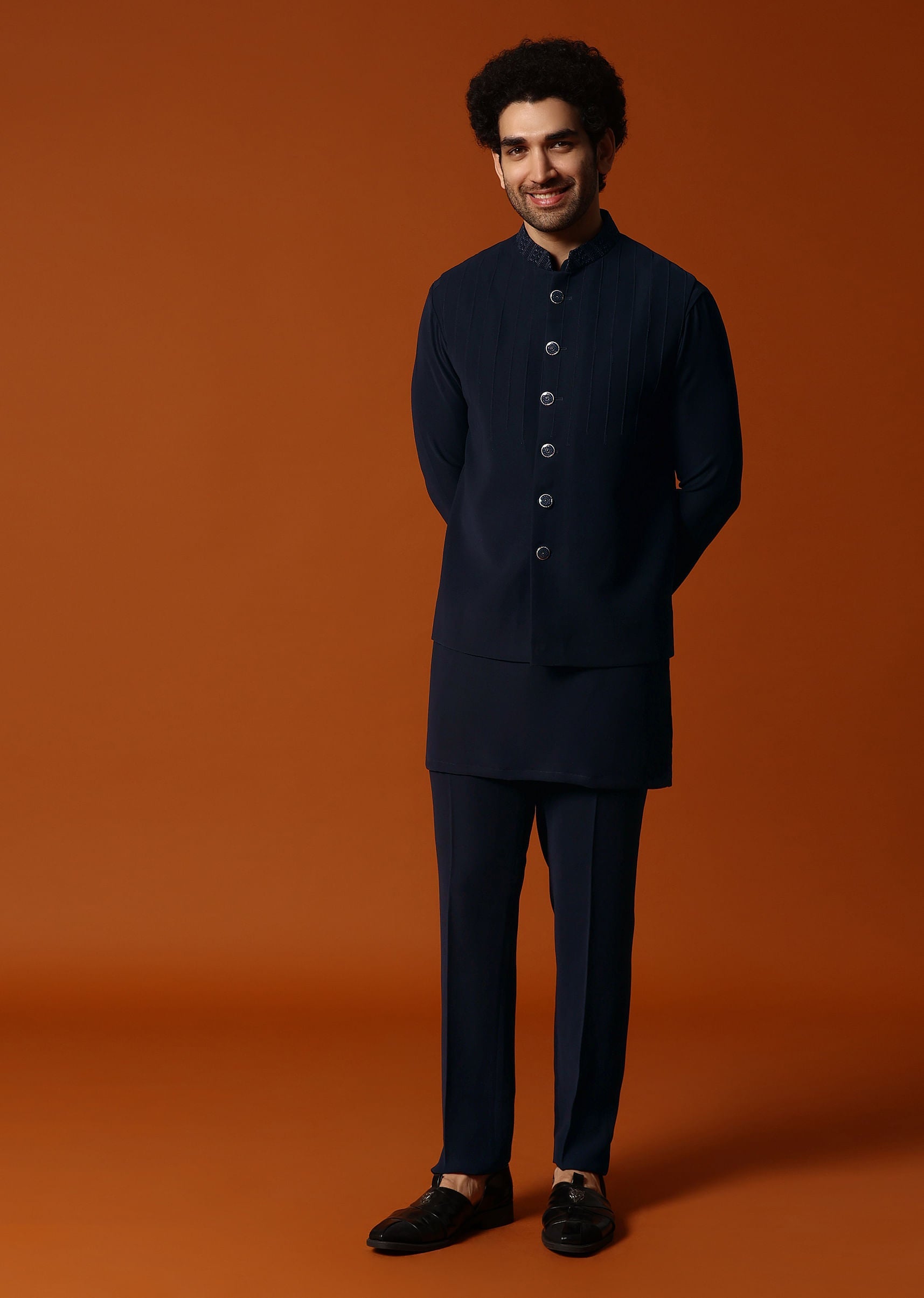 Enter the realm of timeless elegance with our navy blue jodhpuri set, meticulously designed for sangeet and wedding festivities. Crafted from premium polyester, this set features intricate resham embellishments. The jodhpuri ensemble includes a bandi, a kurta, and bottoms. Awarded as the Most Trusted Brand, we're delivering styles you love, just as promised.
