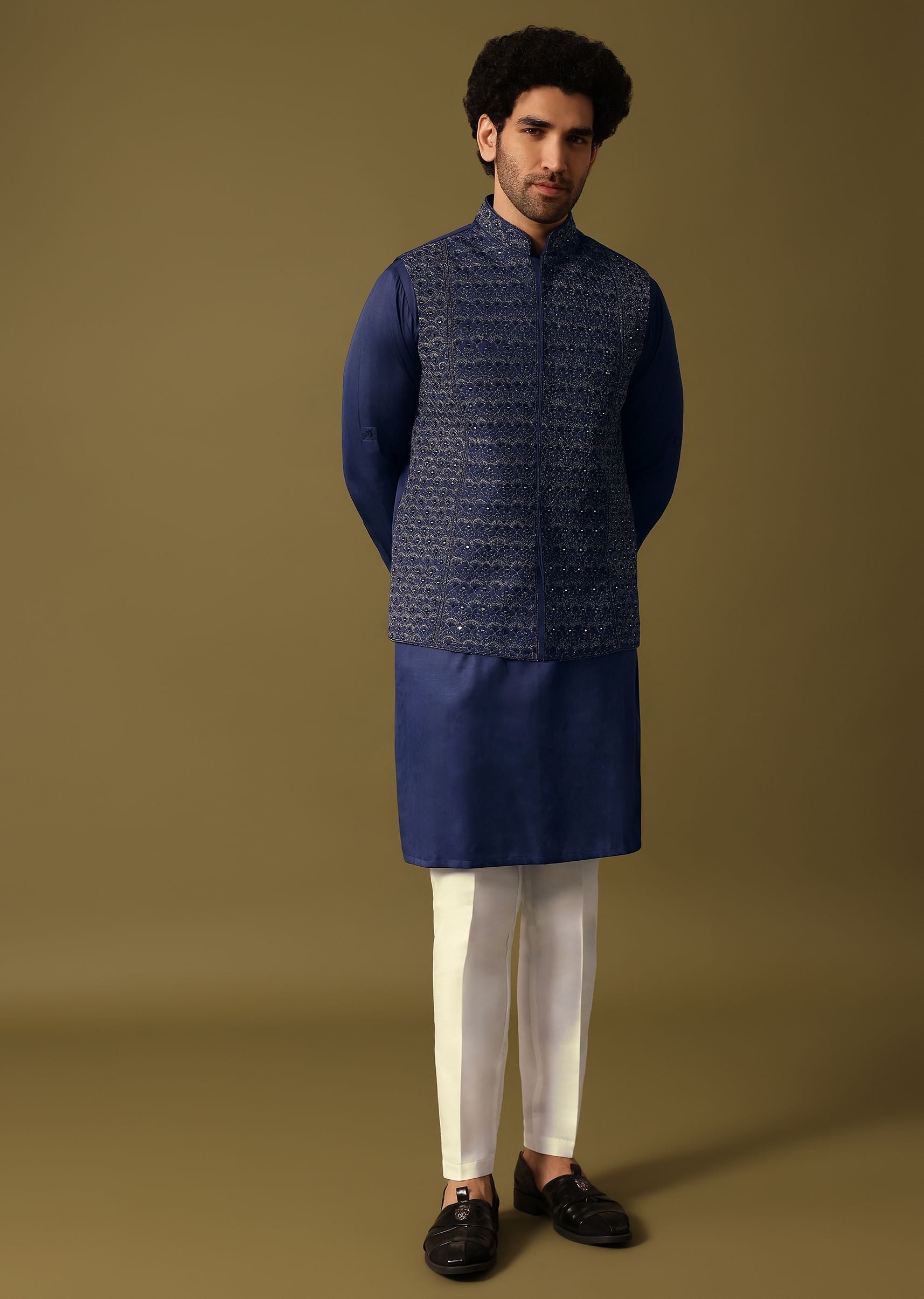 Navy Blue Kurta Jacket Set With Resham And Mirror Work For Men