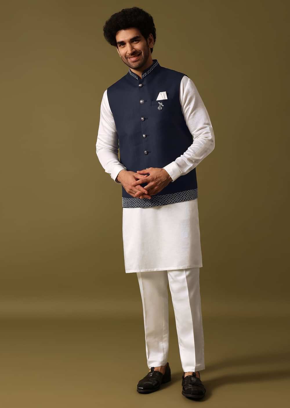 Navy Blue Kurta Jacket Set With Resham Work For Men
