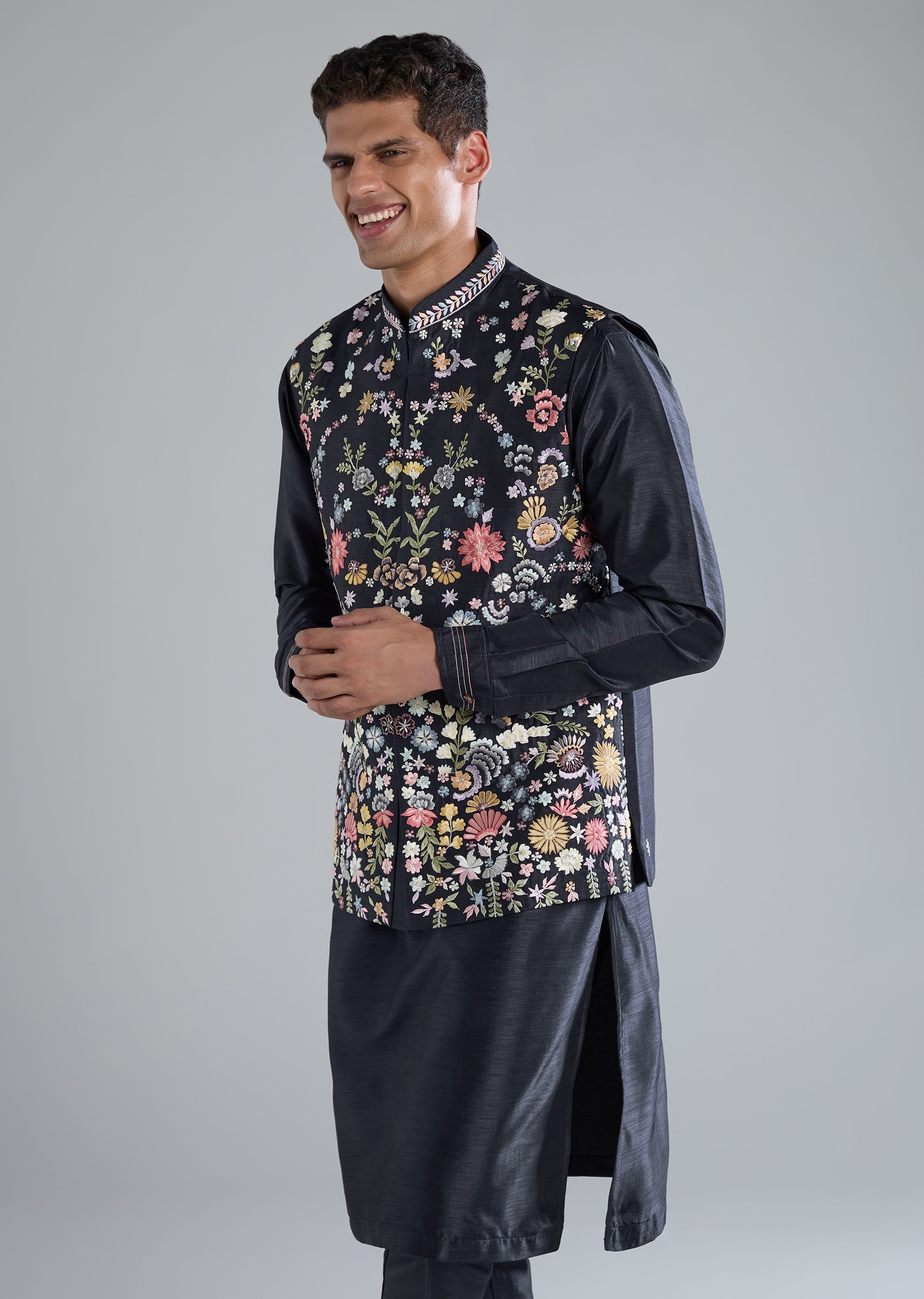 This navy blue kurta jacket set is crafted in smooth silk and elevated with intricate thread resham work, making it an ideal choice for sangeet, mehendi, and wedding celebrations. Designed with full sleeves, a mandarin collar, a front hook eye top closure, and a matching hook eye bottom closure, it offers a refined and coordinated look. The set includes a jacket, kurta, and pants, creating an elegant ensemble for festive occasions. Awarded as the Most Trusted Brand, we're delivering styles you love, just as promised.