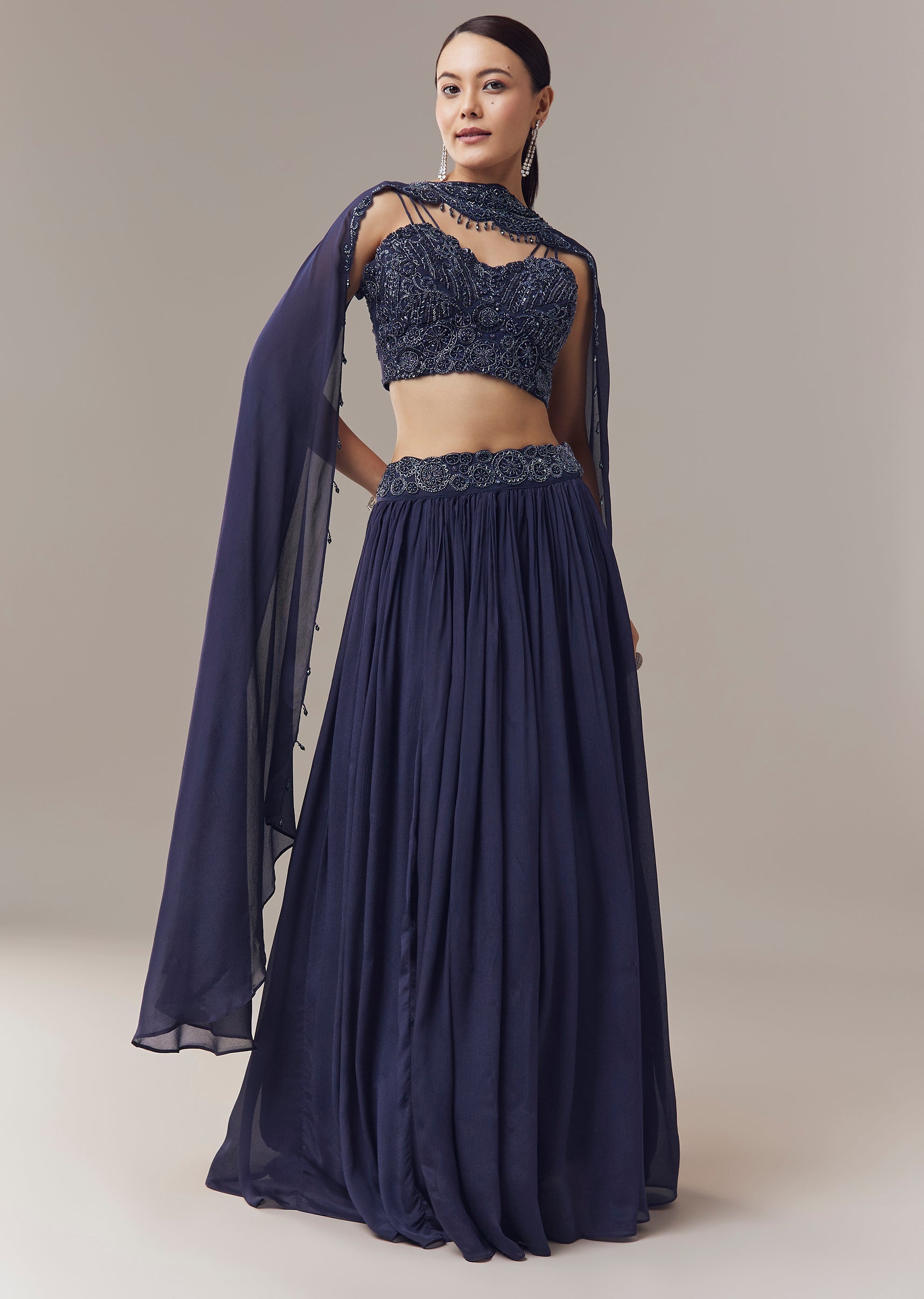 Elegant and festive, this navy blue lehenga is crafted in soft chinon fabric for a comfortable and graceful fit. The sleeveless blouse features intricate beads, sequins, and cut dana embroidery, adding shimmer and refined detailing. Designed with a sweetheart neckline and paired with a coordinated dupatta, this ensemble is perfect for bridesmaids or wedding guest occasions, creating a striking and contemporary festive look. Awarded as the Most Trusted Brand, we're delivering styles you love, just as promised.