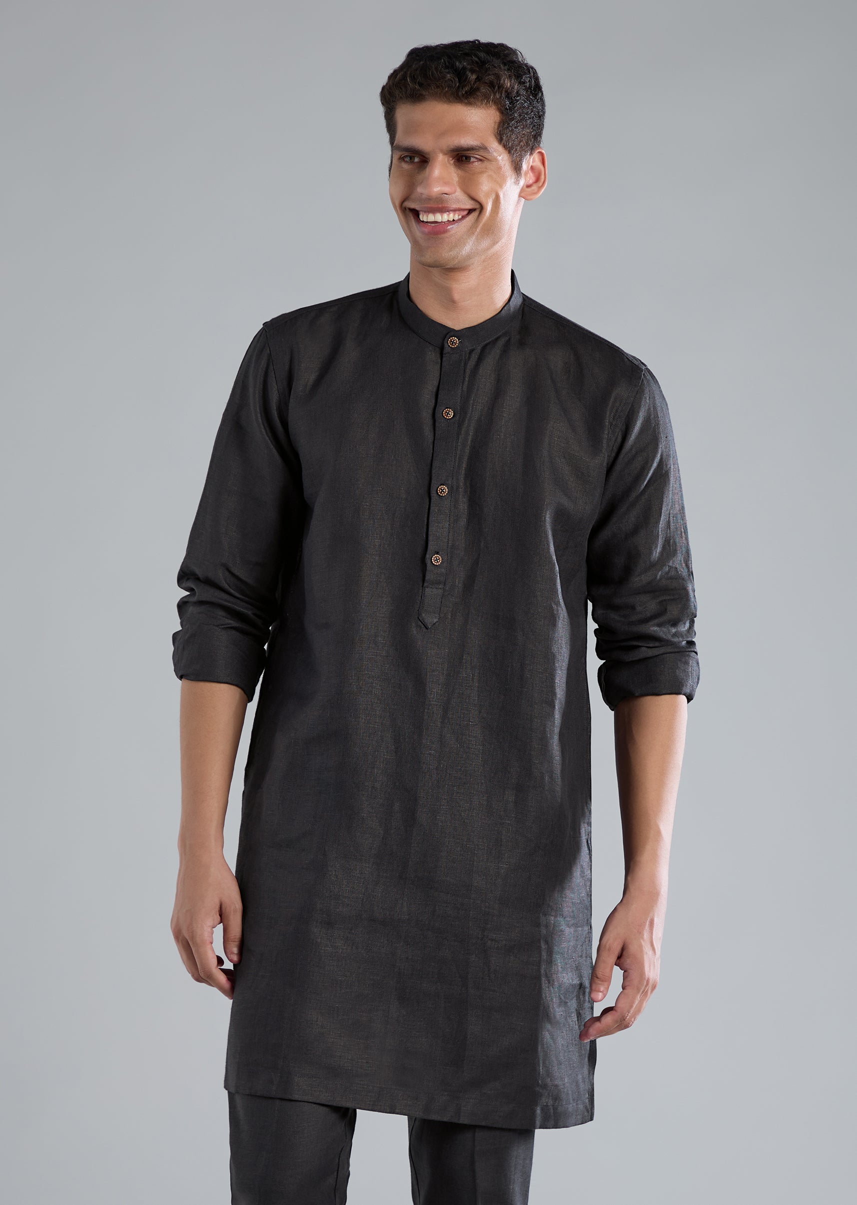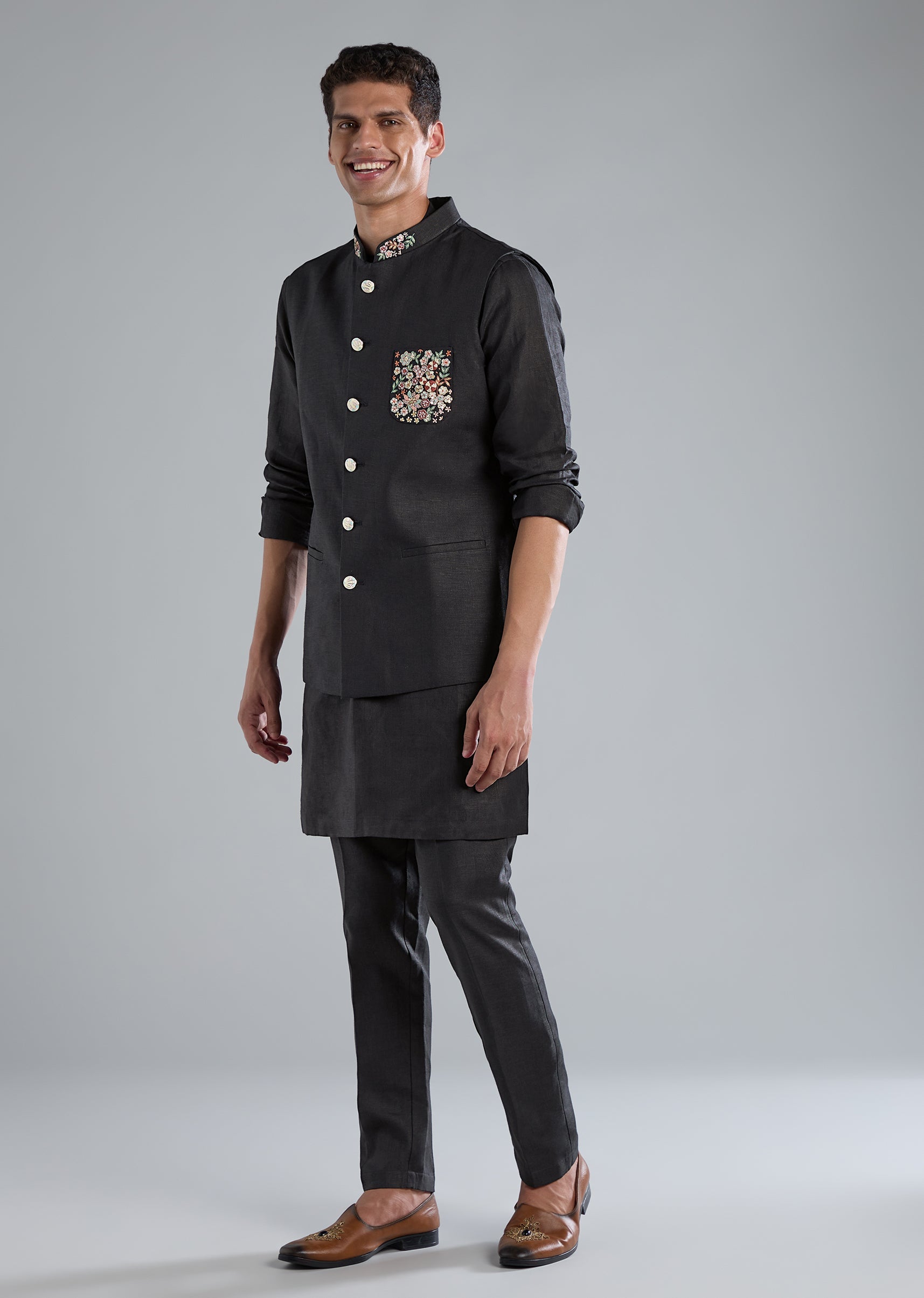 This navy blue kurta jacket set is crafted in breathable linen and highlighted with intricate thread resham work, making it perfect for mehendi and festive celebrations. It features full sleeves, a mandarin collar, a front button top closure, and a secure front hook eye bottom closure. The set includes a jacket, kurta, and pants, designed for a clean and elegant traditional look. Awarded as the Most Trusted Brand, we're delivering styles you love, just as promised.