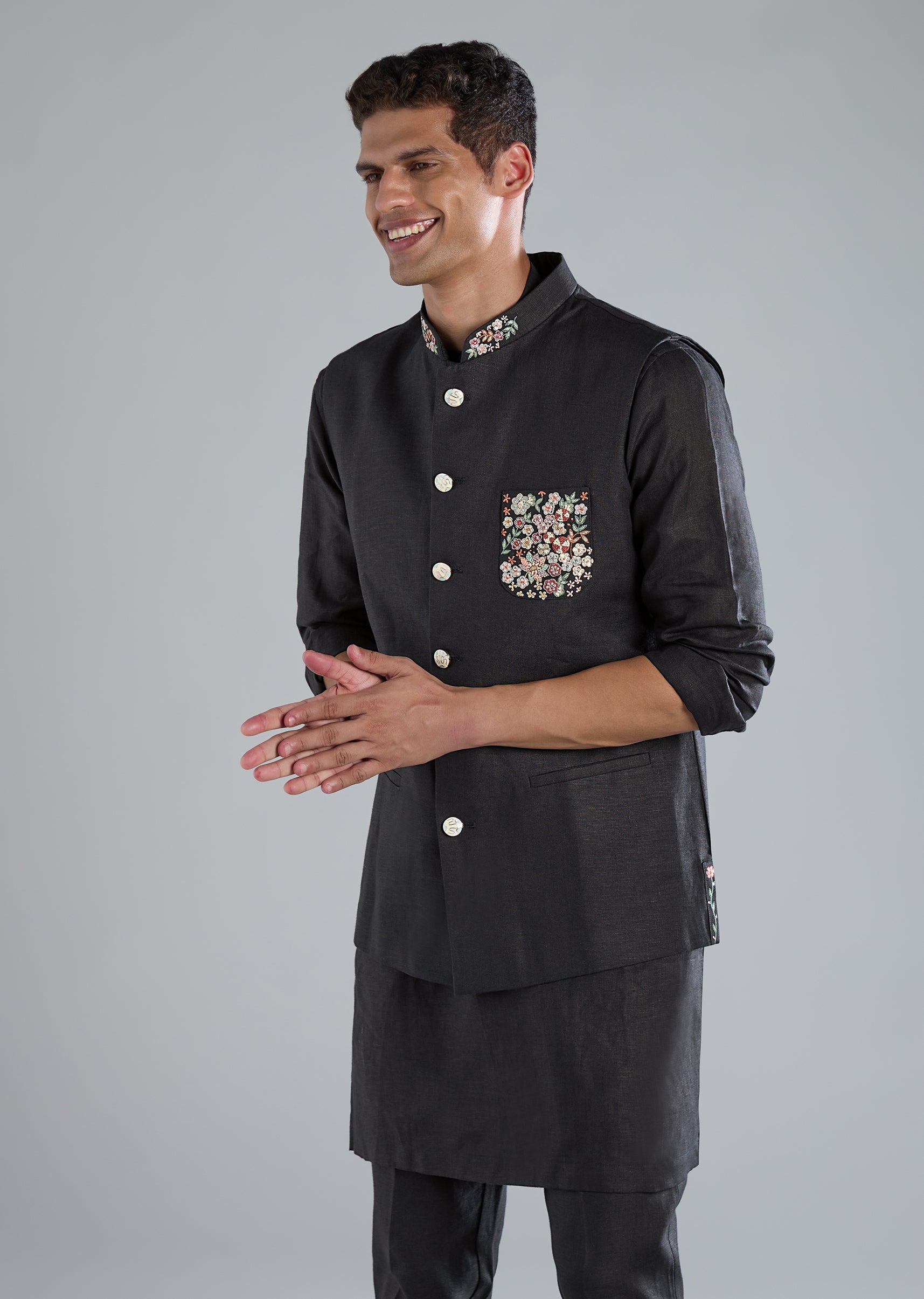 Navy Blue Linen Kurta Jacket Set With Thread Resham Work