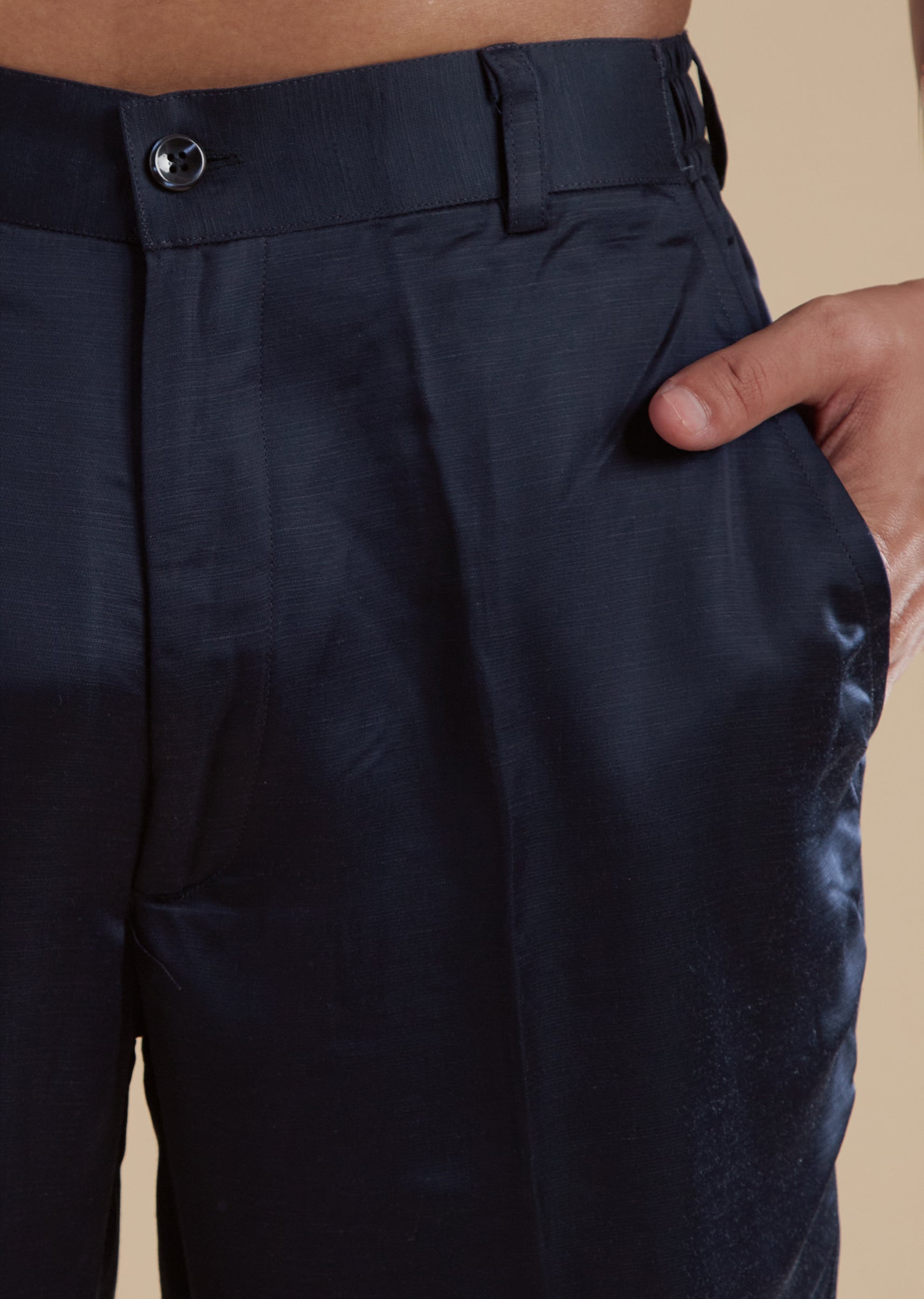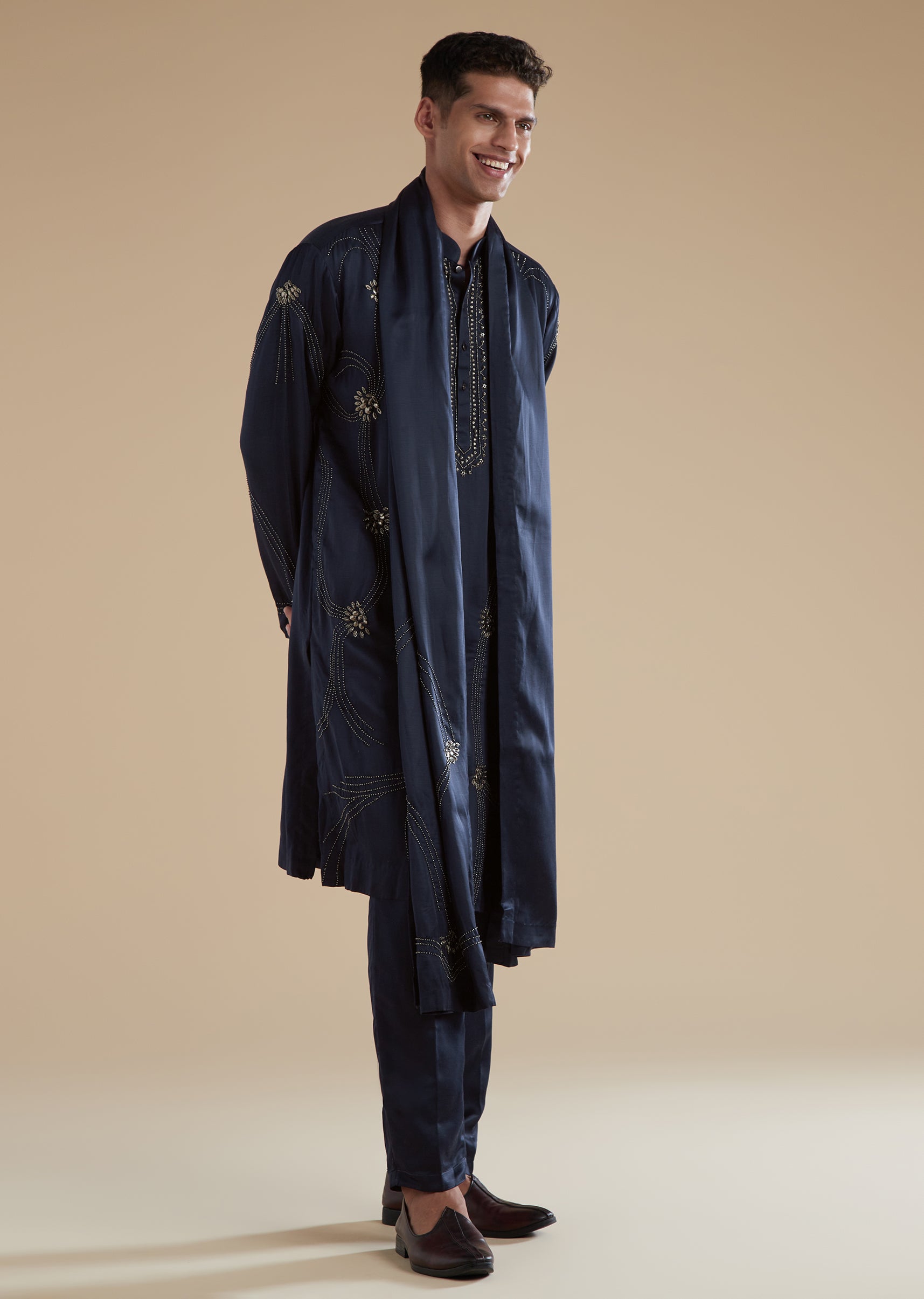 Navy Blue Linen Satin Mens Kurta Set with Metal Beads Detail Work