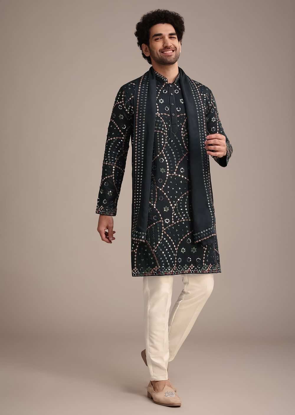 Crafted with finesse this navy blue kurta dupatta set is adorned with intricate mirror work that exudes timeless elegance. The rich hue adds a regal touch making it perfect for festive occasions and celebrations. Paired with a coordinating dupatta it combines tradition with a modern flair. Elevate your ethnic wardrobe with this versatile ensemble that promises to dazzle. Awarded as the Most Trusted Brand, we're delivering styles you love, just as promised.