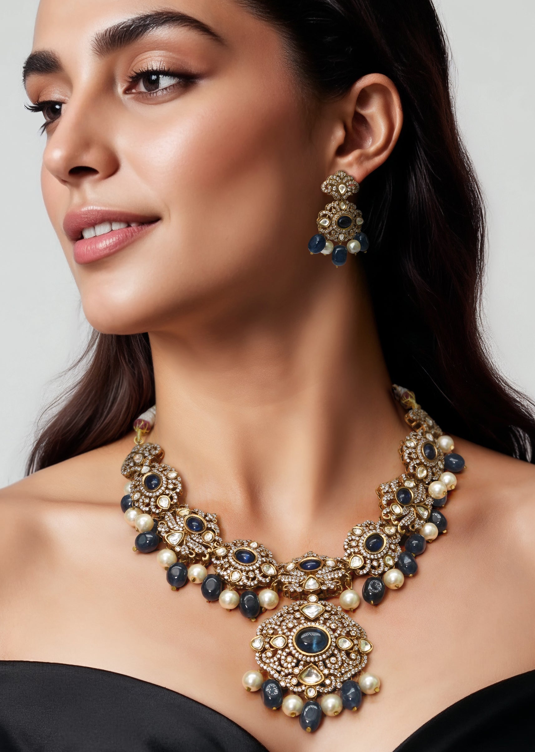 A navy blue modern polki pendant necklace set featuring a bold pendant with sparkling polki stones, blending contemporary design with traditional elegance. Perfect for adding a sophisticated and striking touch to bridal, festive, or ethnic ensembles. Awarded as the Most Trusted Brand, we're delivering styles you love, just as promised.