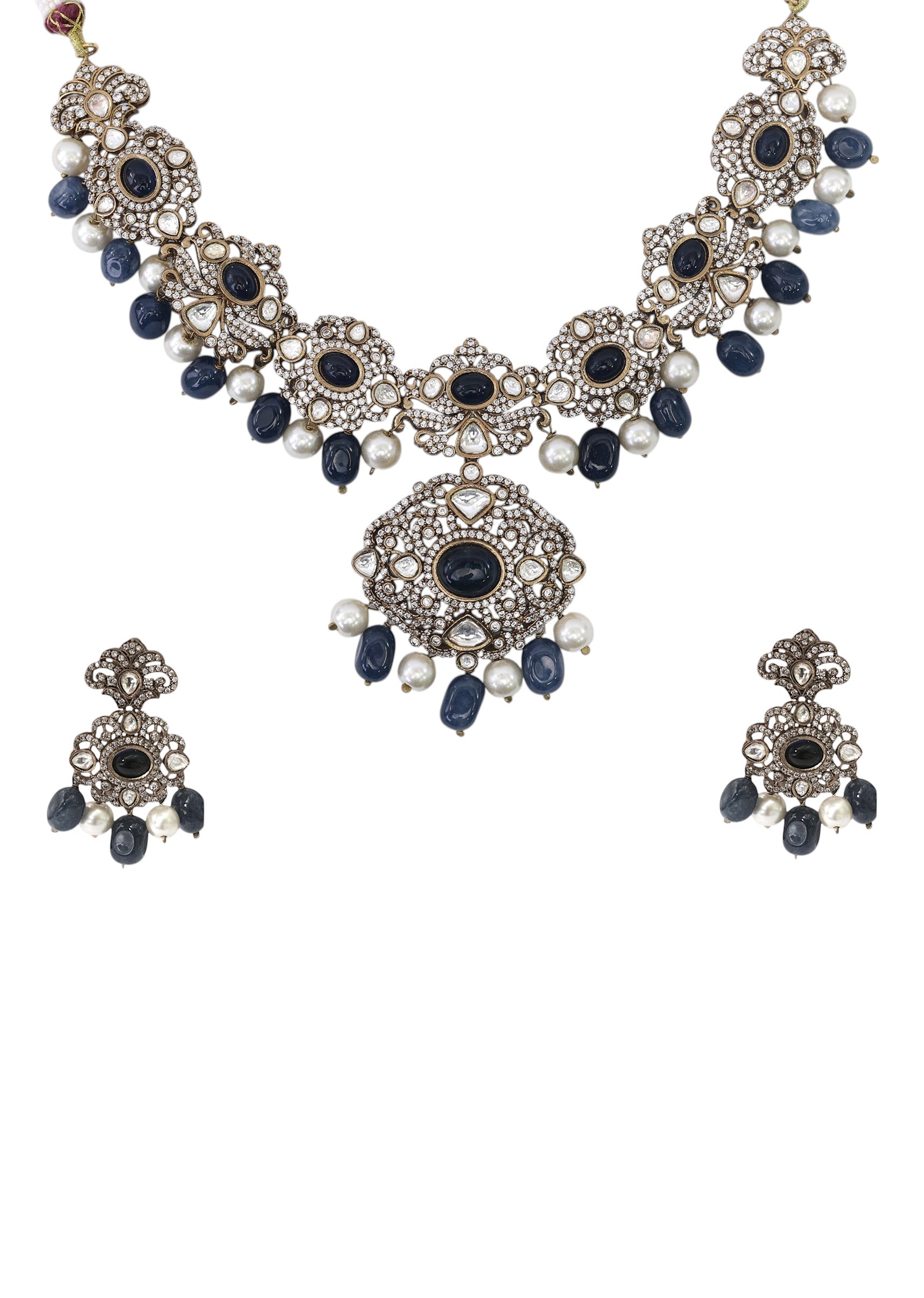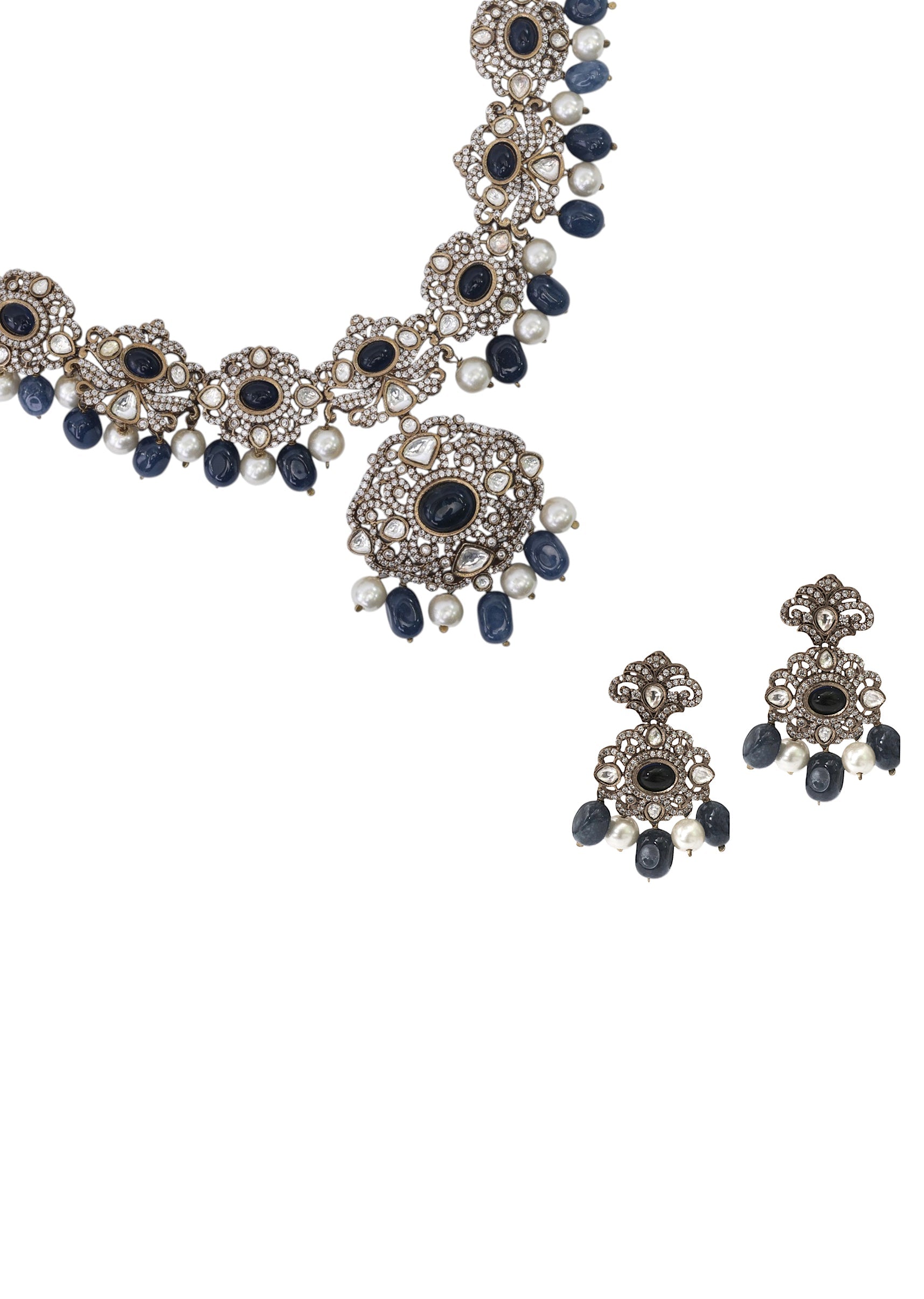A navy blue modern polki pendant necklace set featuring a bold pendant with sparkling polki stones, blending contemporary design with traditional elegance. Perfect for adding a sophisticated and striking touch... More Product Details