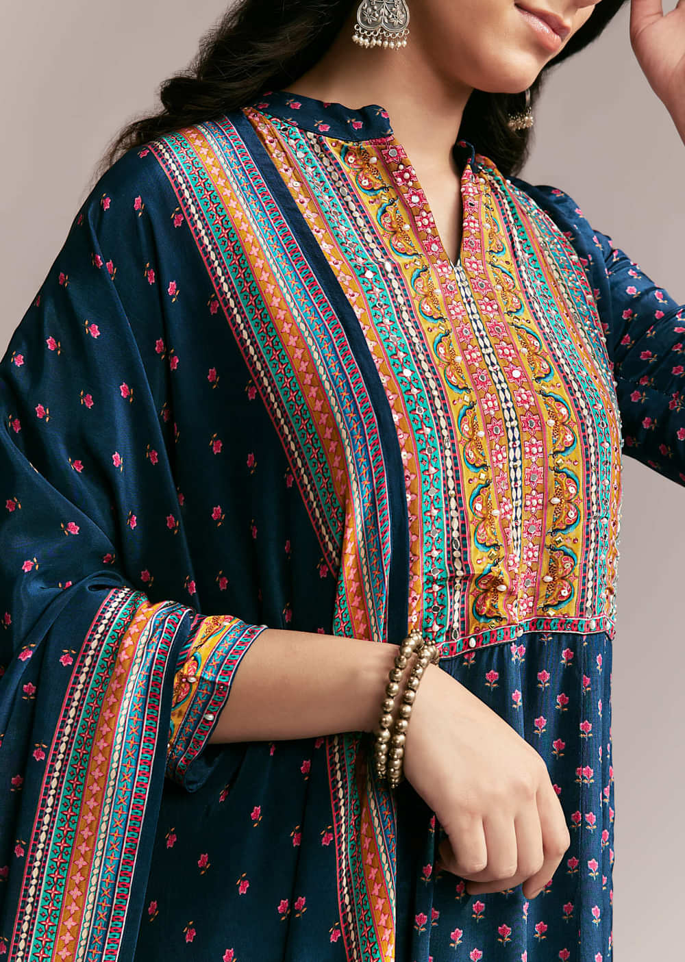 Add a statement watch and open-toe wedges for that Indo-western flair.