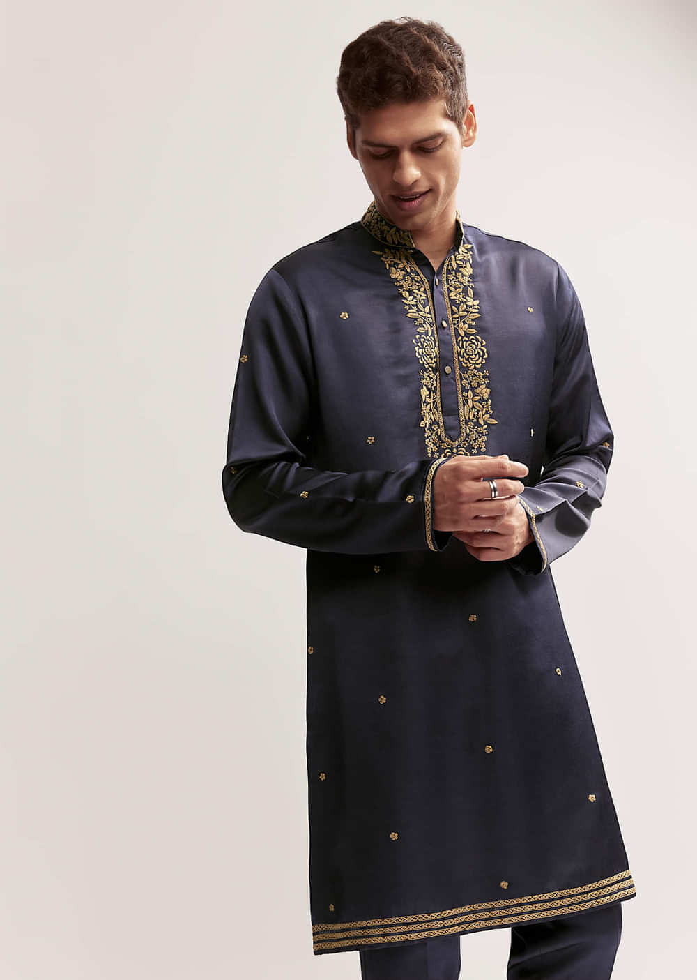 Navy Blue Satin Blend Kurta Set For Men With Zardosi Work