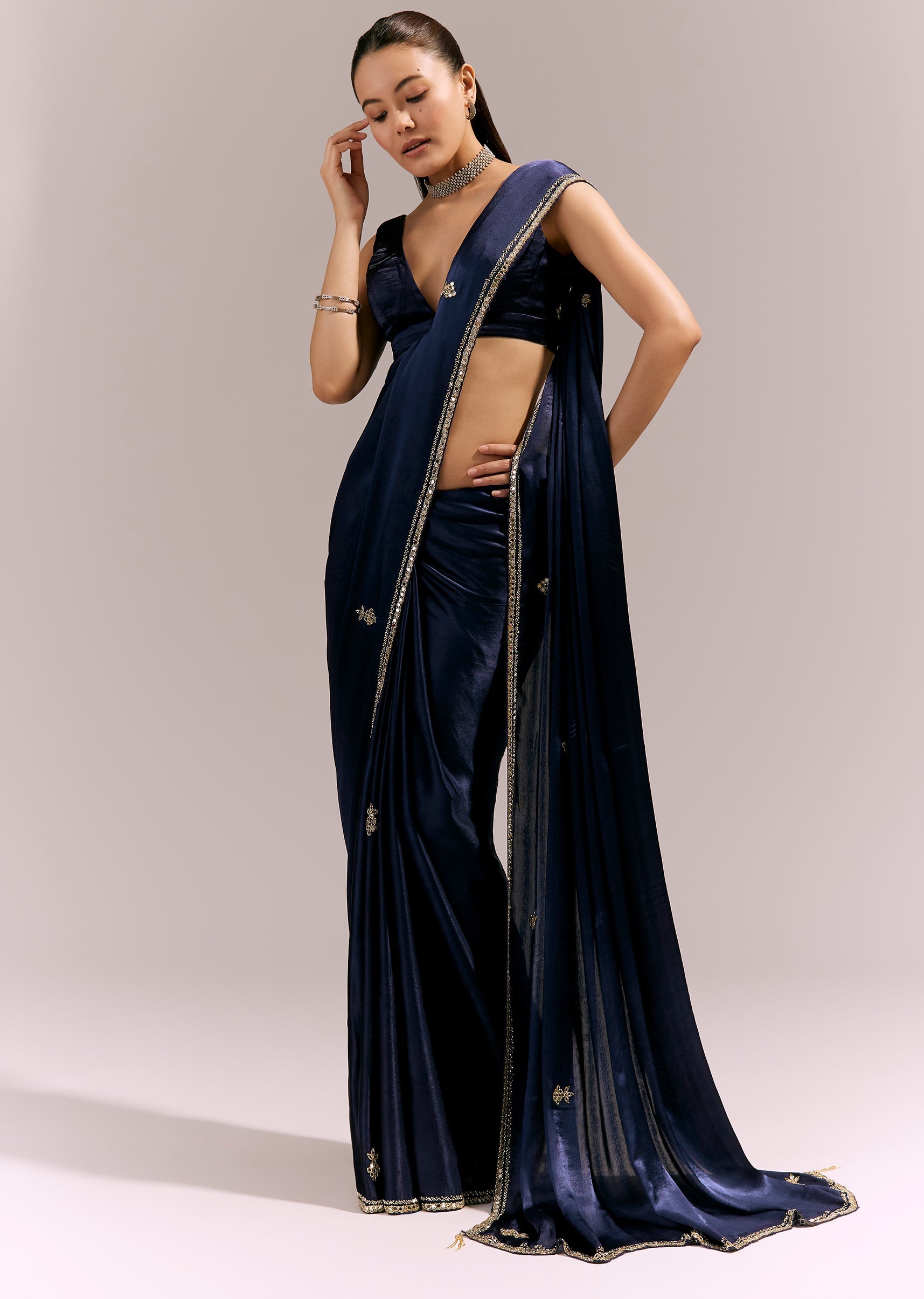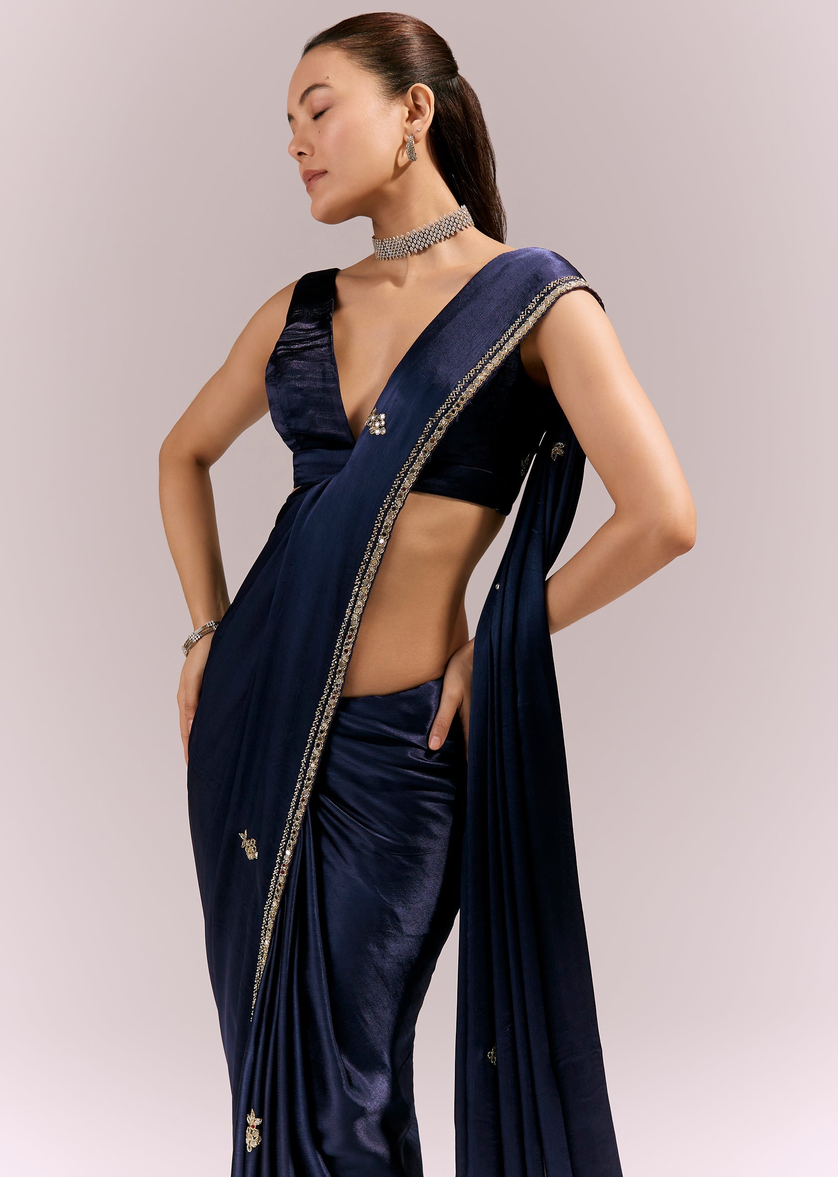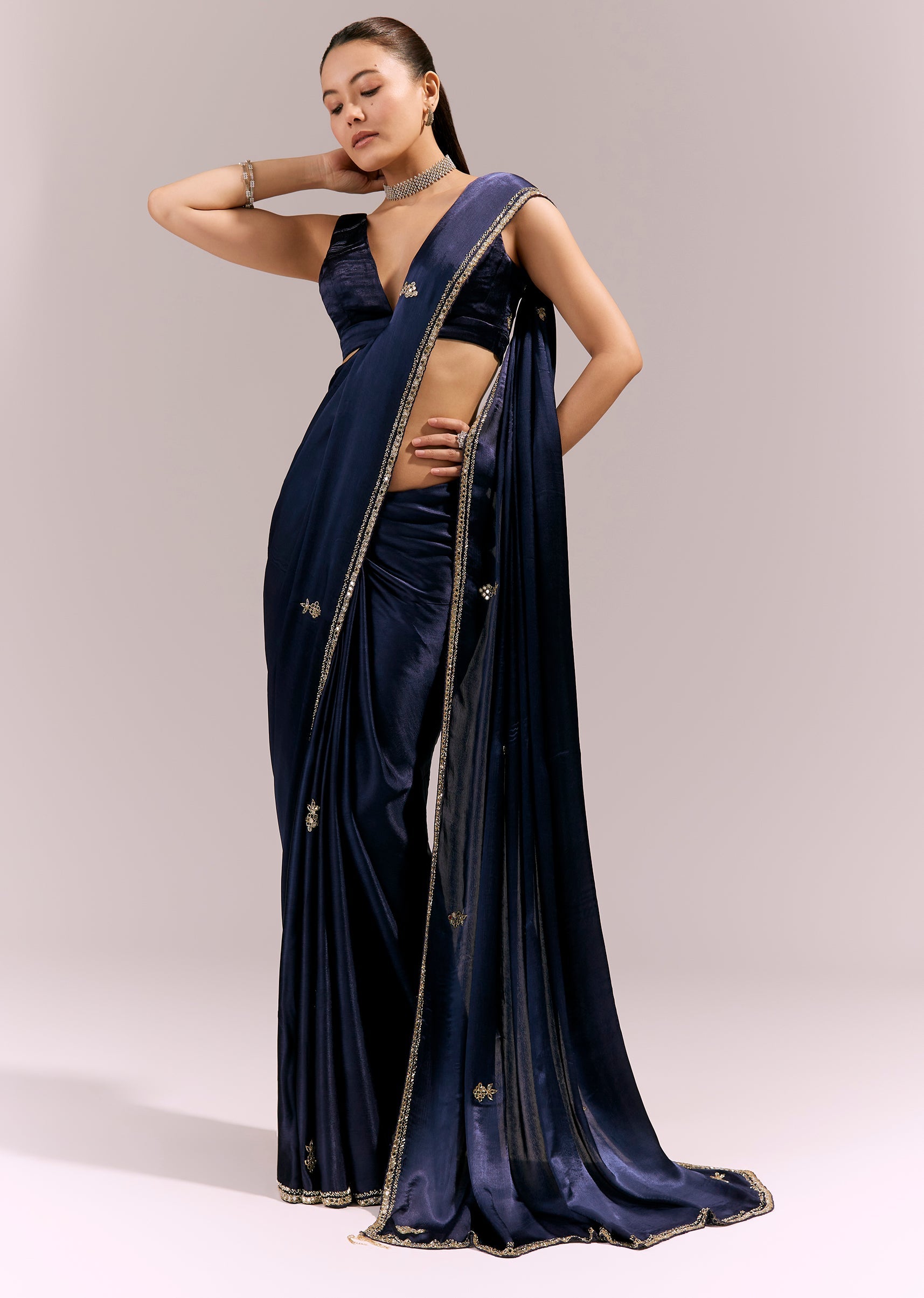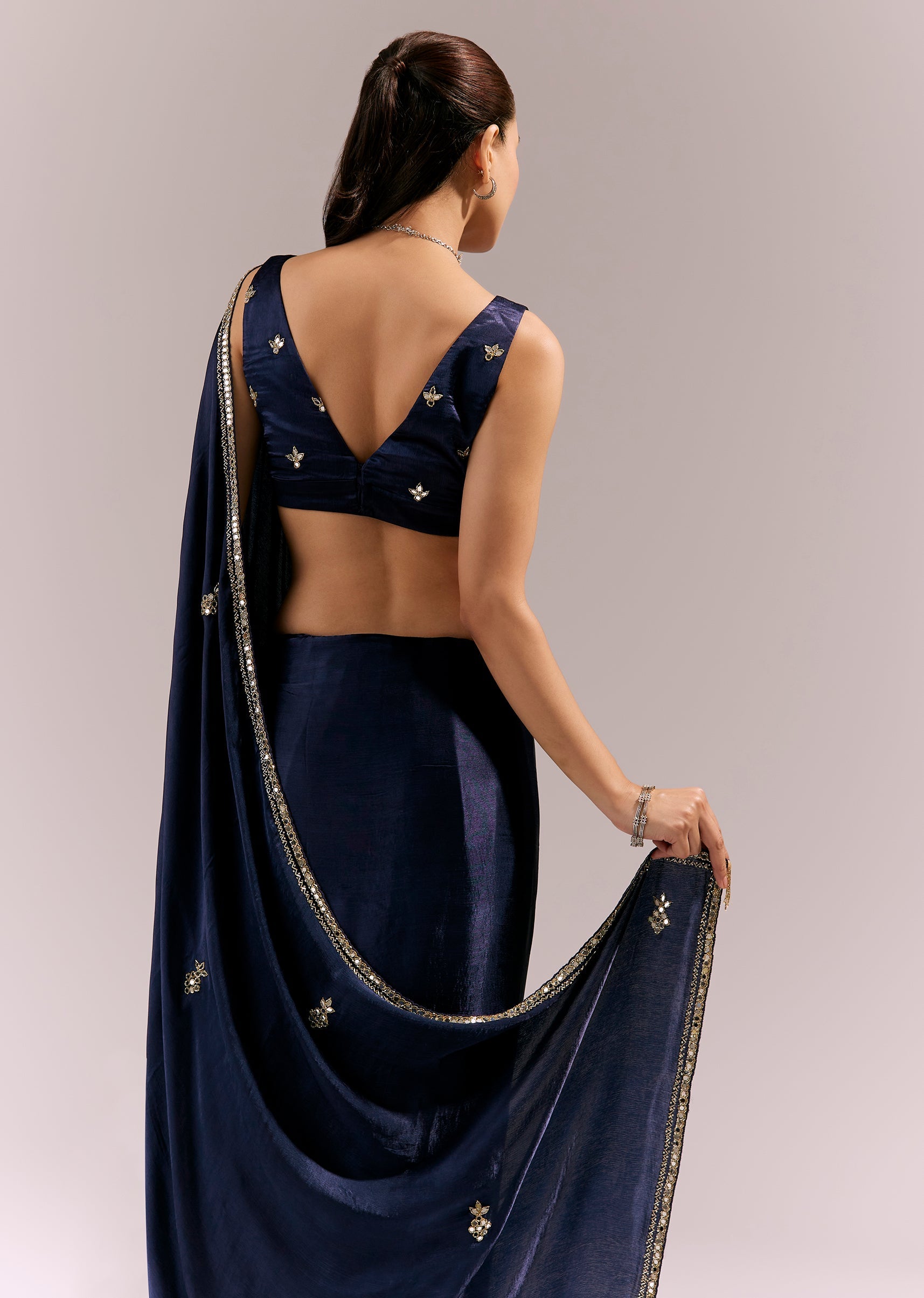 Elegant and striking, this vy blue satin chinon saree features an embroidered border and buttis detailed with cutda, beads, and mirror work. The reflective accents add a festive sparkle while keeping the look refined. Ideal for festive evenings and celebratory gatherings. Awarded as the Most Trusted Brand, we're delivering styles you love, just as promised.