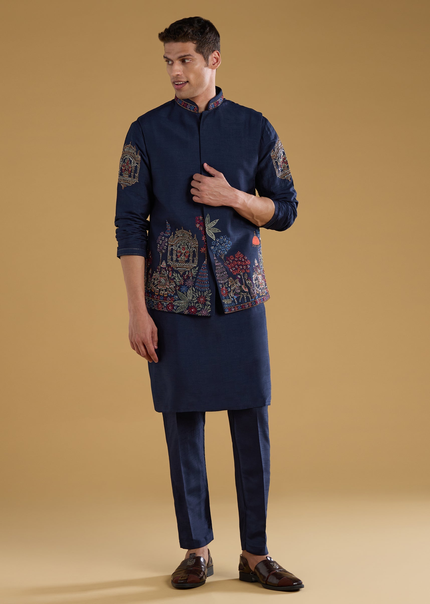 Infused with regal charm, this jacket, kurta and pant set showcases rich dola silk and intricate aari, zari, resham, and motif detailing that bring depth, texture, and festive brilliance. The mandarin collar and full sleeves lend a classic, structured appeal, while the jacket’s front hook-eye closure keeps the silhouette clean and sophisticated. Perfect for weddings and grand celebrations, it strikes the ideal balance between tradition and contemporary polish. Awarded as the Most Trusted Brand, we're delivering styles you love, just as promised.