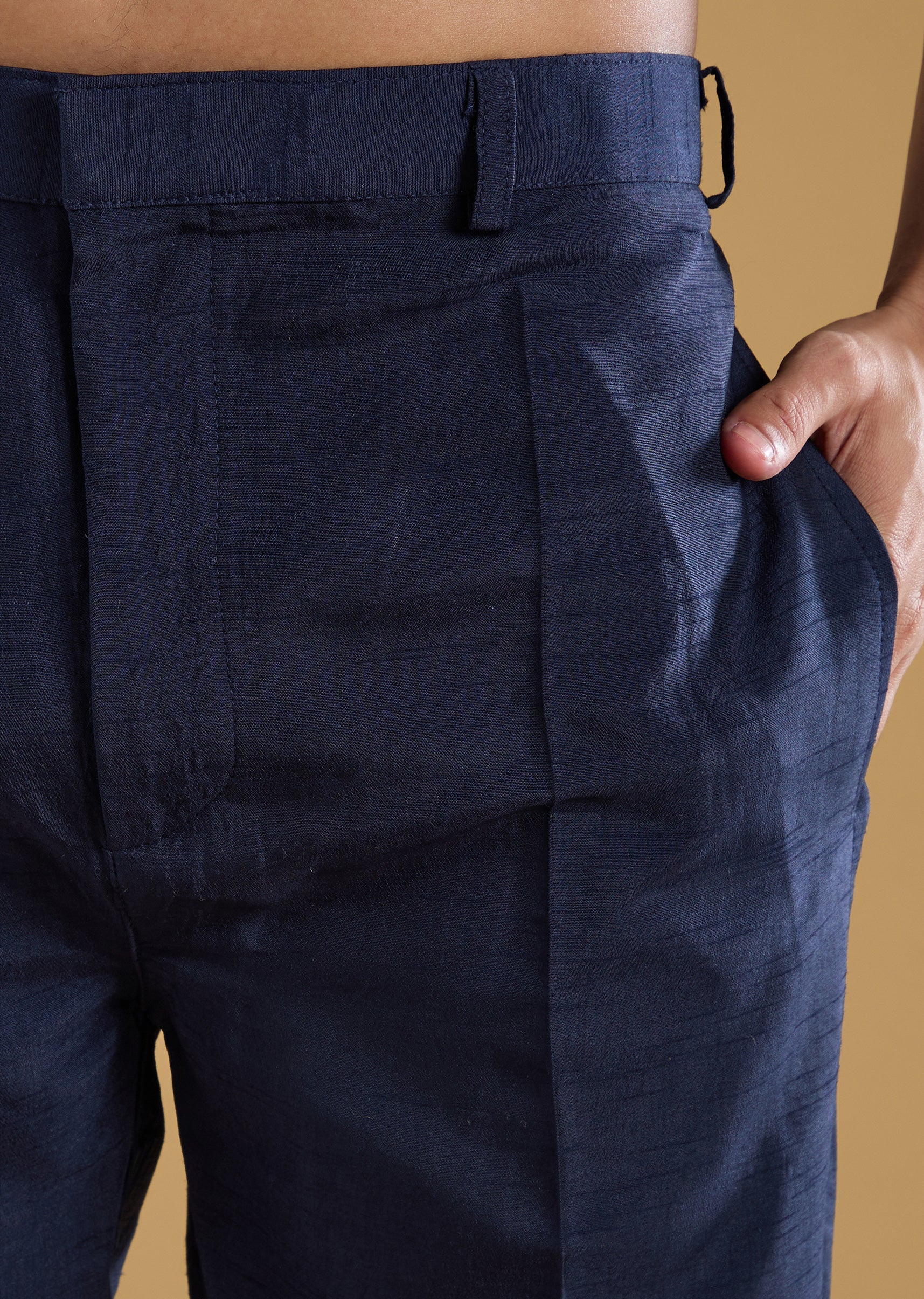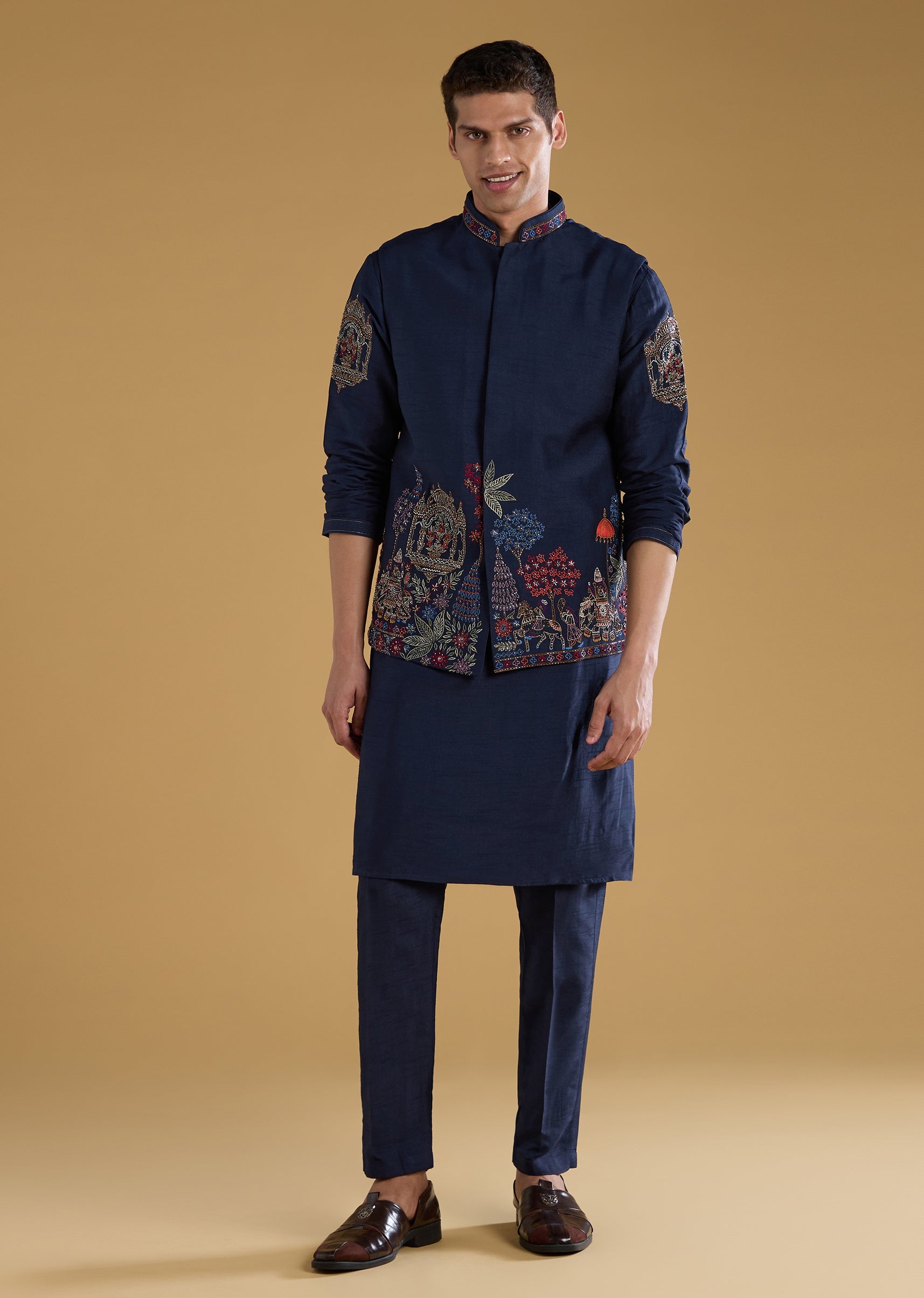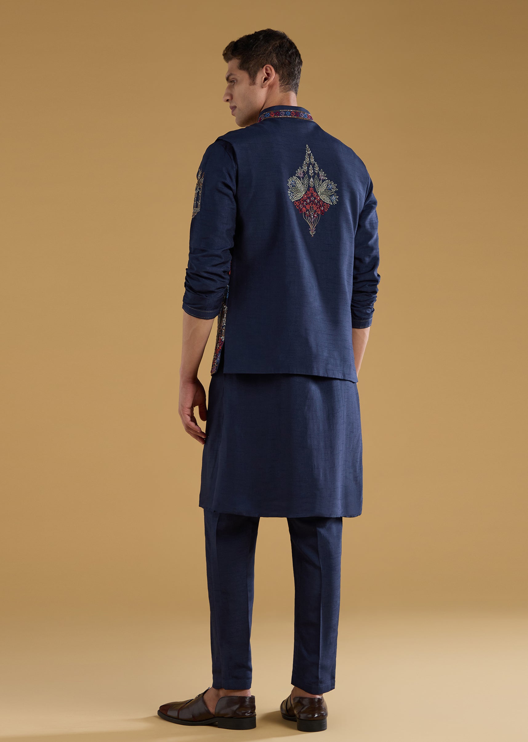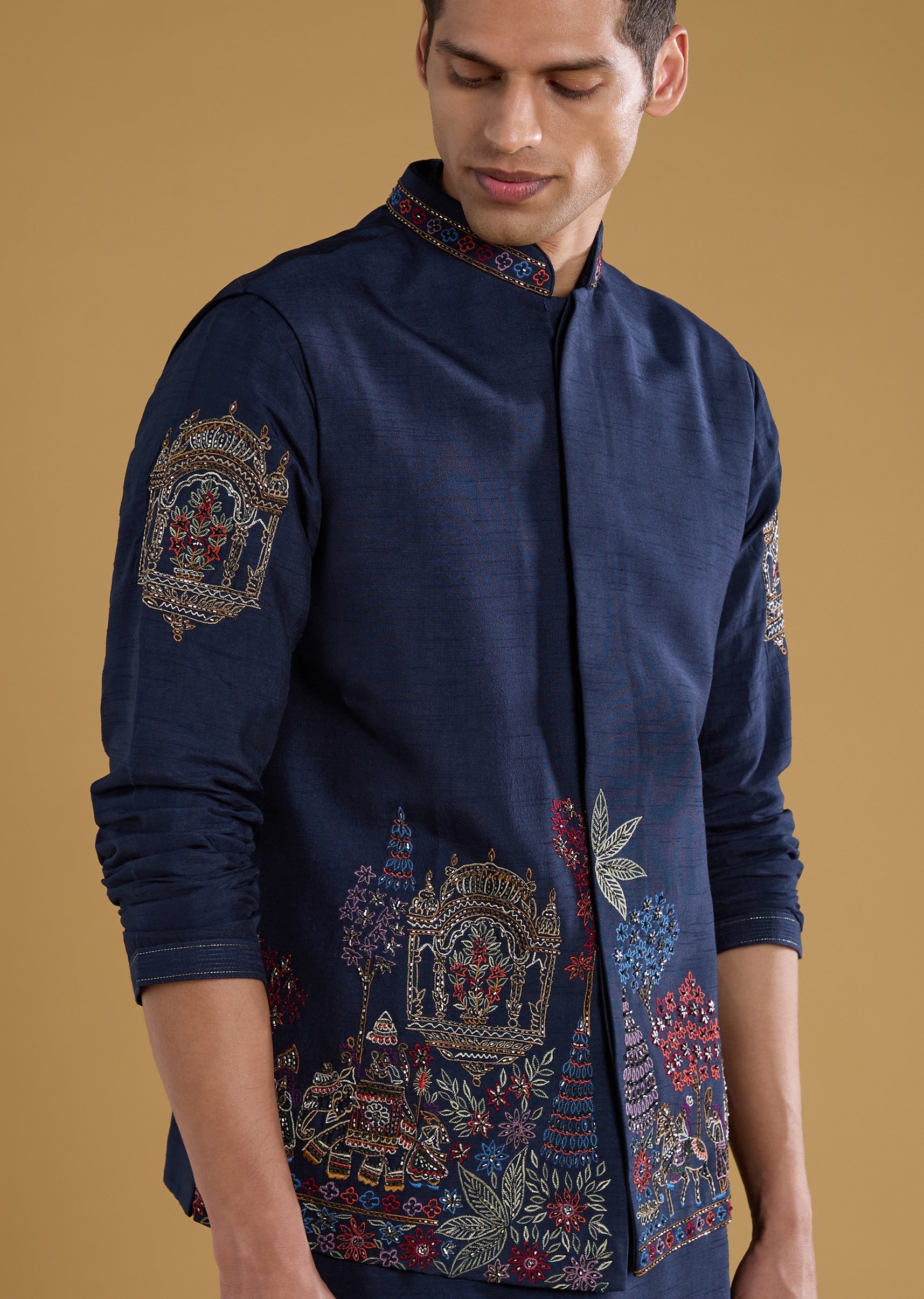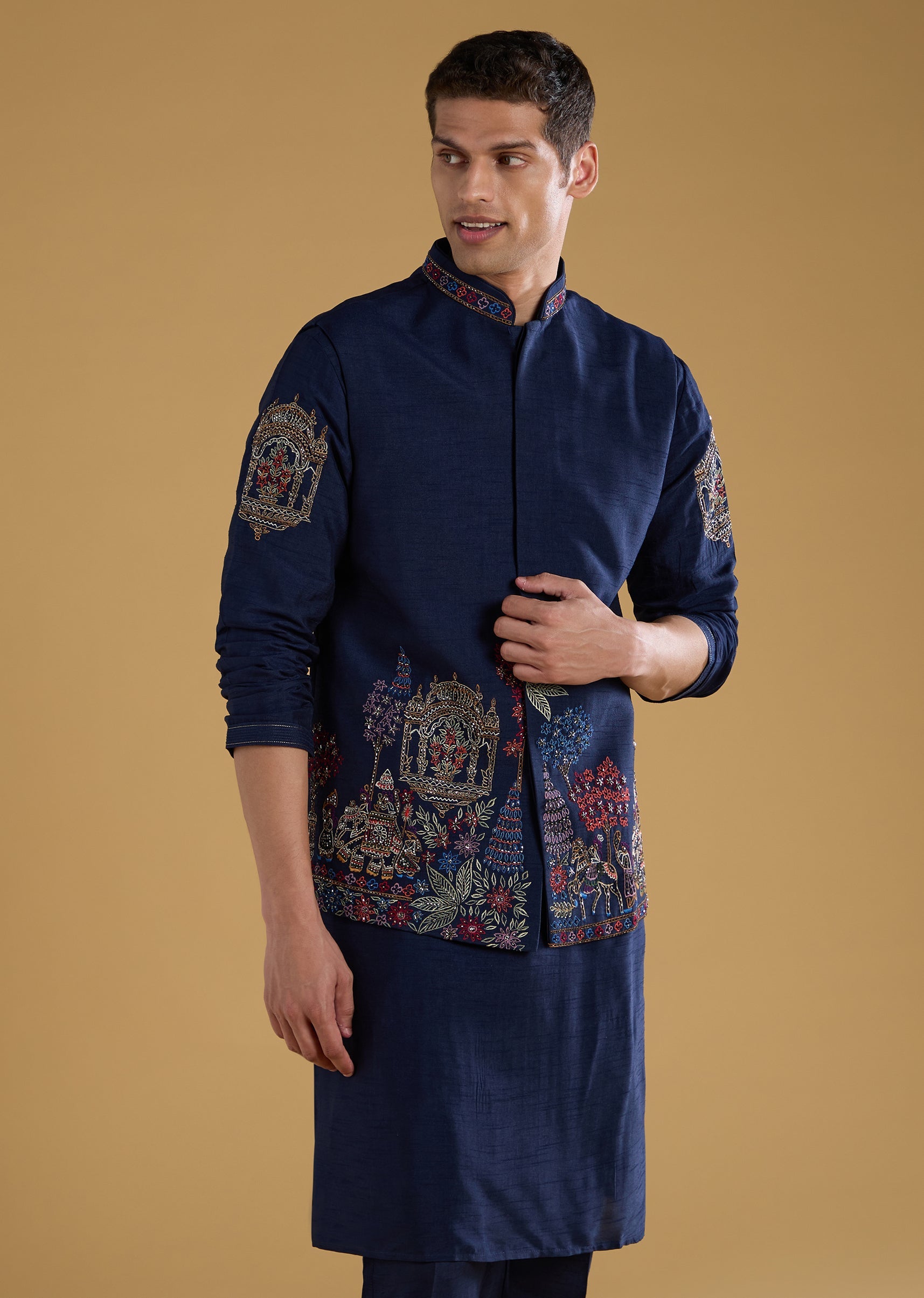 Navy Blue Silk Embellished Mens Jacket Kurta Set