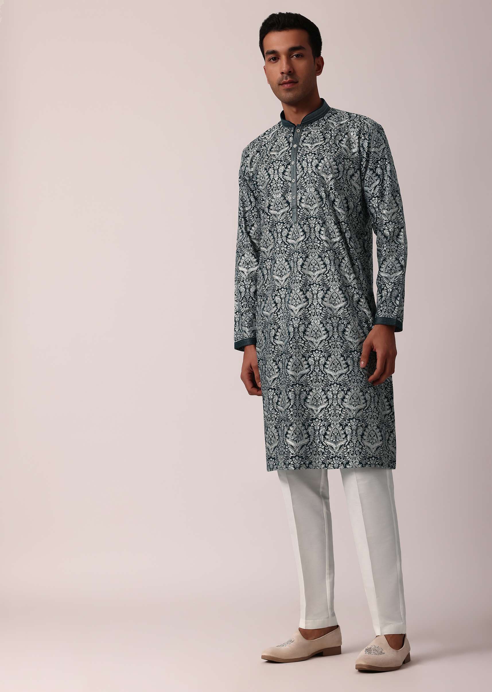 Elevate your festive style with our Navy Blue Silk Kurta Set. It features intricate self-work fabric. This ensemble includes a full-sleeves kurta with a mandarin collar and coordinating bottom. The... More Product Details