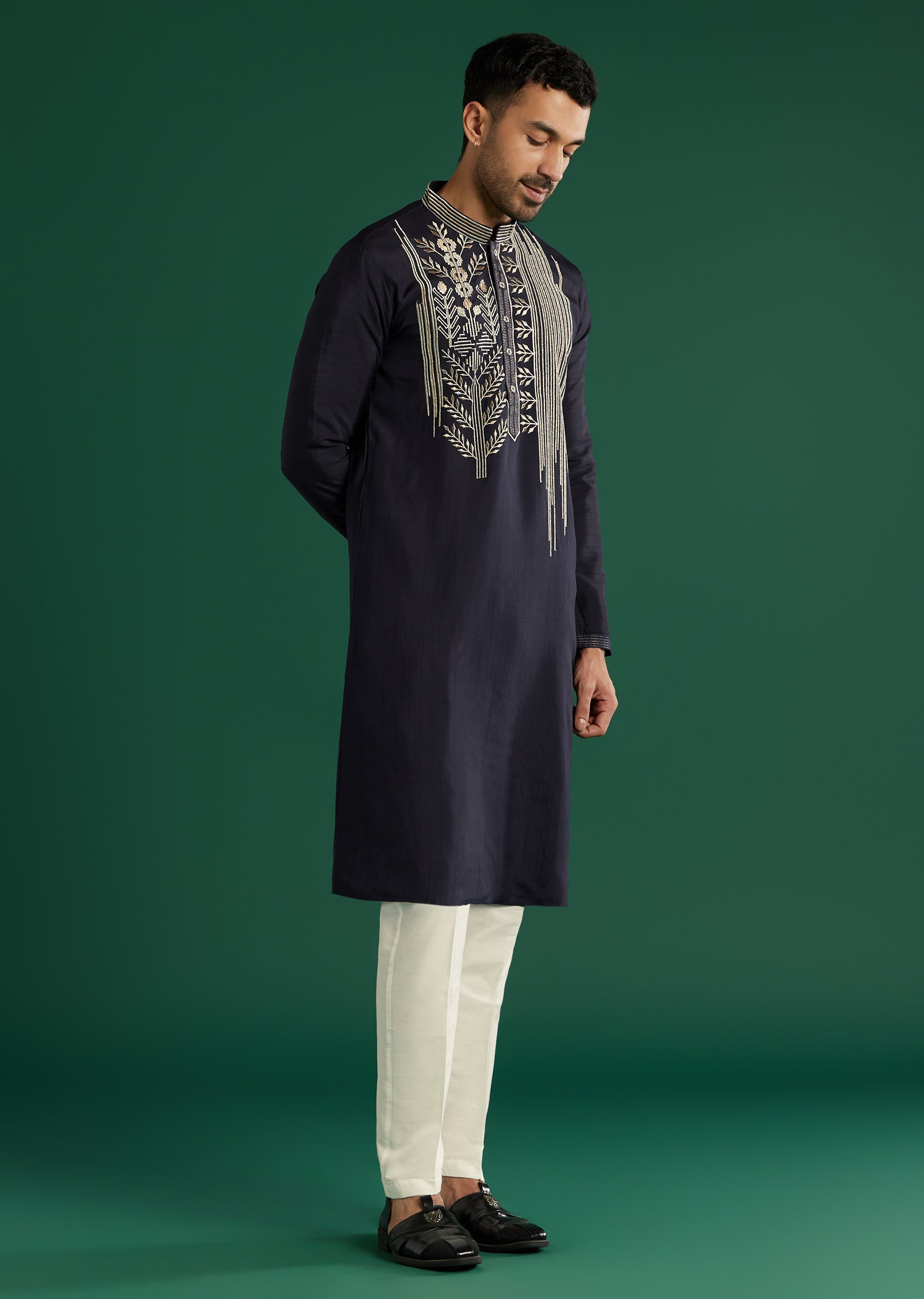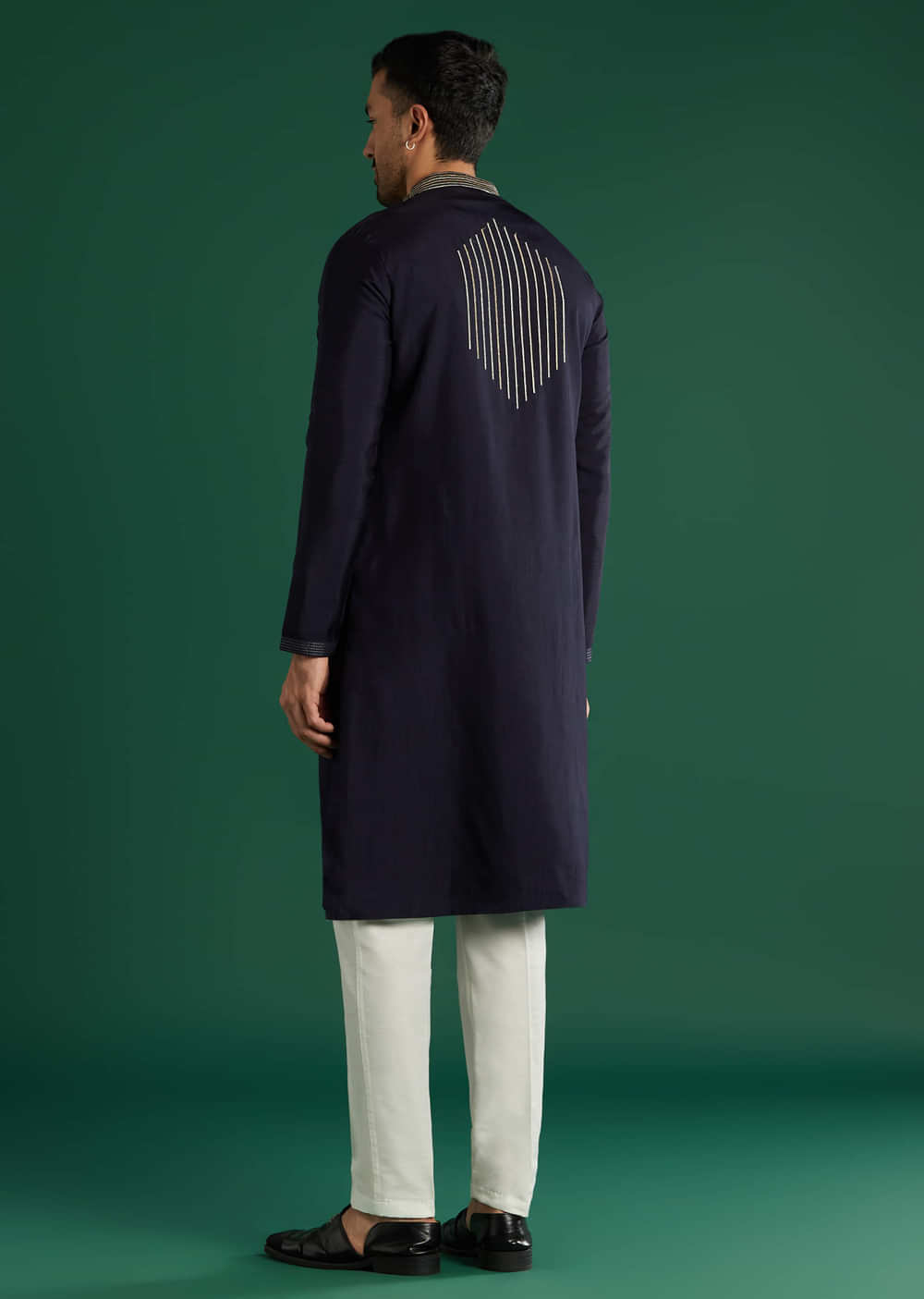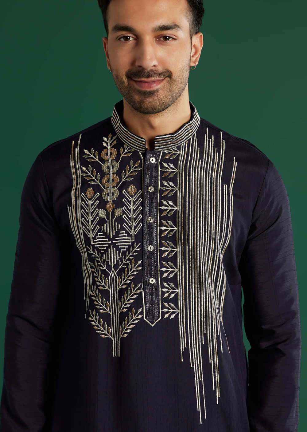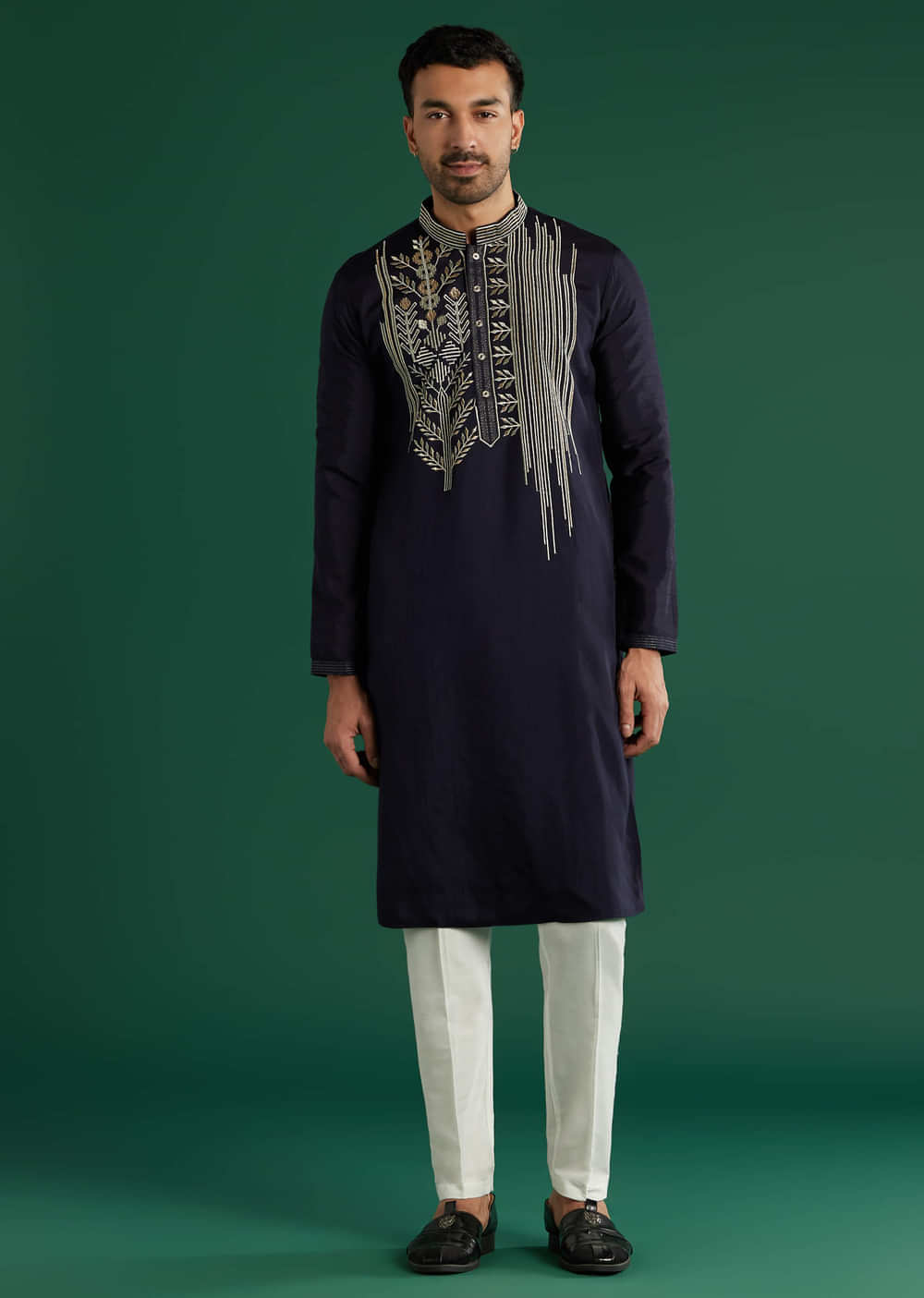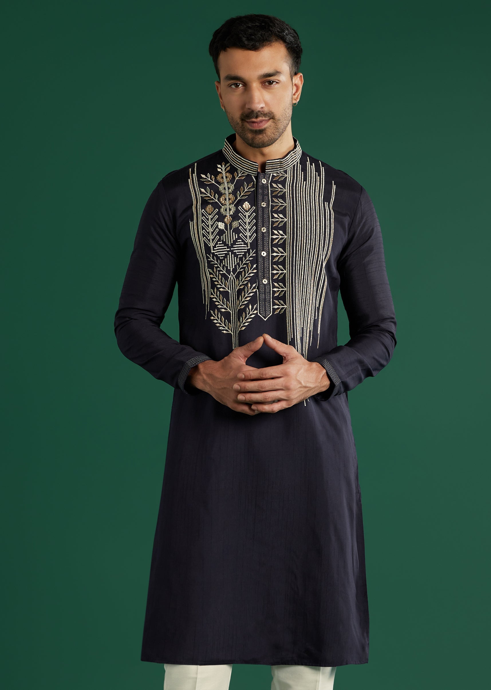 Navy Blue Silk Kurta Set For Men With Gota Work