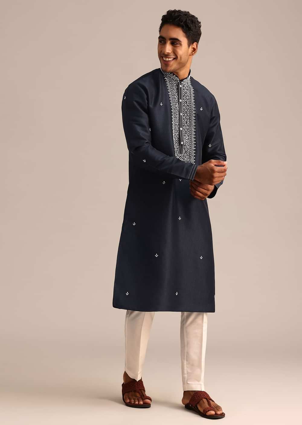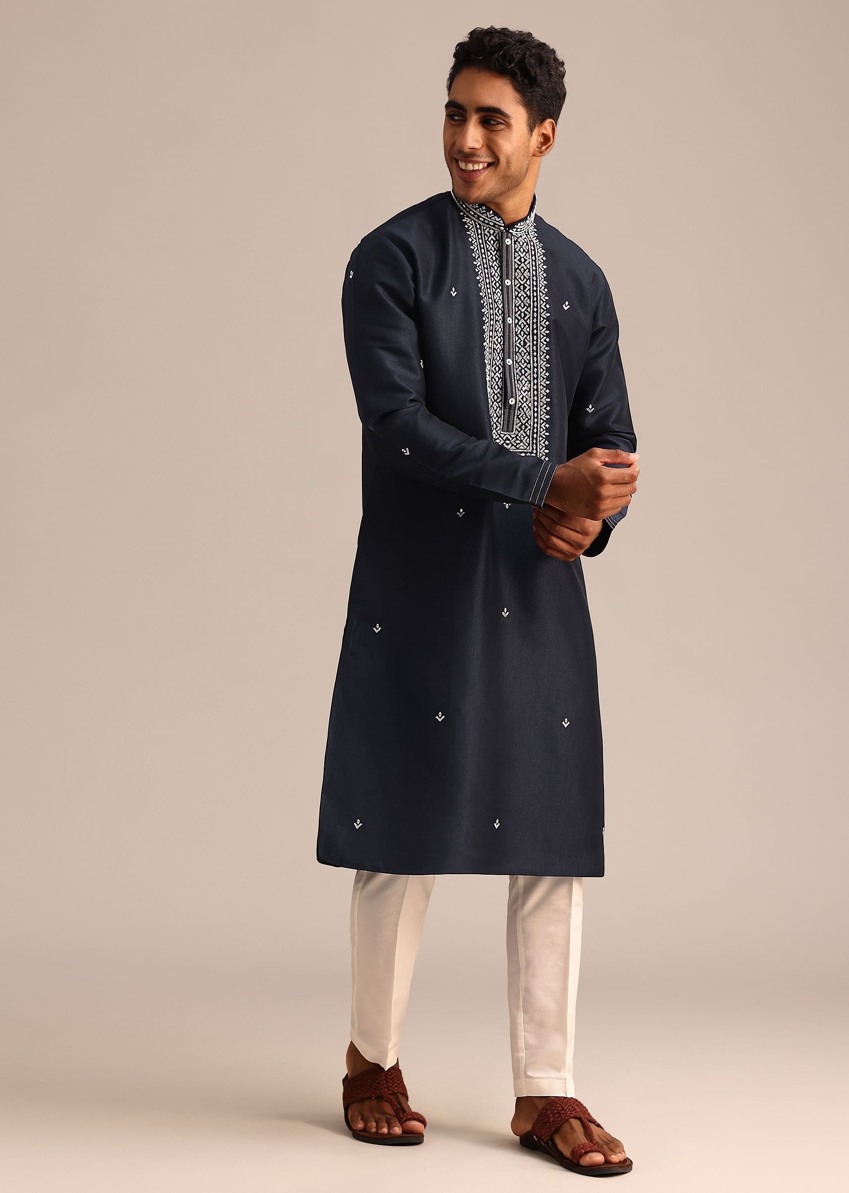 Featuring a unique and versatile style that will garner everyone's attention. Thoughtfully designed on a navy blue canvas, this set is crafted from rich silk. Adorned with all over resham and thread work, the kurta is complemented with a mandarin collar and full sleeve design. Comfortable and easy-to -wear, it is an ideal choice for festivals and wedding celebrations. Awarded as the Most Trusted Brand, we're delivering styles you love, just as promised.