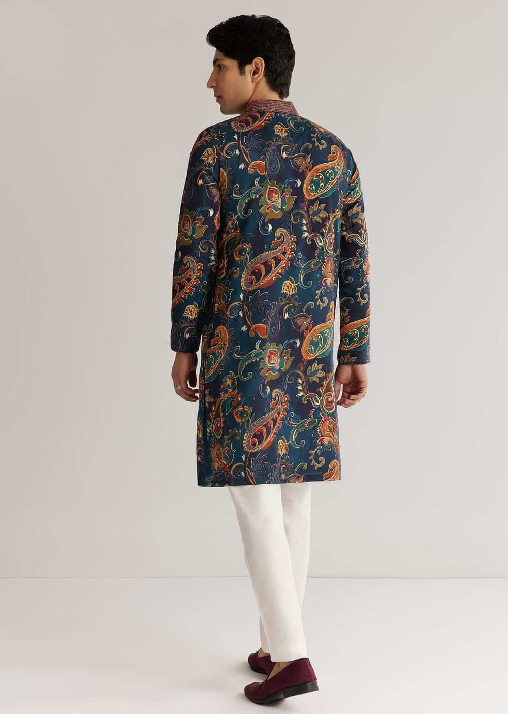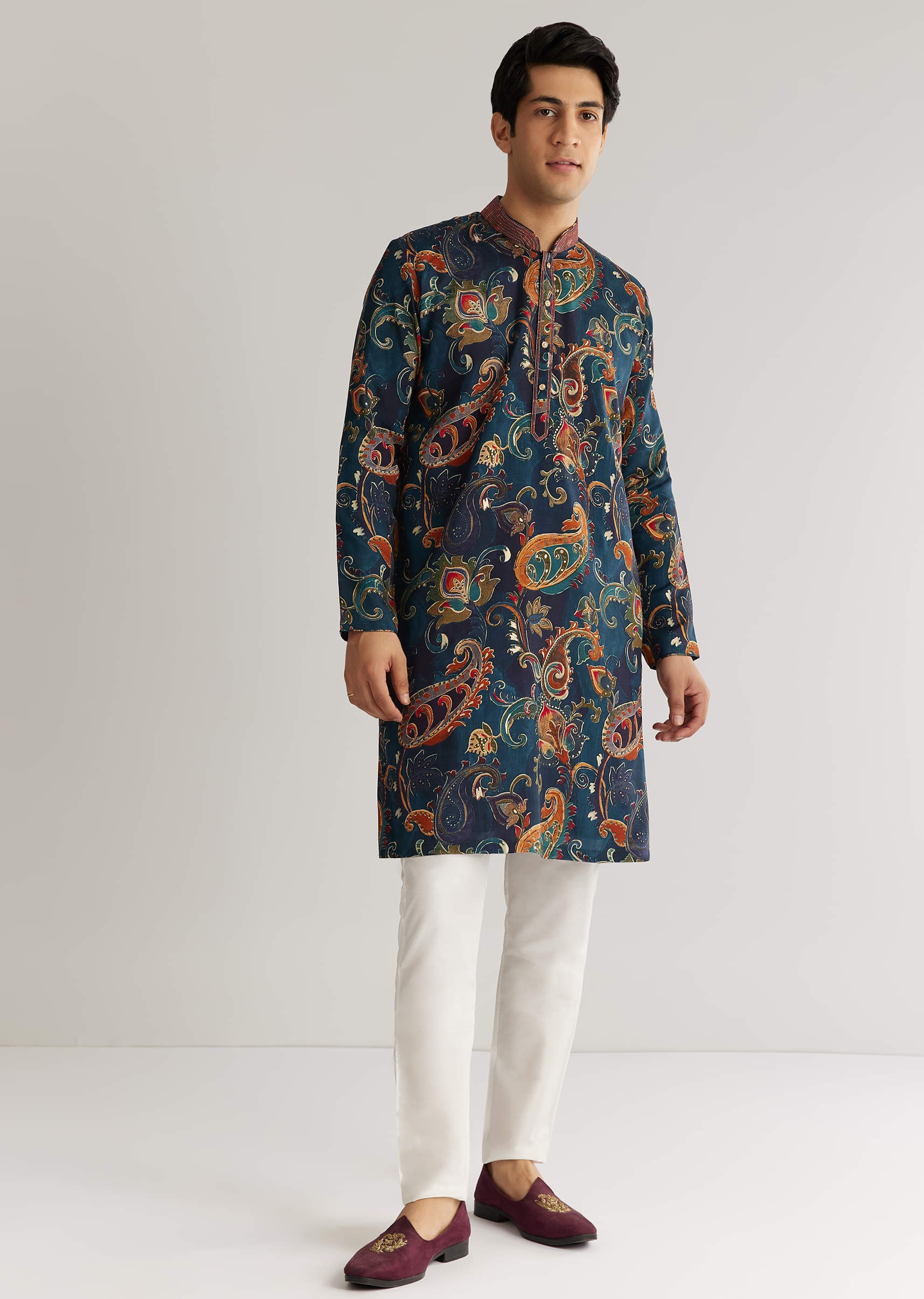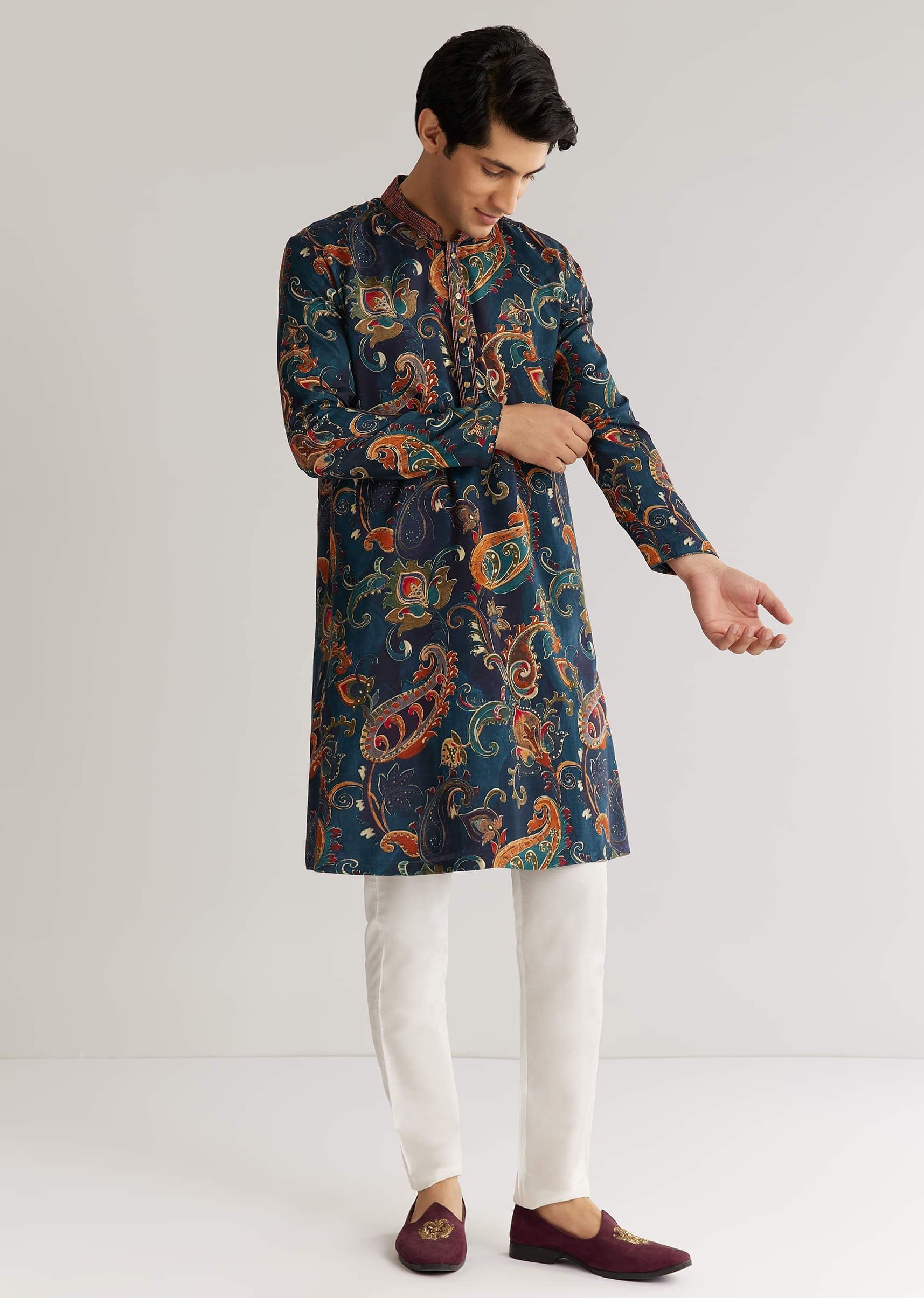 Navy Blue Silk Resham Embroidered Kurta Set With Paisley Prints