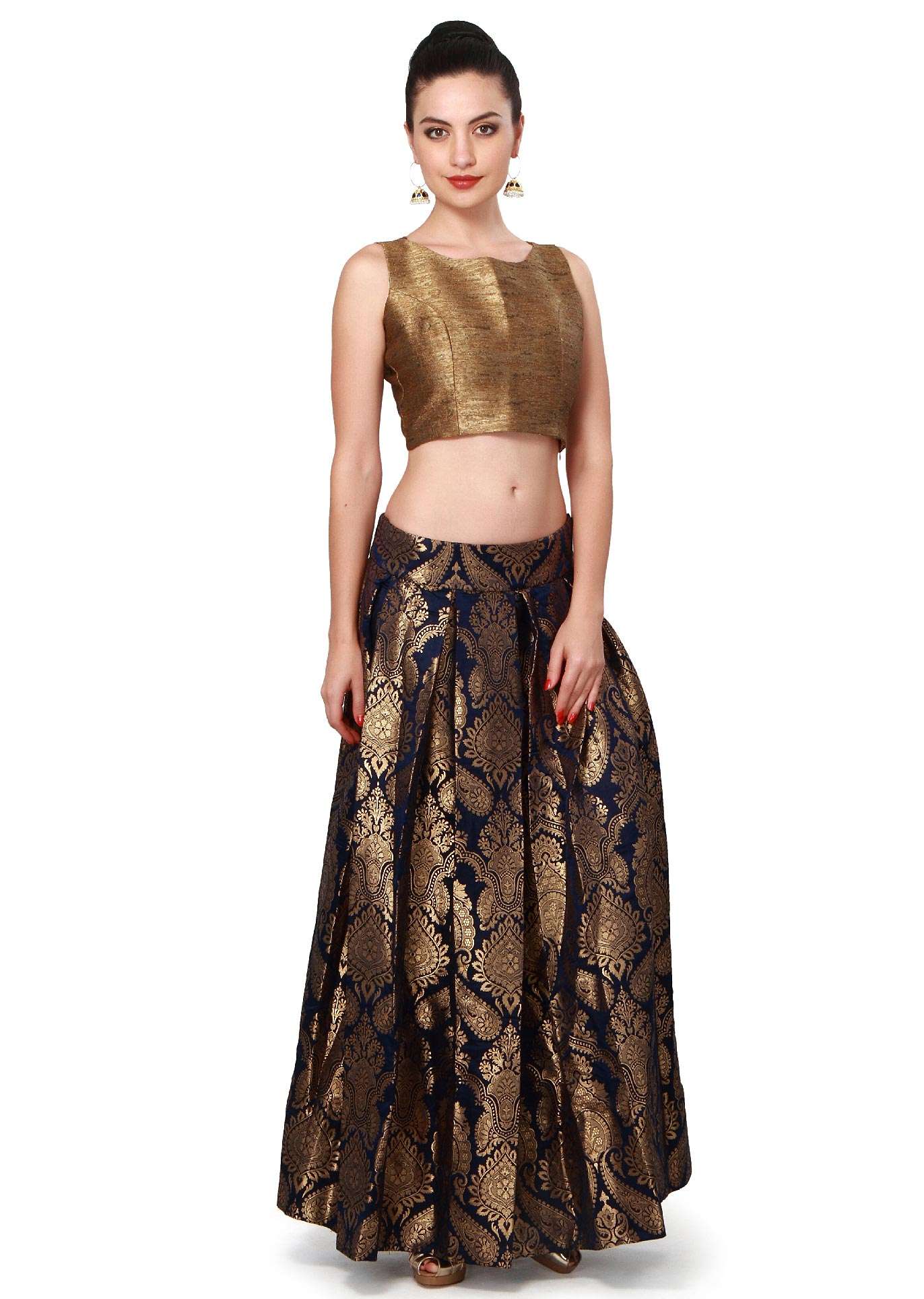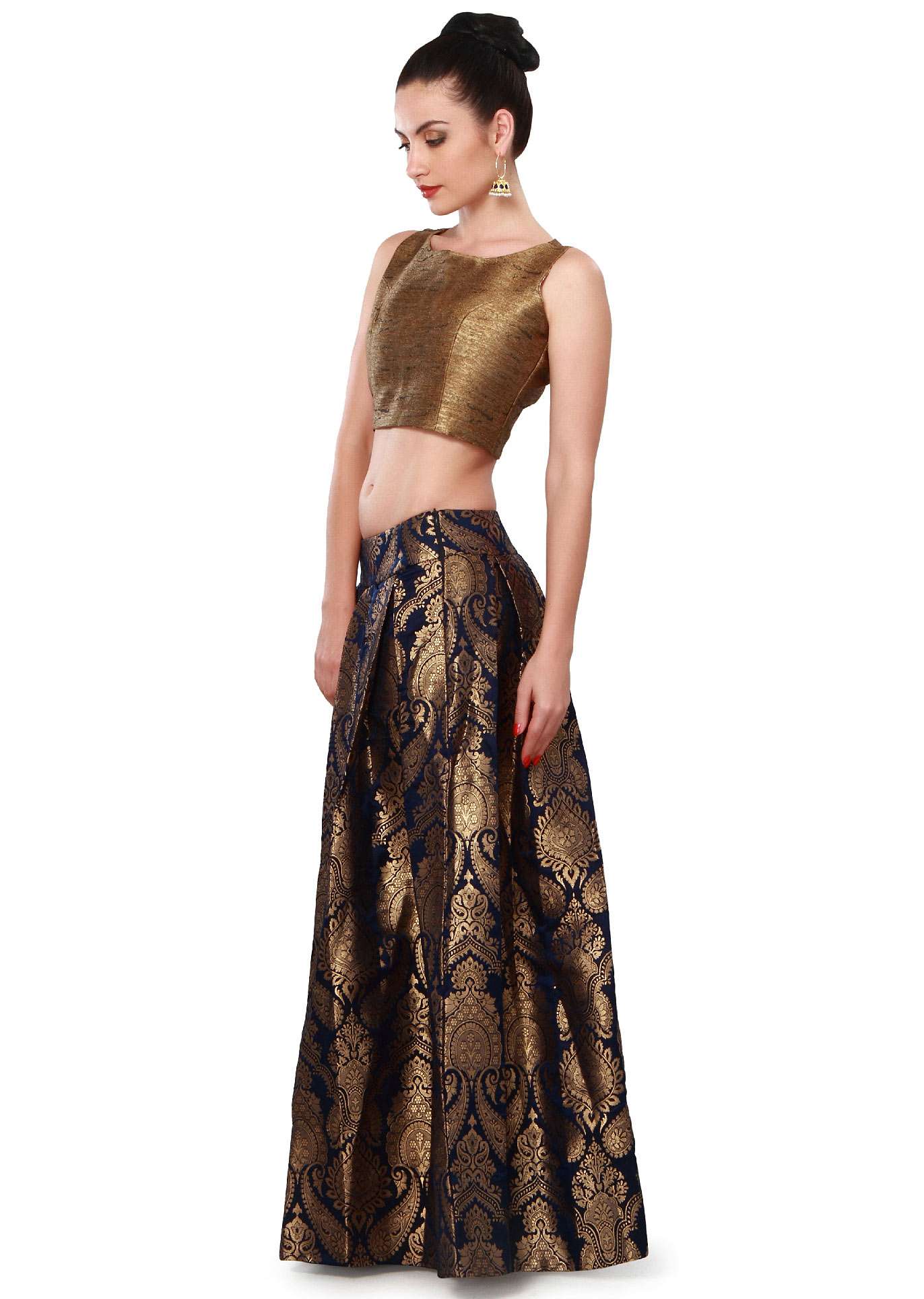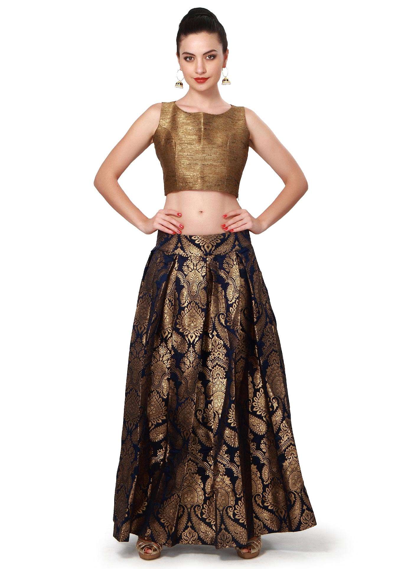 Navy blue skirt featuring in brocade. Matched with Gold lurex crop top blouse. Awarded As The Most Trusted Brand We'Re Delivering Styles You Love Just As Promised.