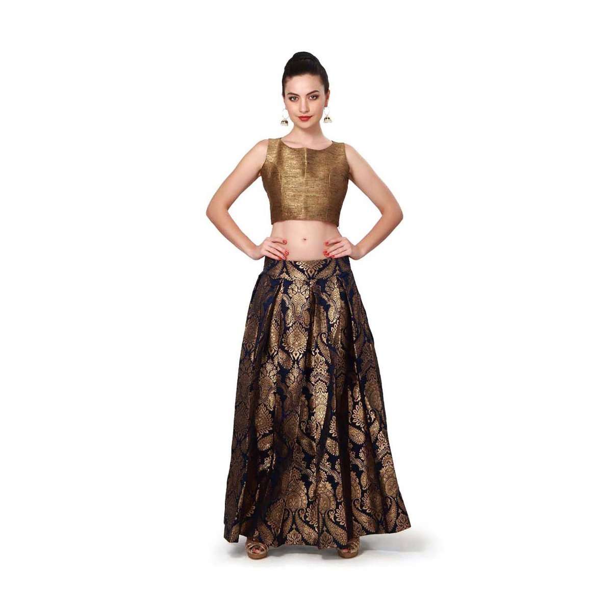More Product DetailsNavy blue skirt featuring in brocade. Matched with Gold lurex crop top blouse. Awarded As The Most Trusted Brand We'Re Delivering Styles You Love Just As Promised.