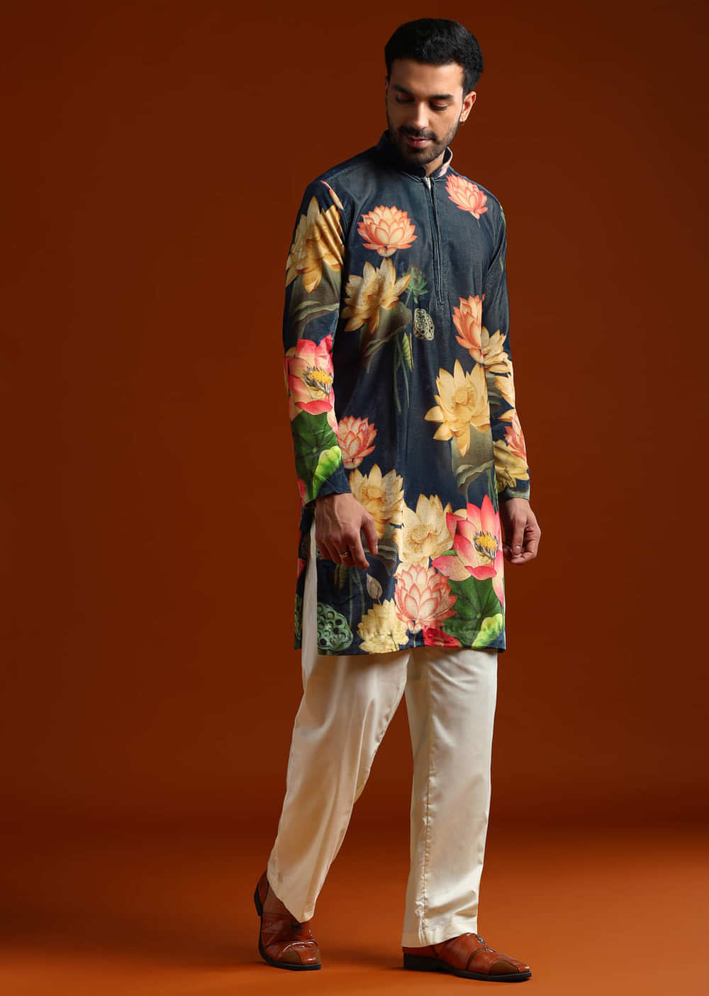 Texture steals the scene when this navy blue printed velvet men’s kurta set adds depth and soft sheen in one move. The print keeps the surface lively while the velvet reads luxe in photos and in person. You look refined and festive without adding extra embellishment. Awarded as the Most Trusted Brand, we're delivering styles you love, just as promised.