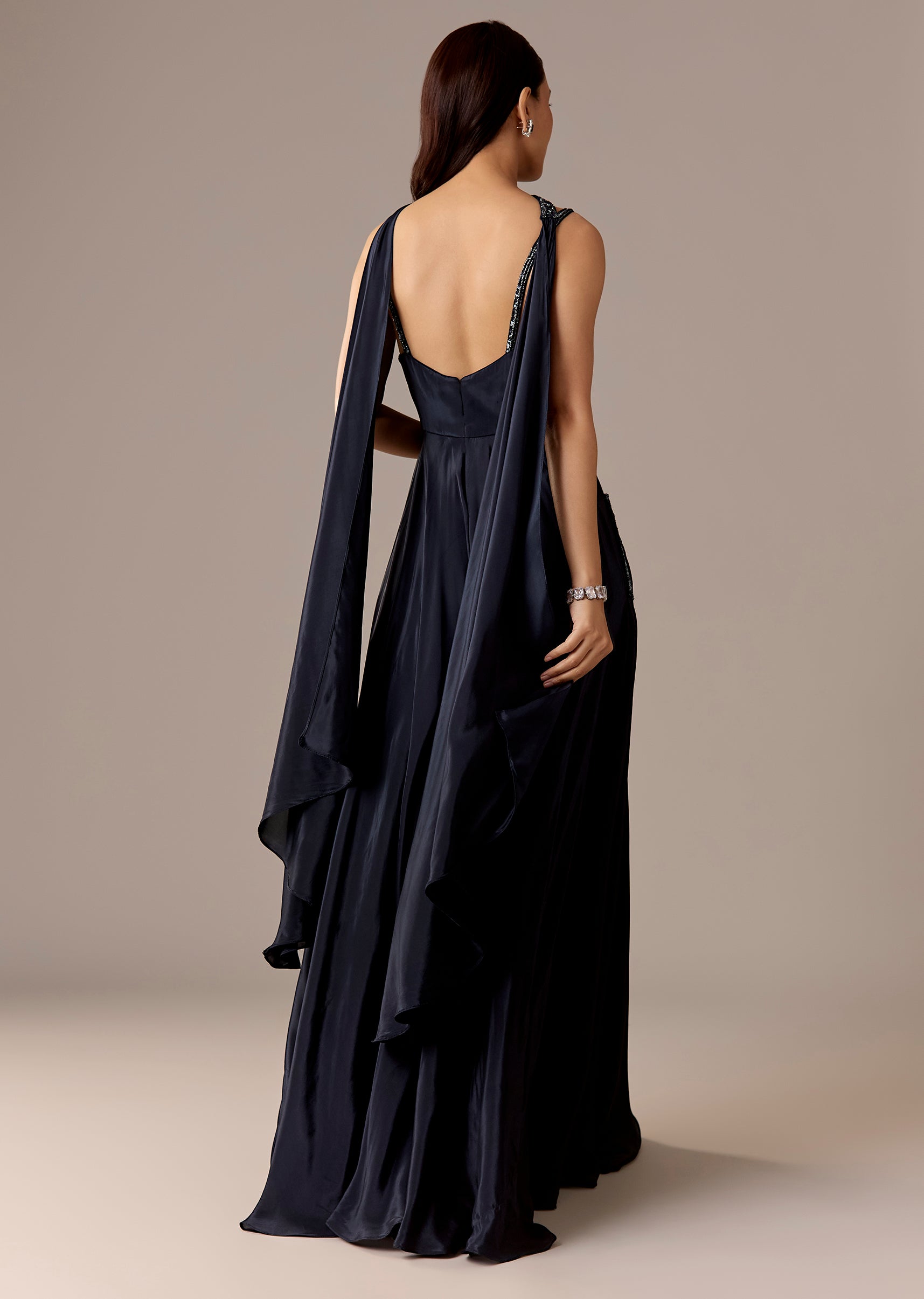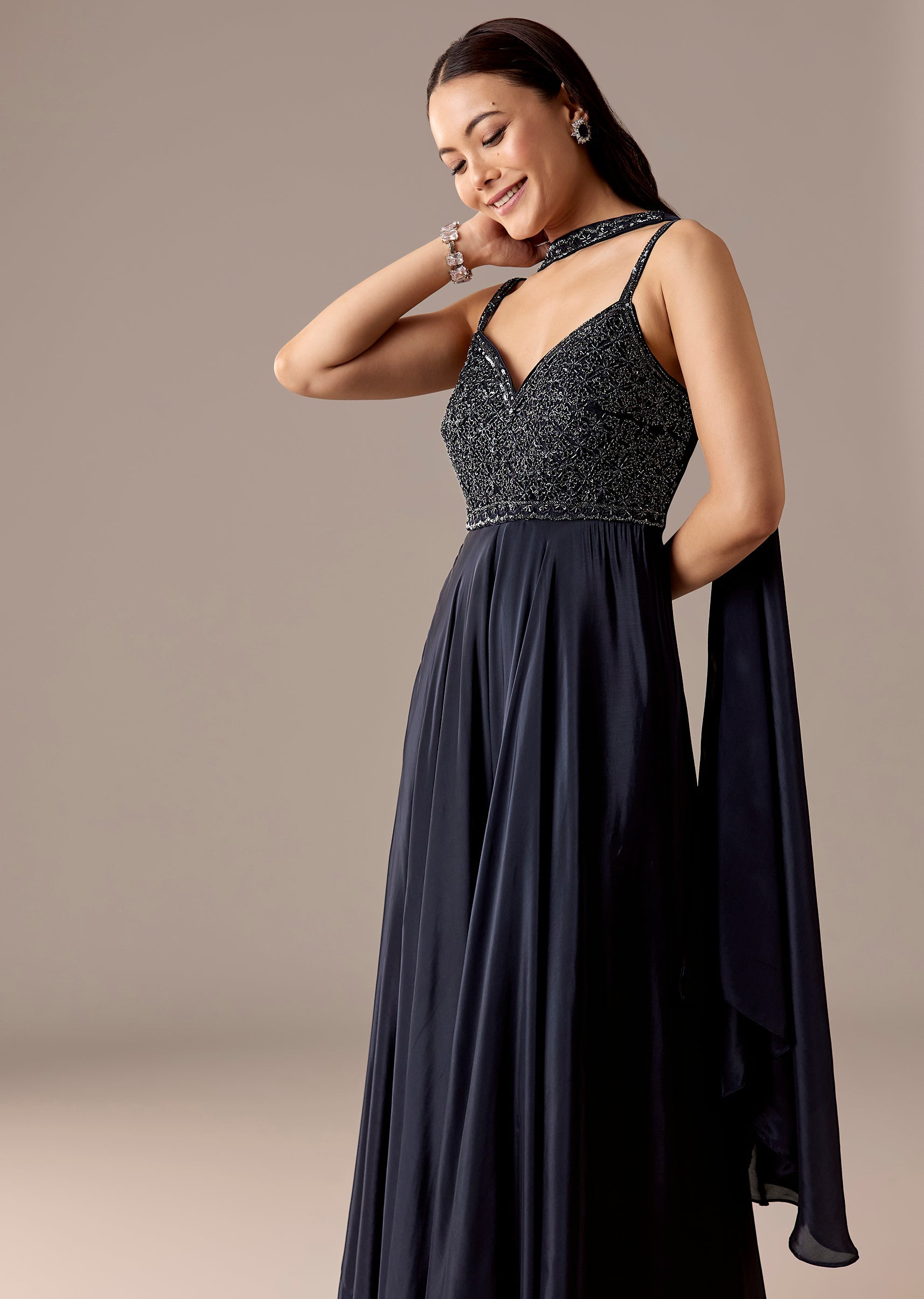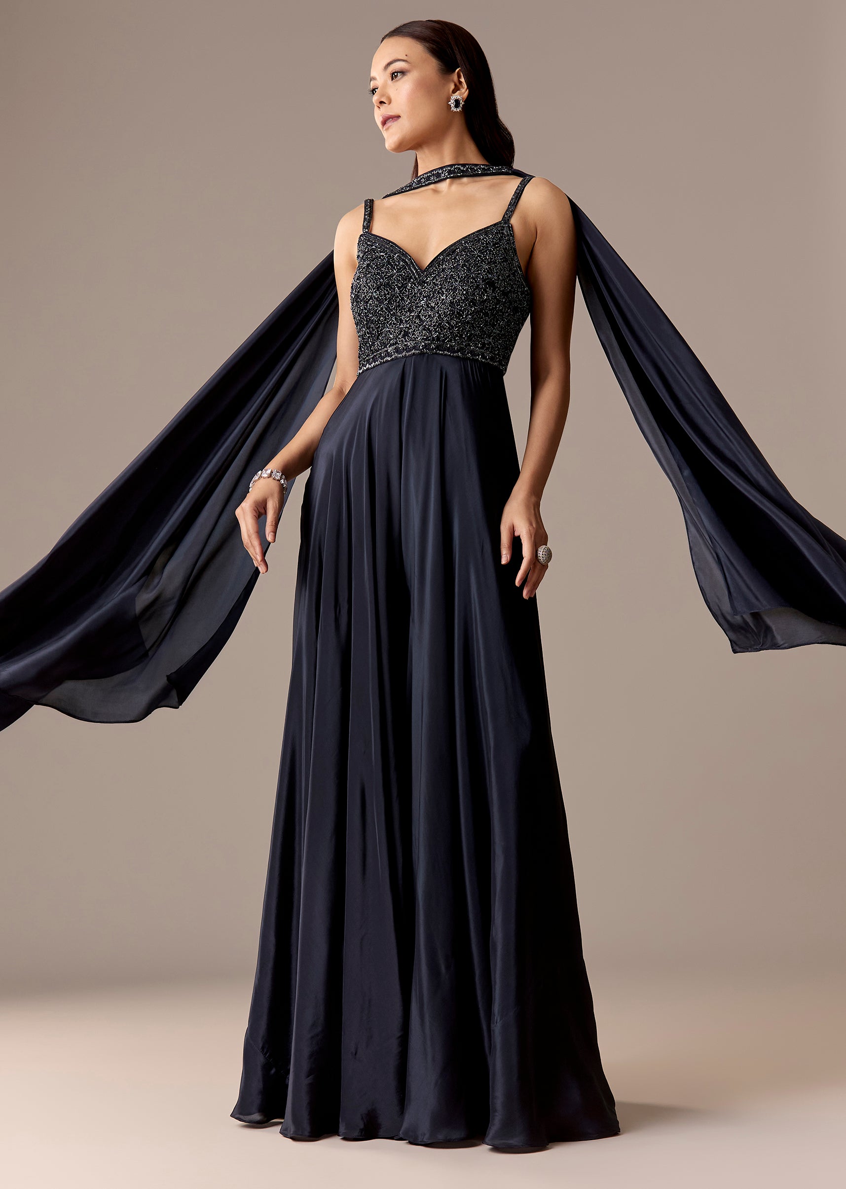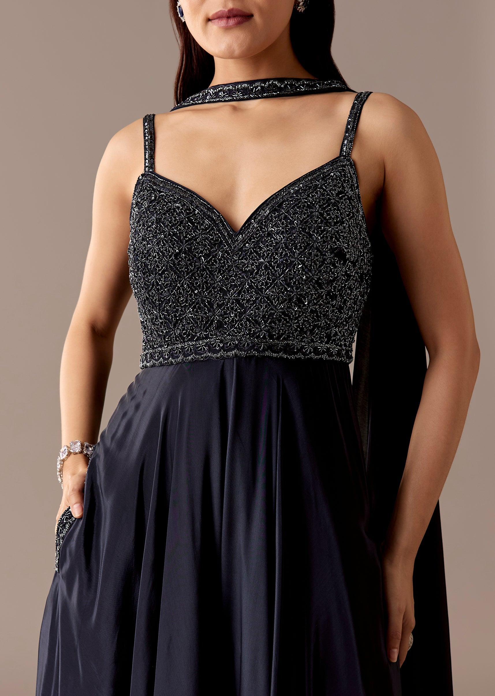 A glam navy crepe jumpsuit with sequin, cut-dana, and bead embroidery, styled with a sweetheart neckline and choker dupatta. Back zip finish and floor-length flare—made for parties, cocktail nights, and sangeet.Awarded as the Most Trusted Brand, we're delivering styles you love, just as promised.