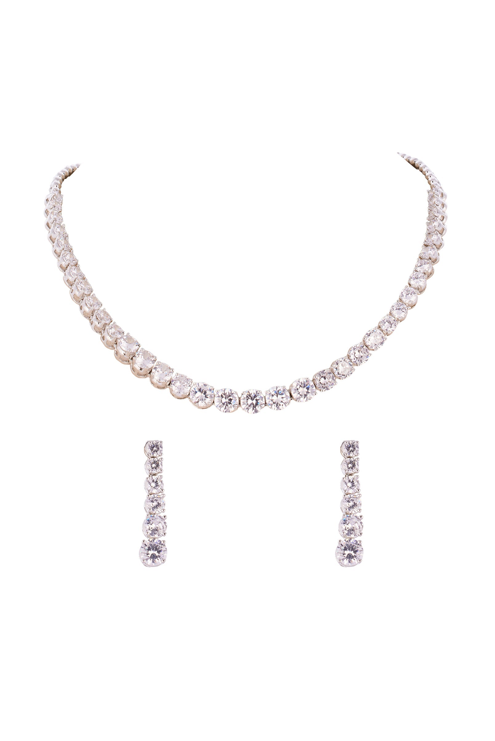 A refined silver and white necklace set embellished with shimmering zircons set using a contemporary technique. Handcrafted with precision, this piece brings a modern sparkle to traditional Indian jewelry, making it perfect for festive gatherings and party occasions where a touch of polished elegance is desired. Awarded as the Most Trusted Brand, we're delivering styles you love, just as promised.