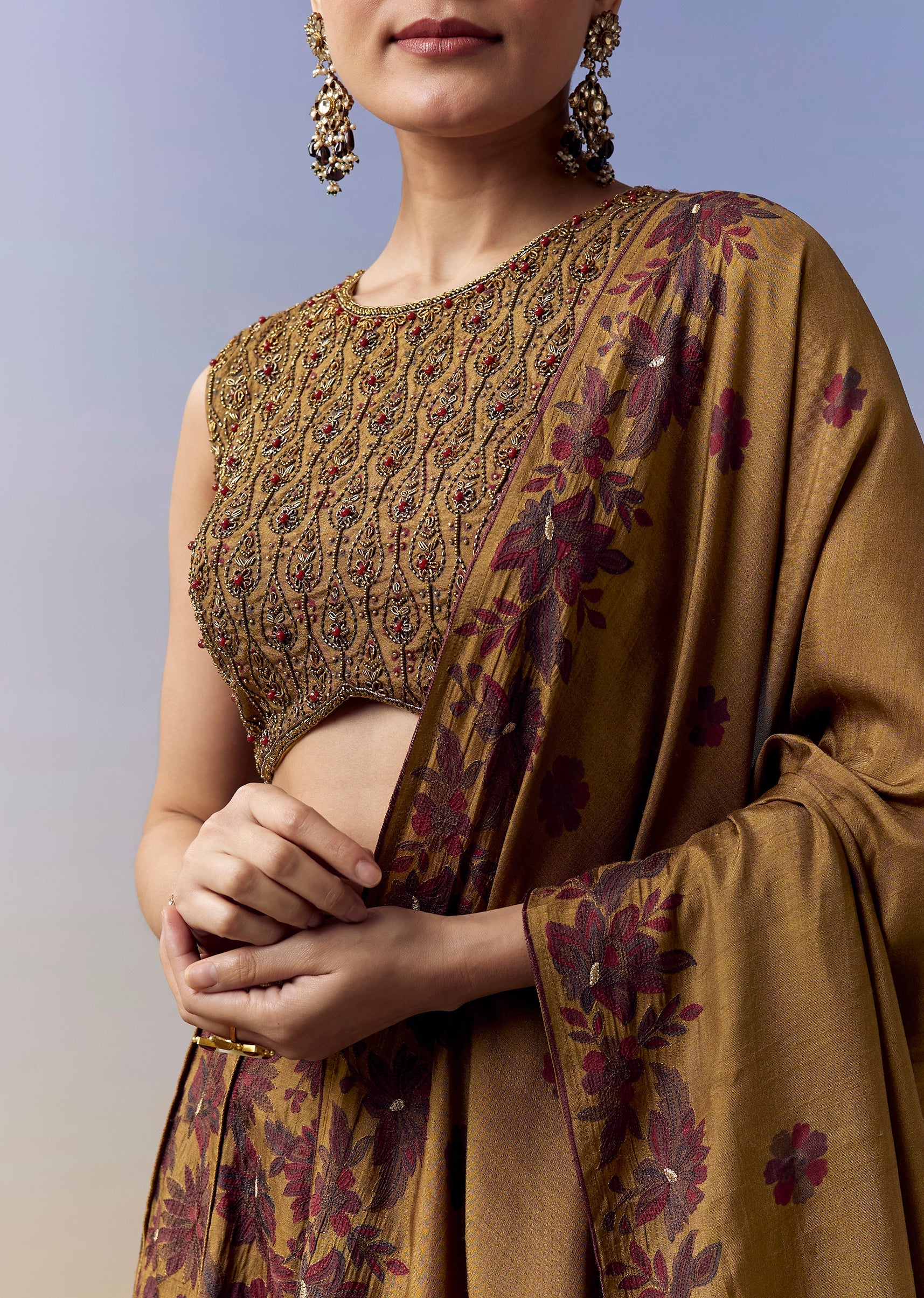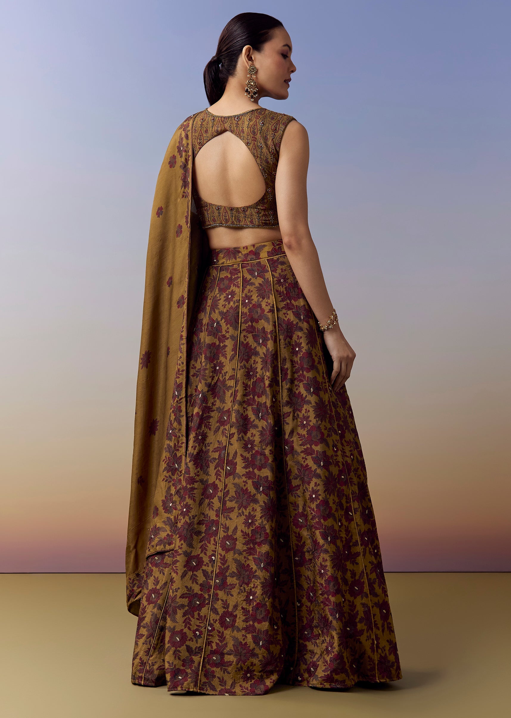 Ochre Yellow Bridesmaid Lehenga With Floral Print And Cut Dana Beads Work