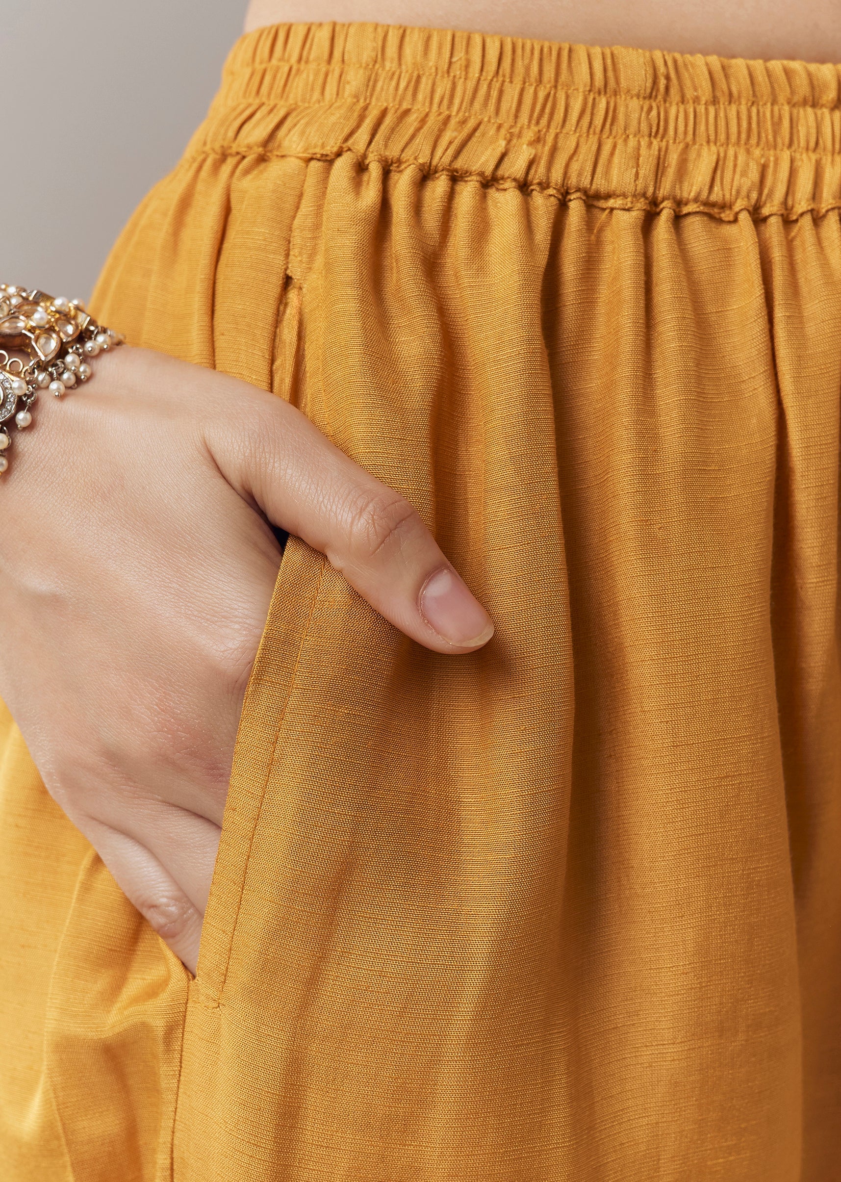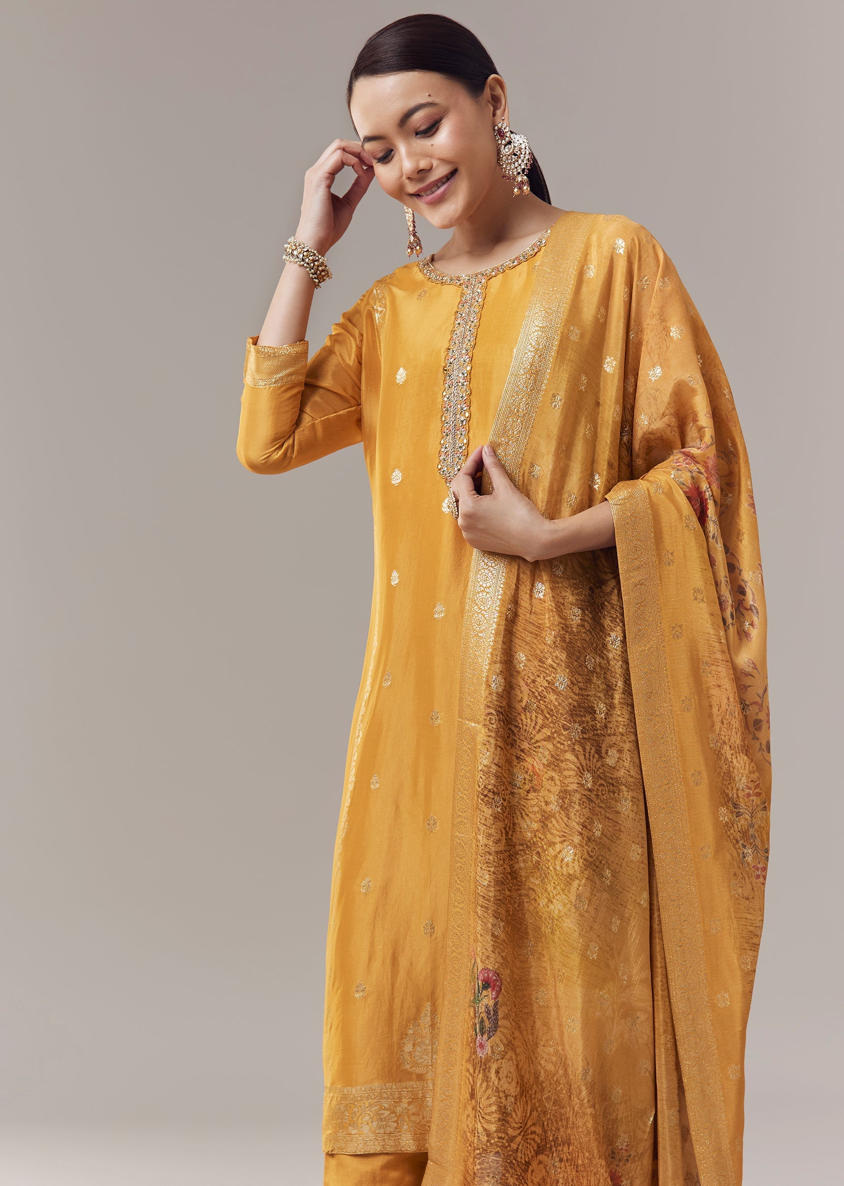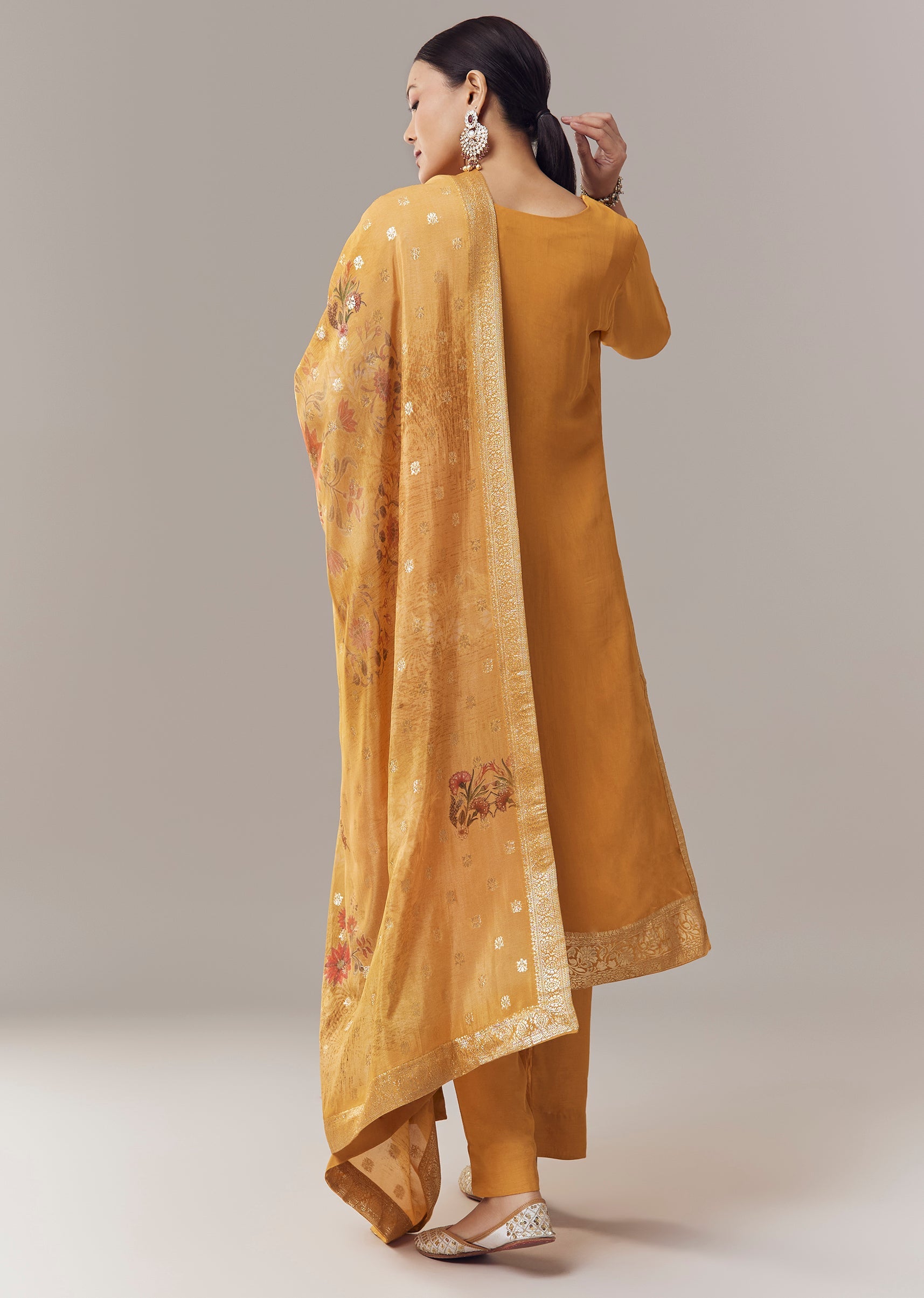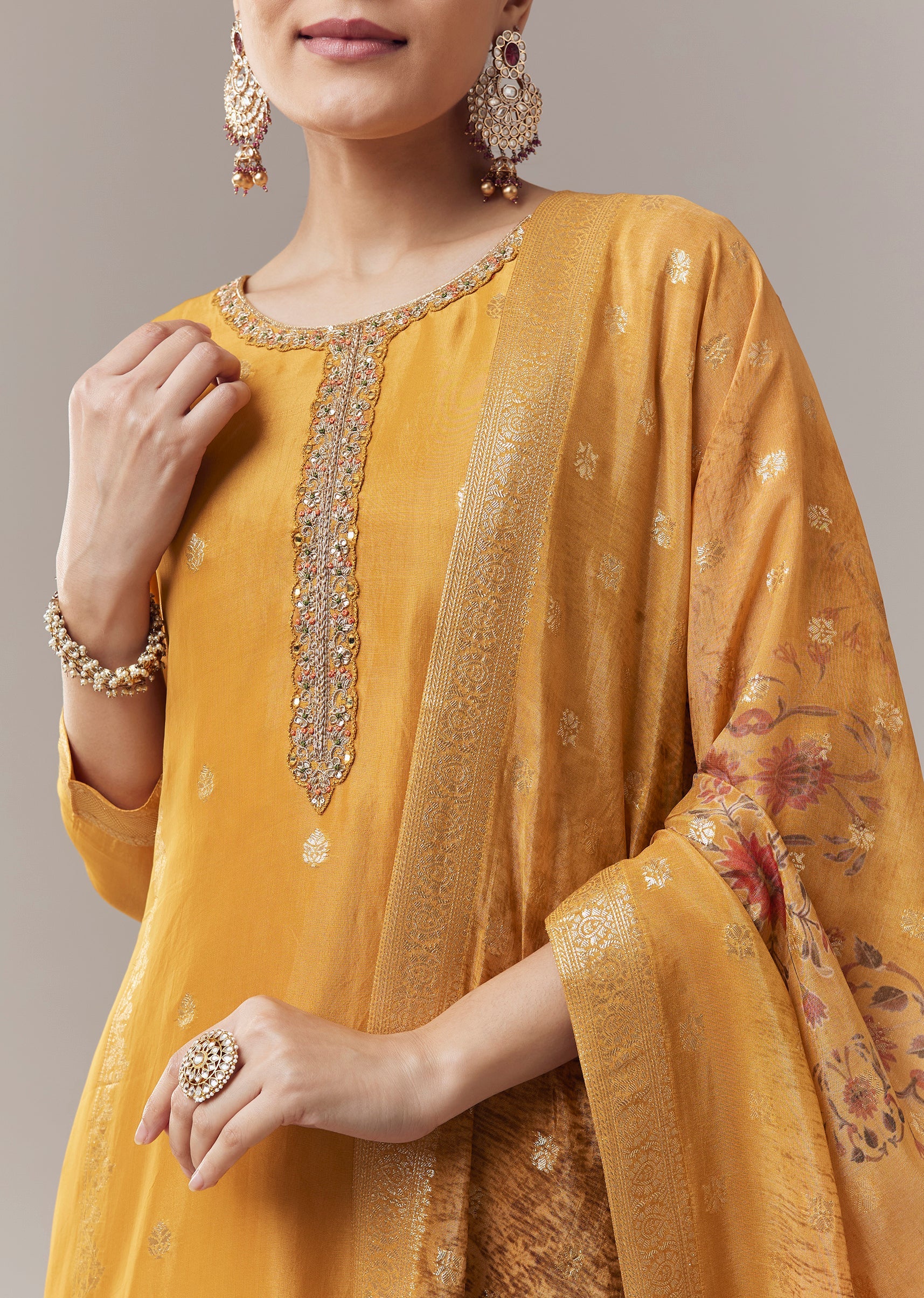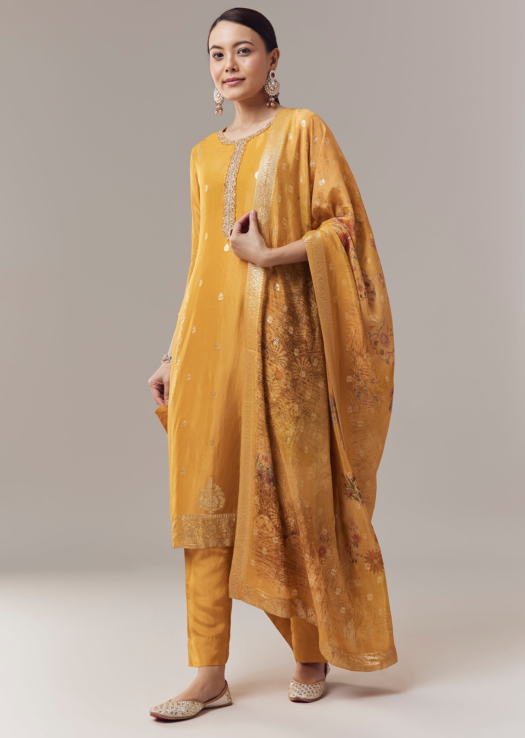 Elegant and timeless, this ochre yellow kurta set is crafted in luxurious Banarasi organza fabric that offers a subtle sheen and refined texture. Designed in a straight silhouette, the kurta... More Product Details