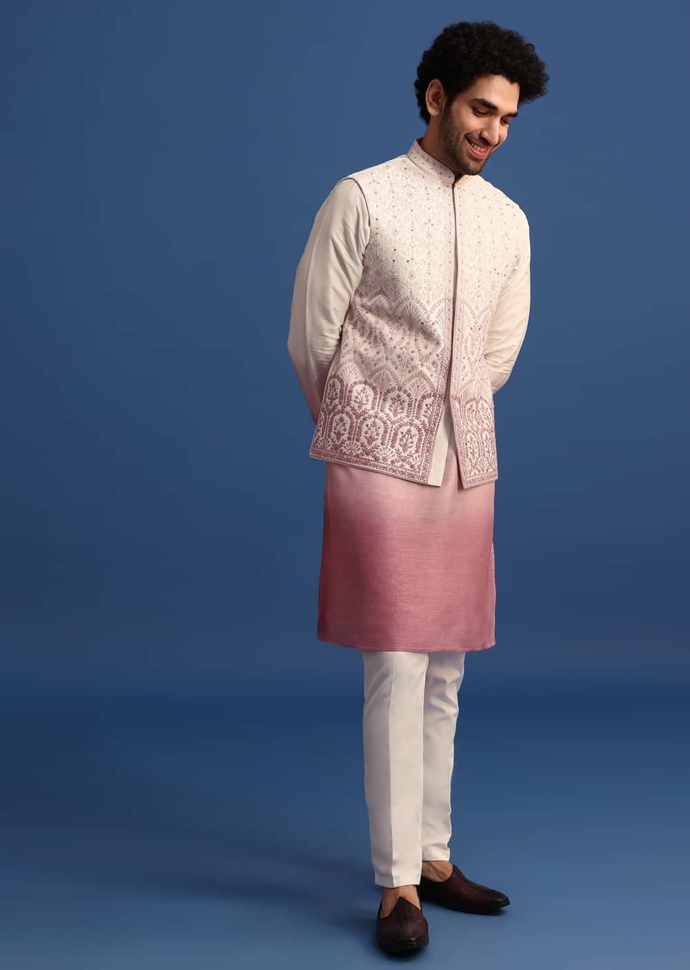 Off White And Pink Ombre Kurta Set With Mirror Work Jacket