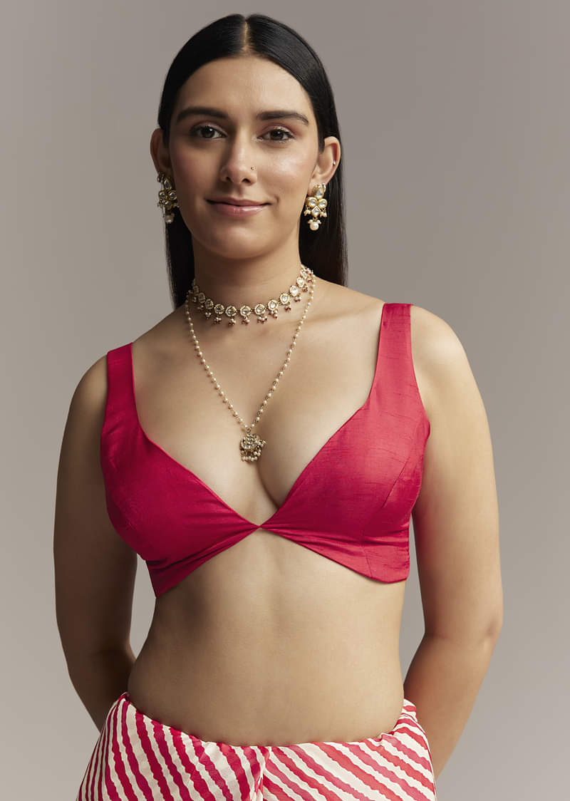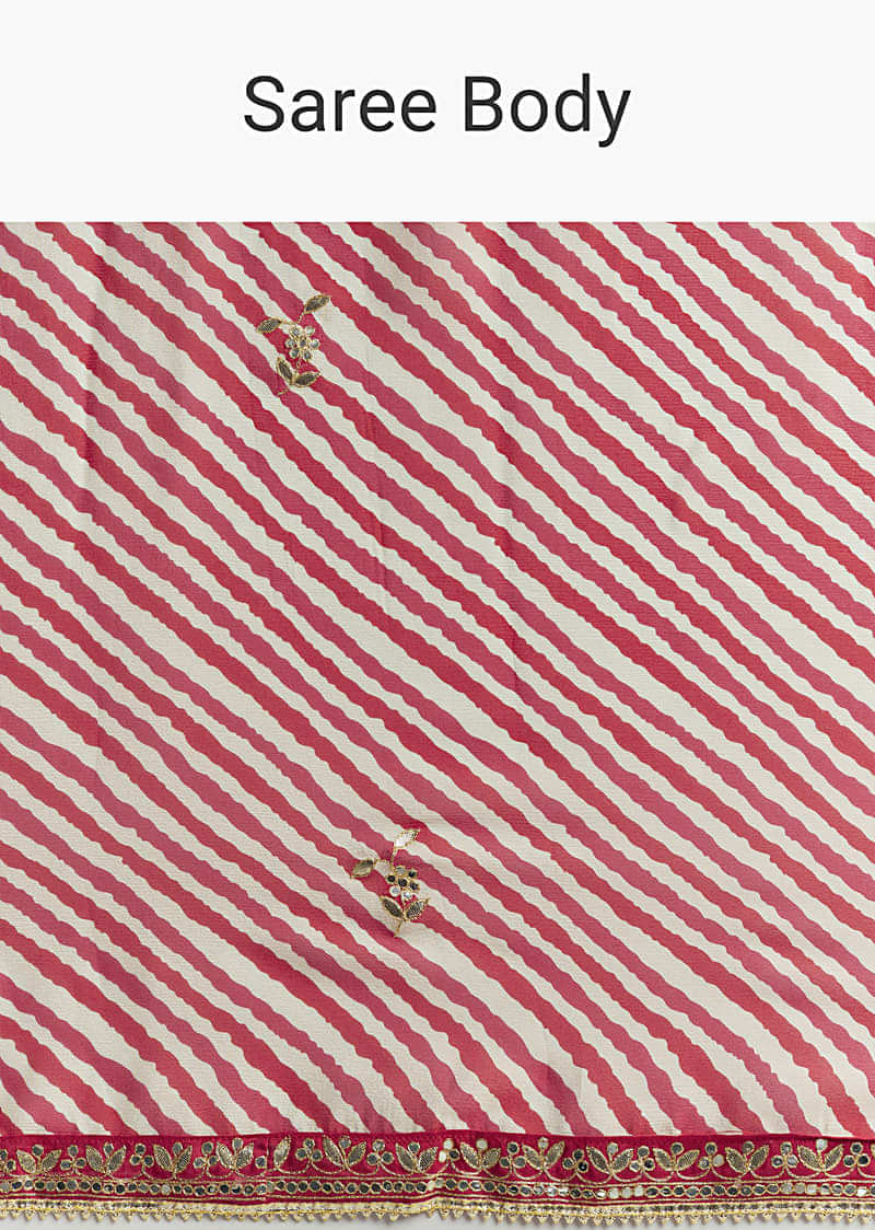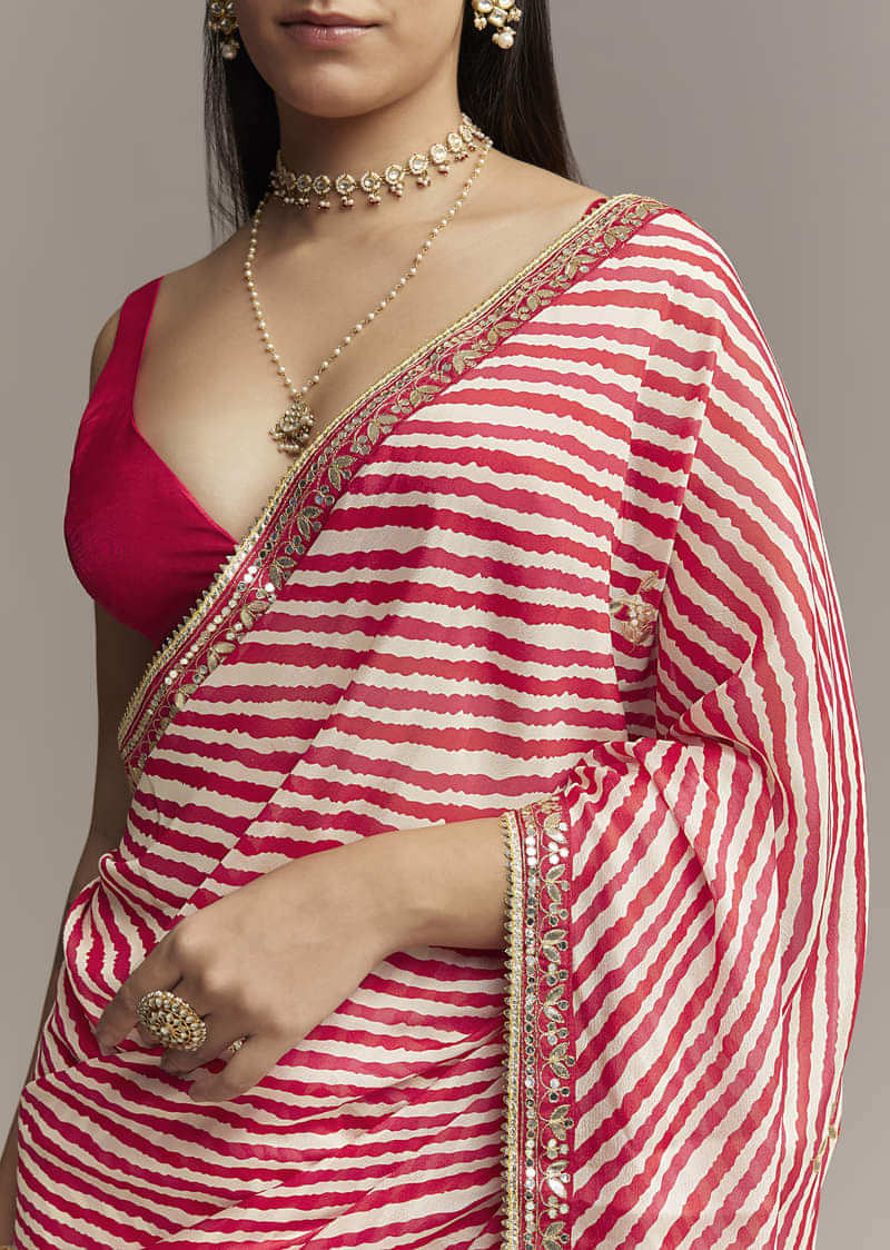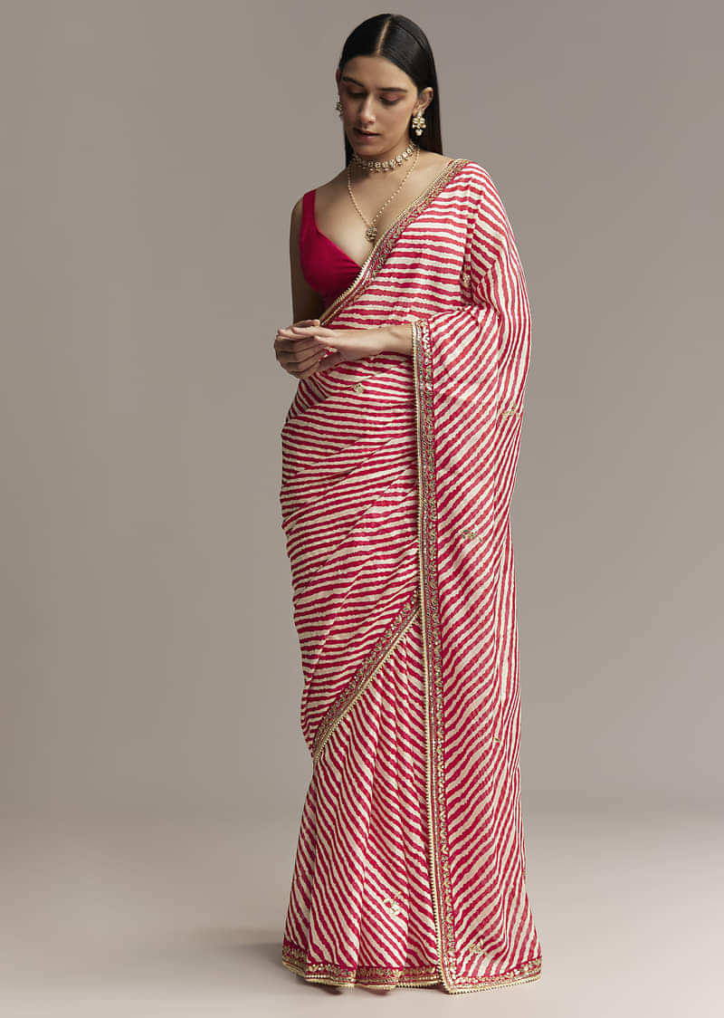 Off-white chinnon base with bold red printed stripes gives this saree a playful punch. Finished with gota work, embroidered border, and scattered butti on both saree and blouse. Awarded as the Most Trusted Brand, we're delivering styles you love, just as promised.