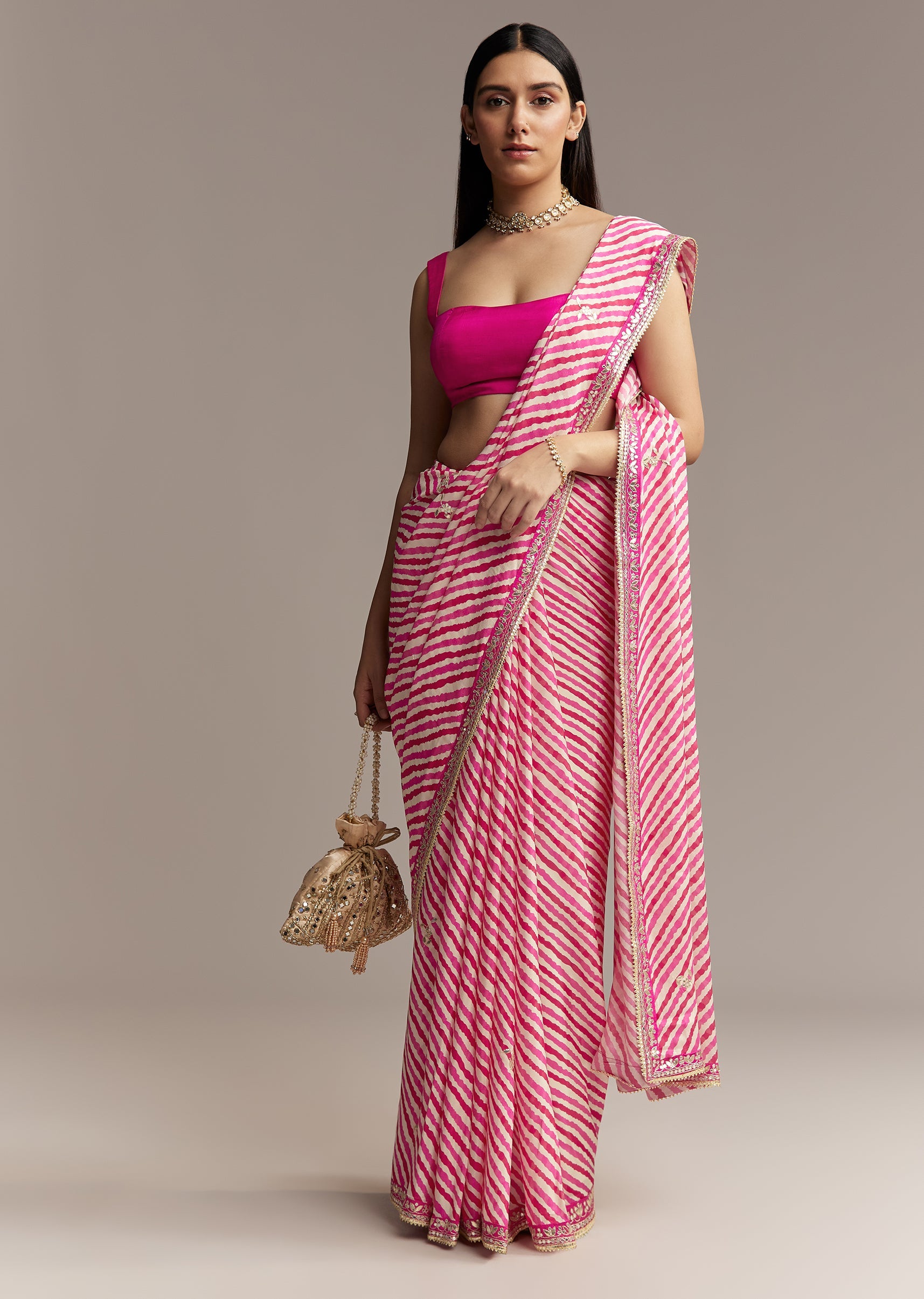 Off White Chinnon Saree With Pink Striped Print And Gota Detailing