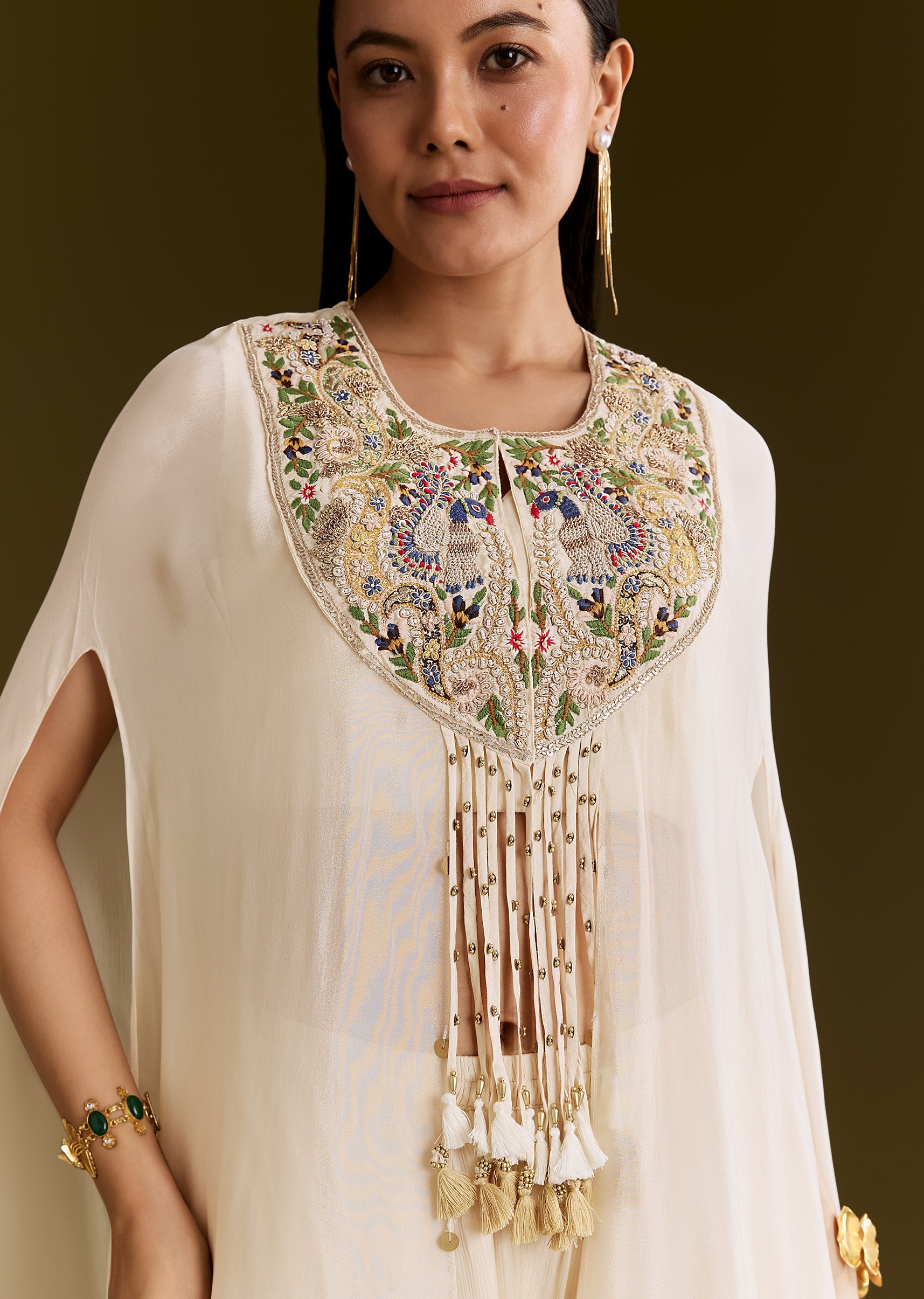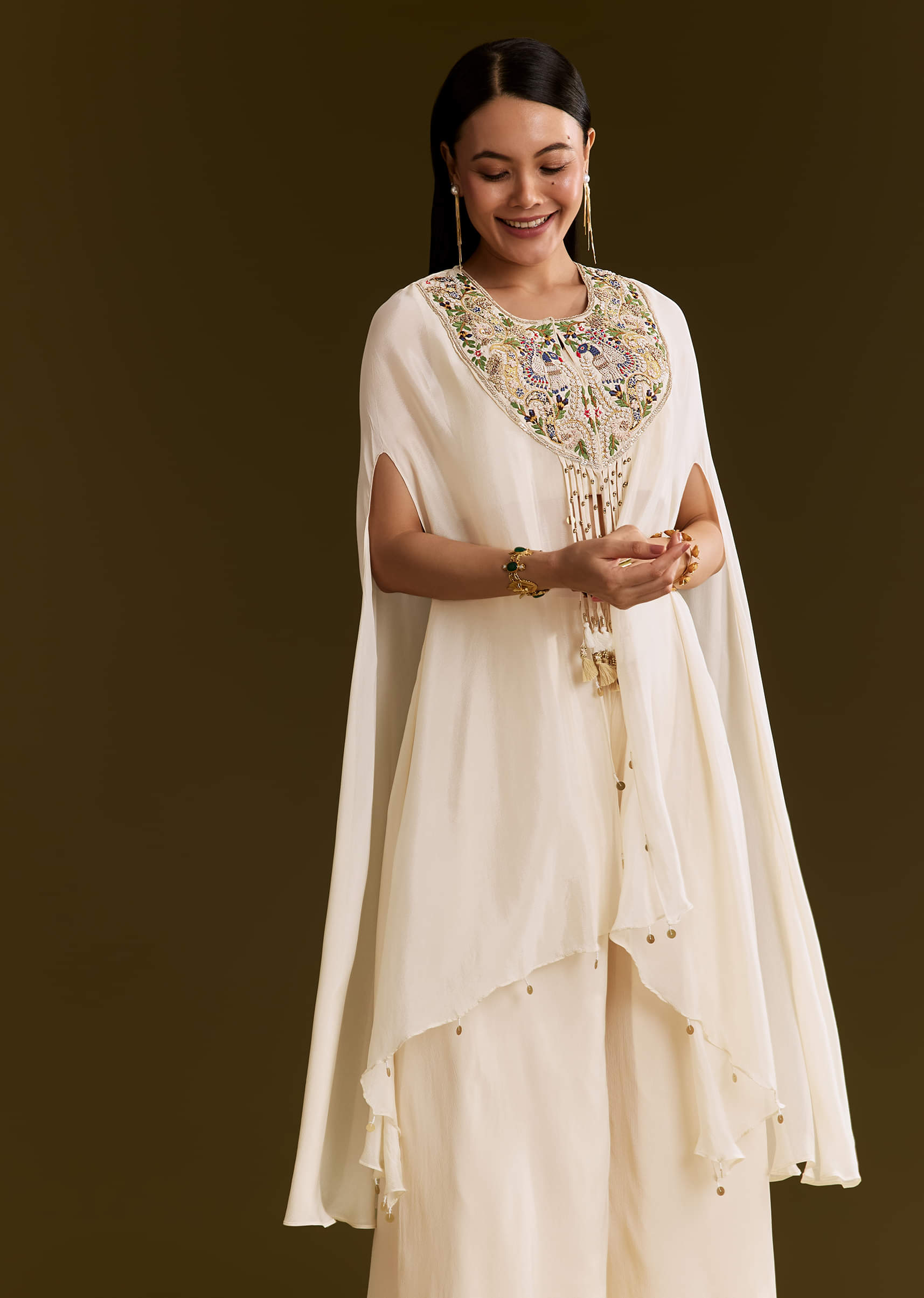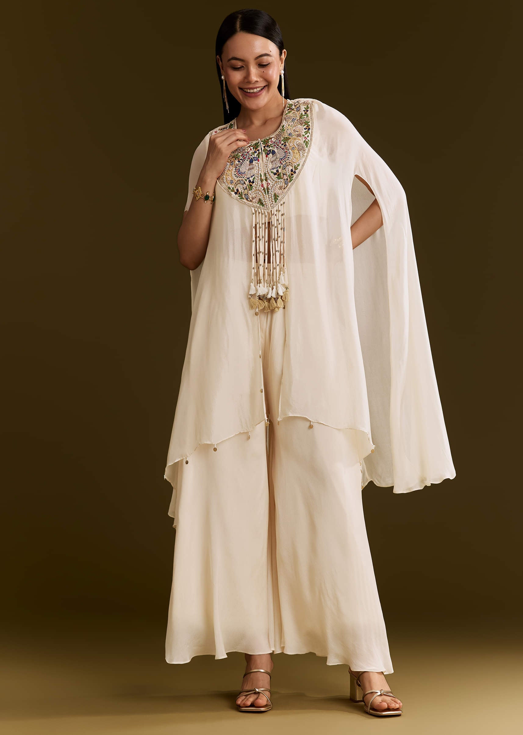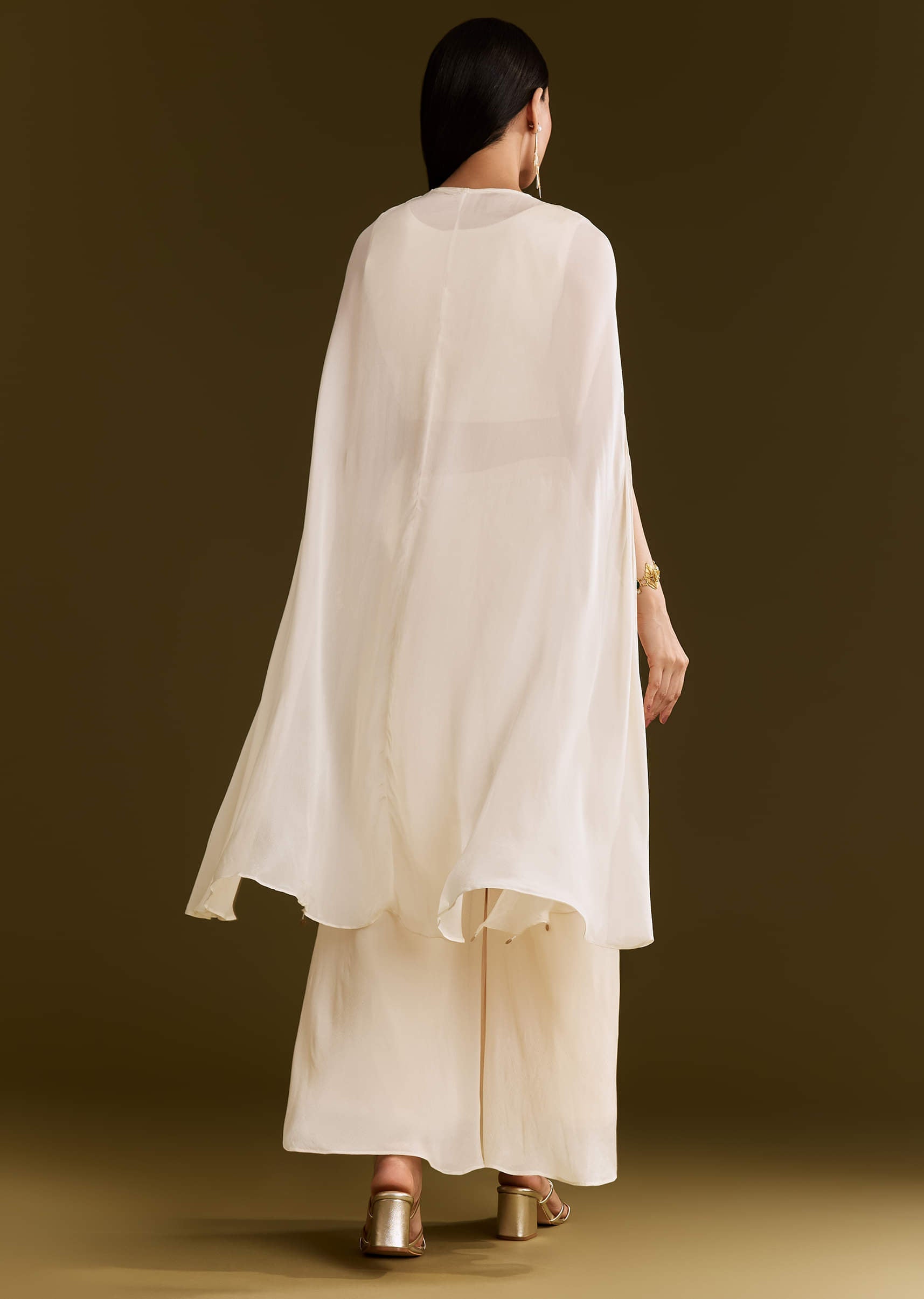 Off White Chinon Cape Suit With Zardosi And Moti Embroidery