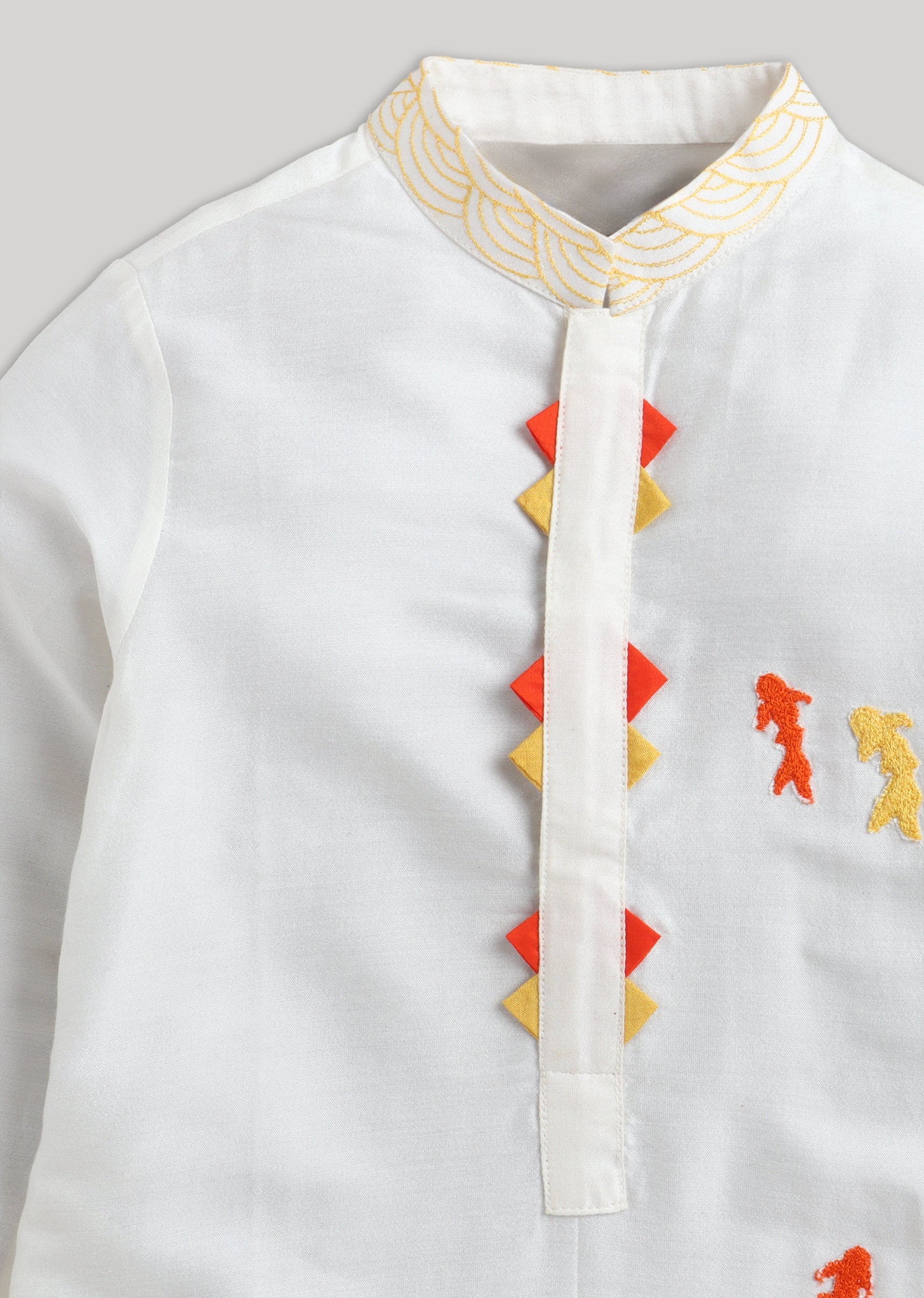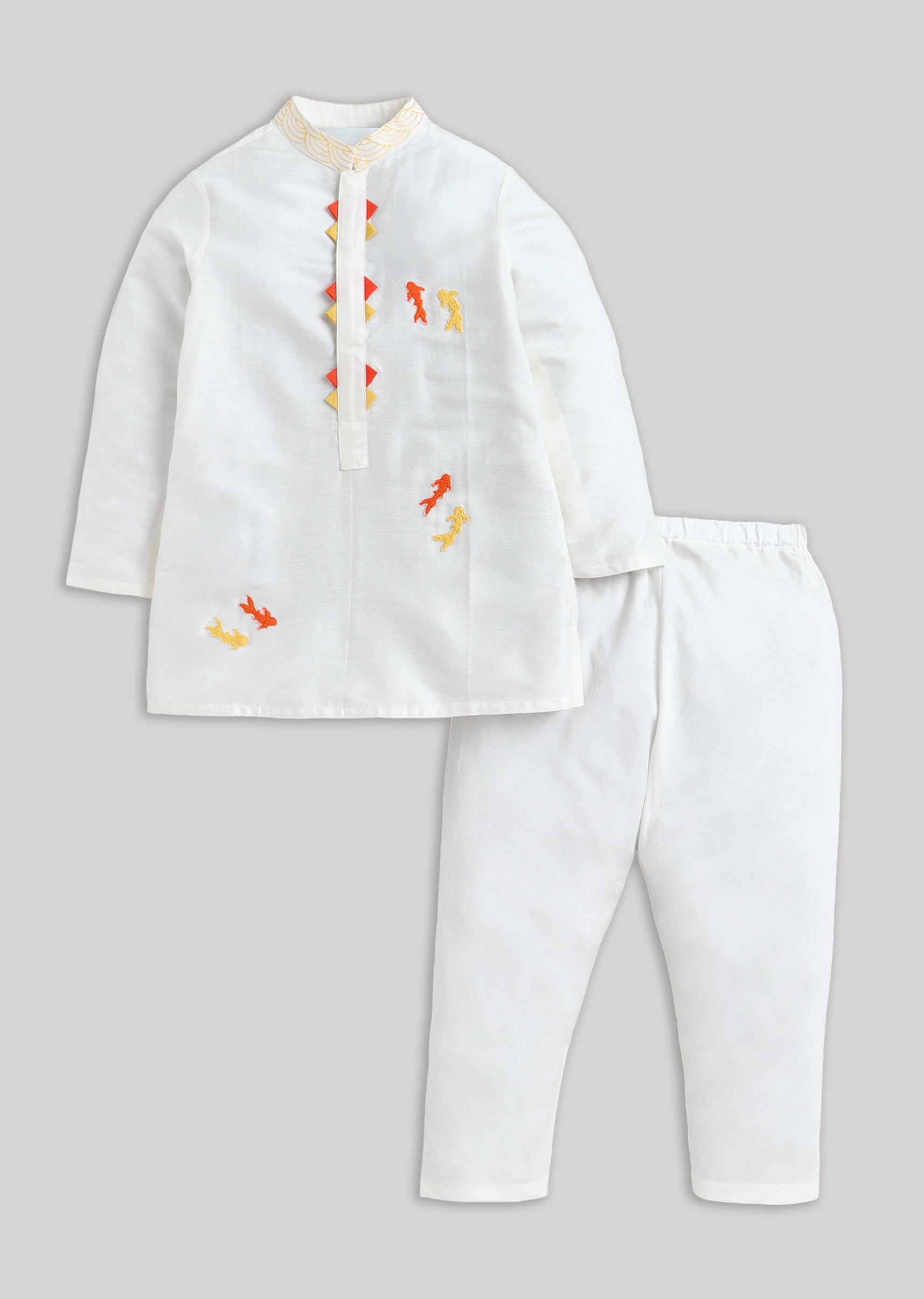 Simple, elegant, and versatile, this off-white kurta set is perfect for poojas and intimate festive gatherings. Crafted in breathable cotton with cotton silk elements, the full-sleeve kurta features a mandarin... More Product Details