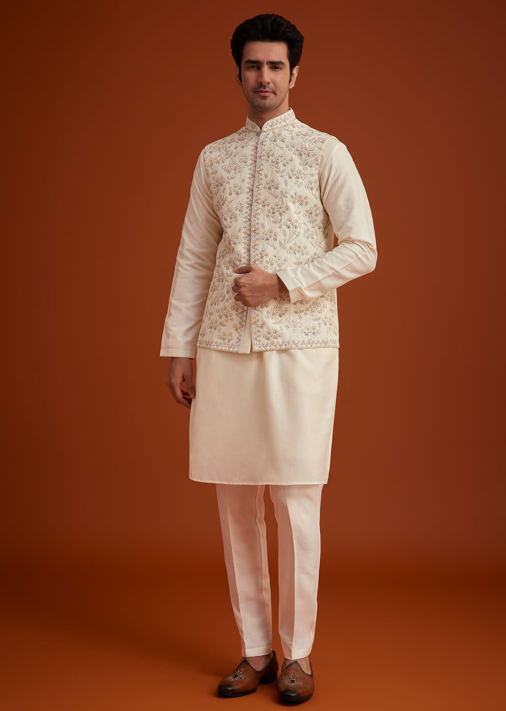 - Elevate Your Festive Look With This Offwhite Cotton Silk Jacket Set Adorned With Intricate Floral Zari Embroidery.