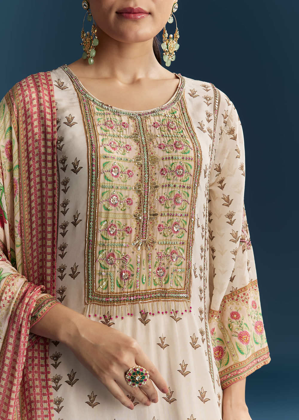 Subtle prints meet an airy silhouette in this off white crepe printed kurta set. The fabric feels breezy, making it ideal for laid-back dressing with a stylish twist. It is... More Product Details
