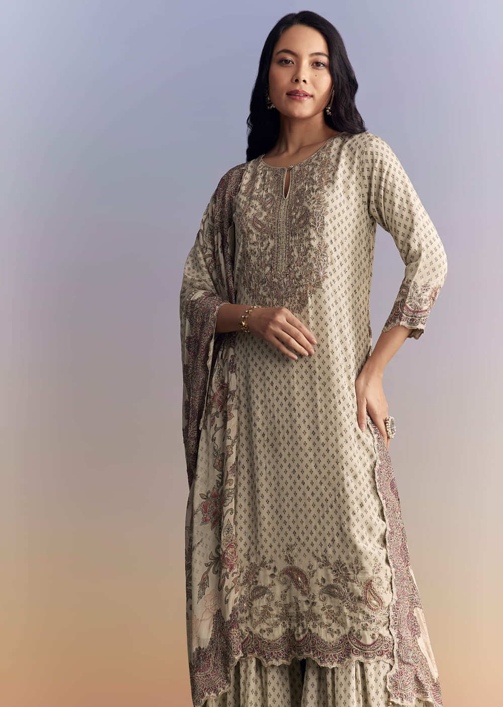 For festive plans that need easy movement, this off white crepe sharara suit keeps the palette fresh and the print in focus. Paisley motifs add a classic touch that photographs... More Product Details