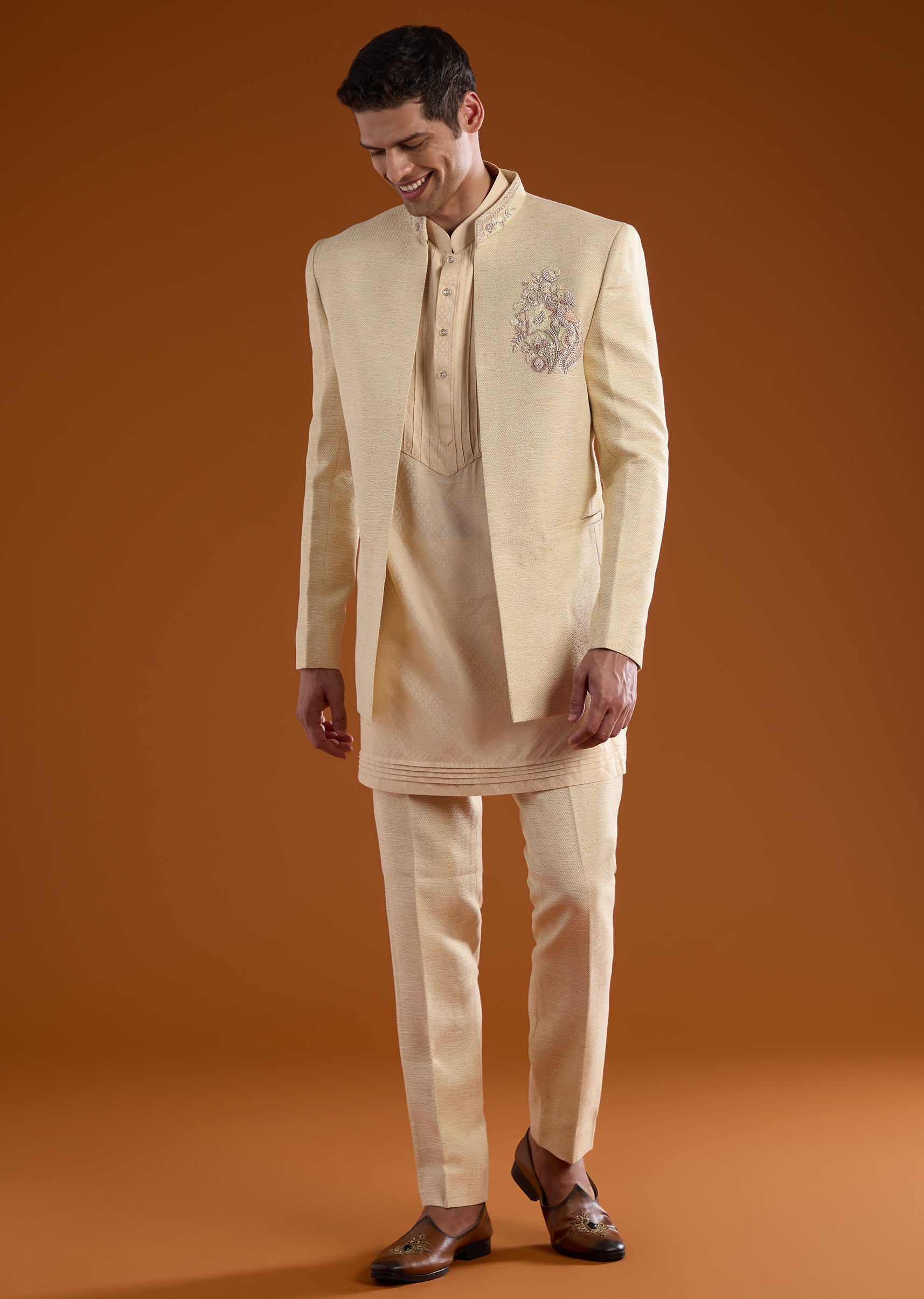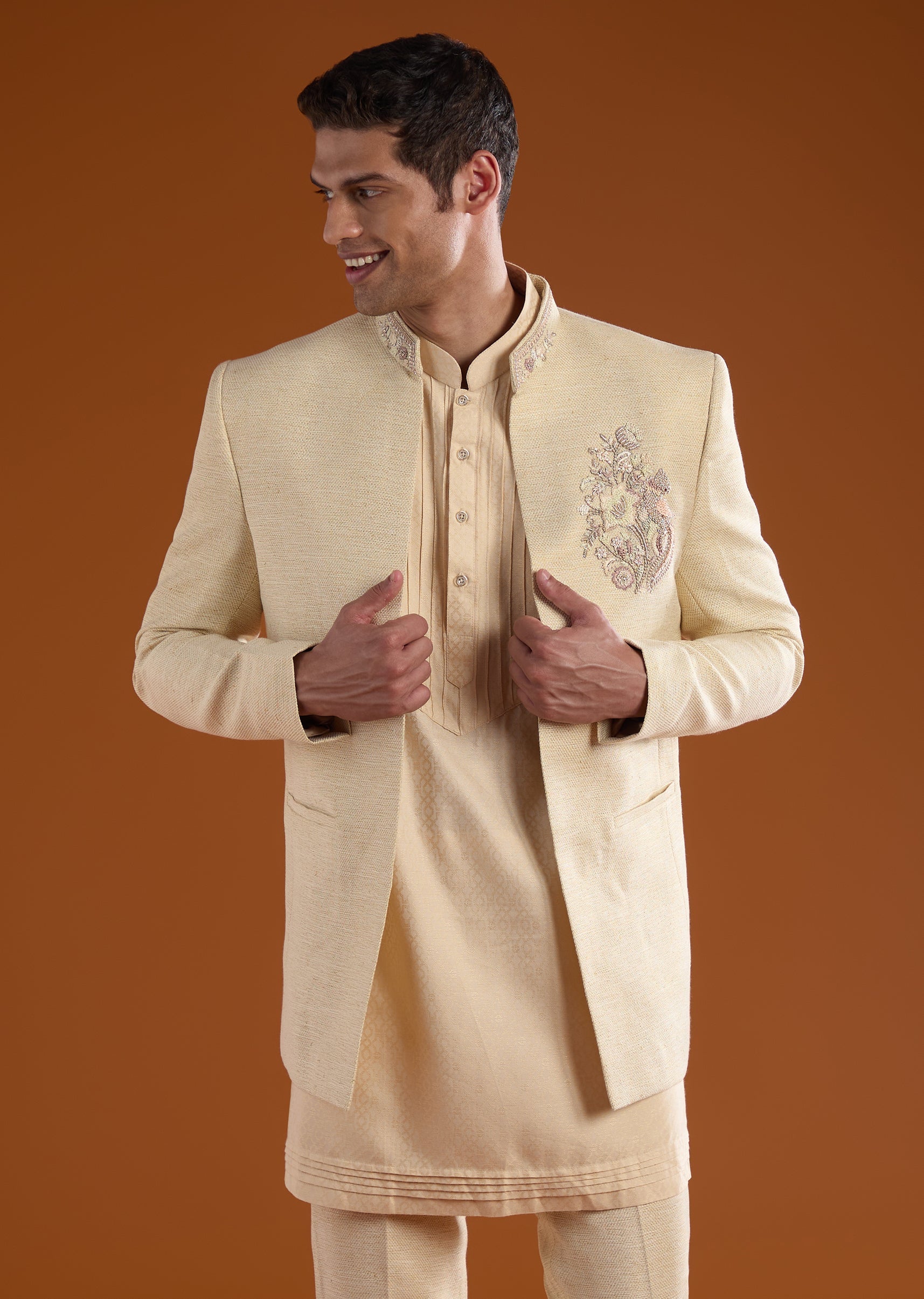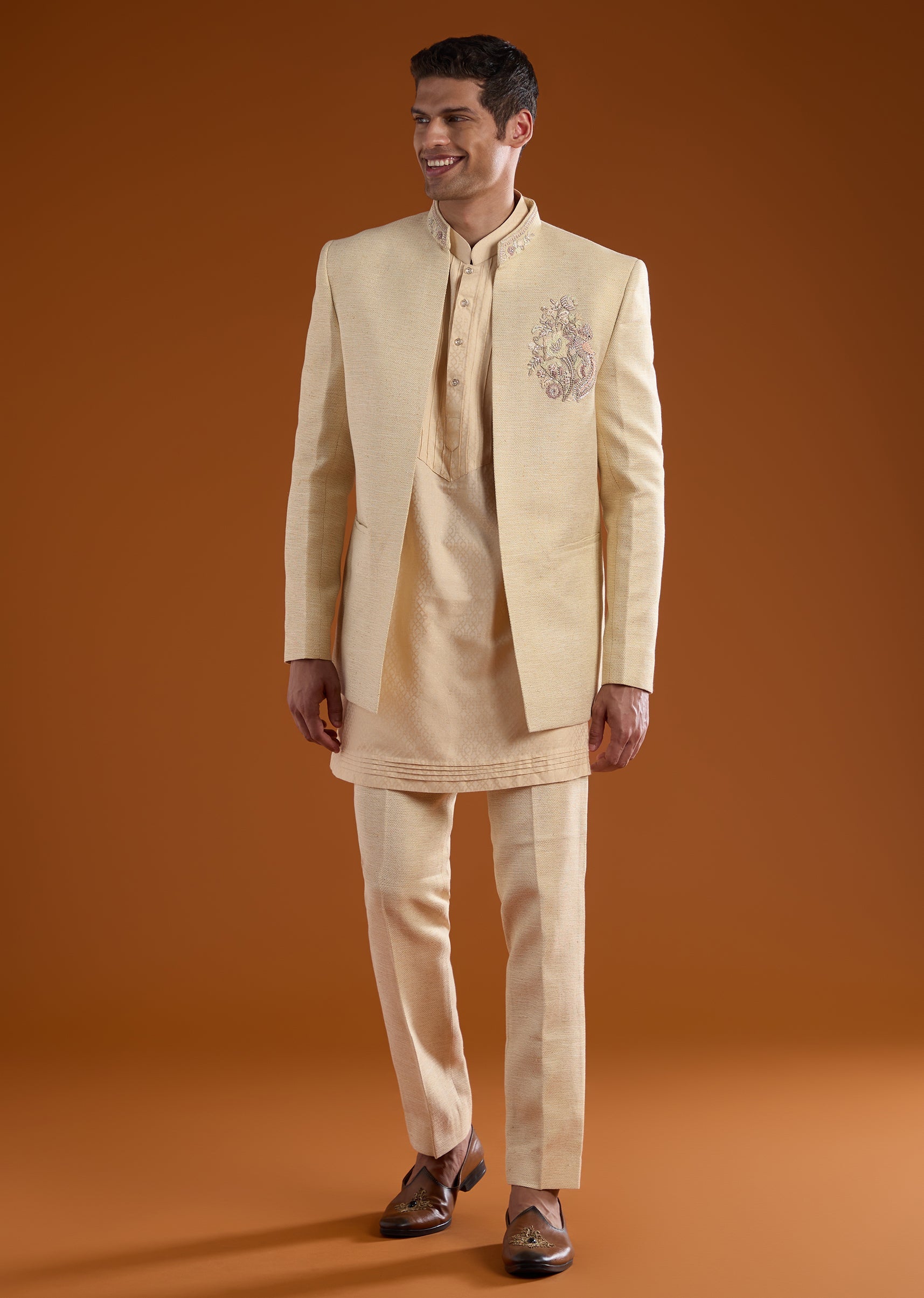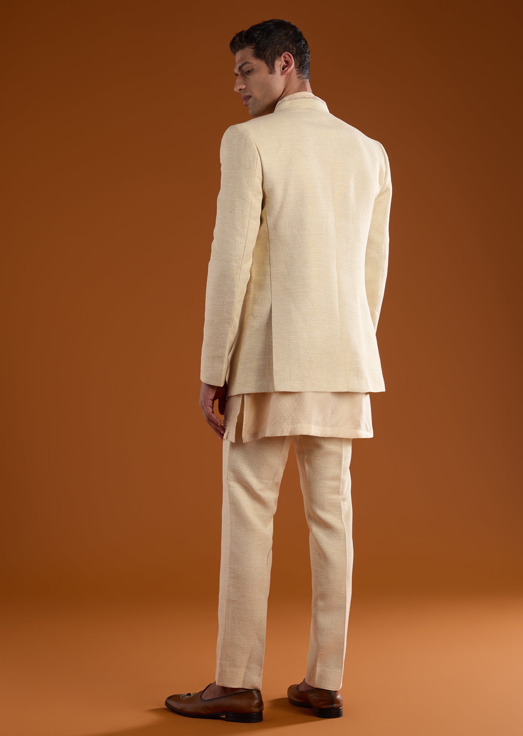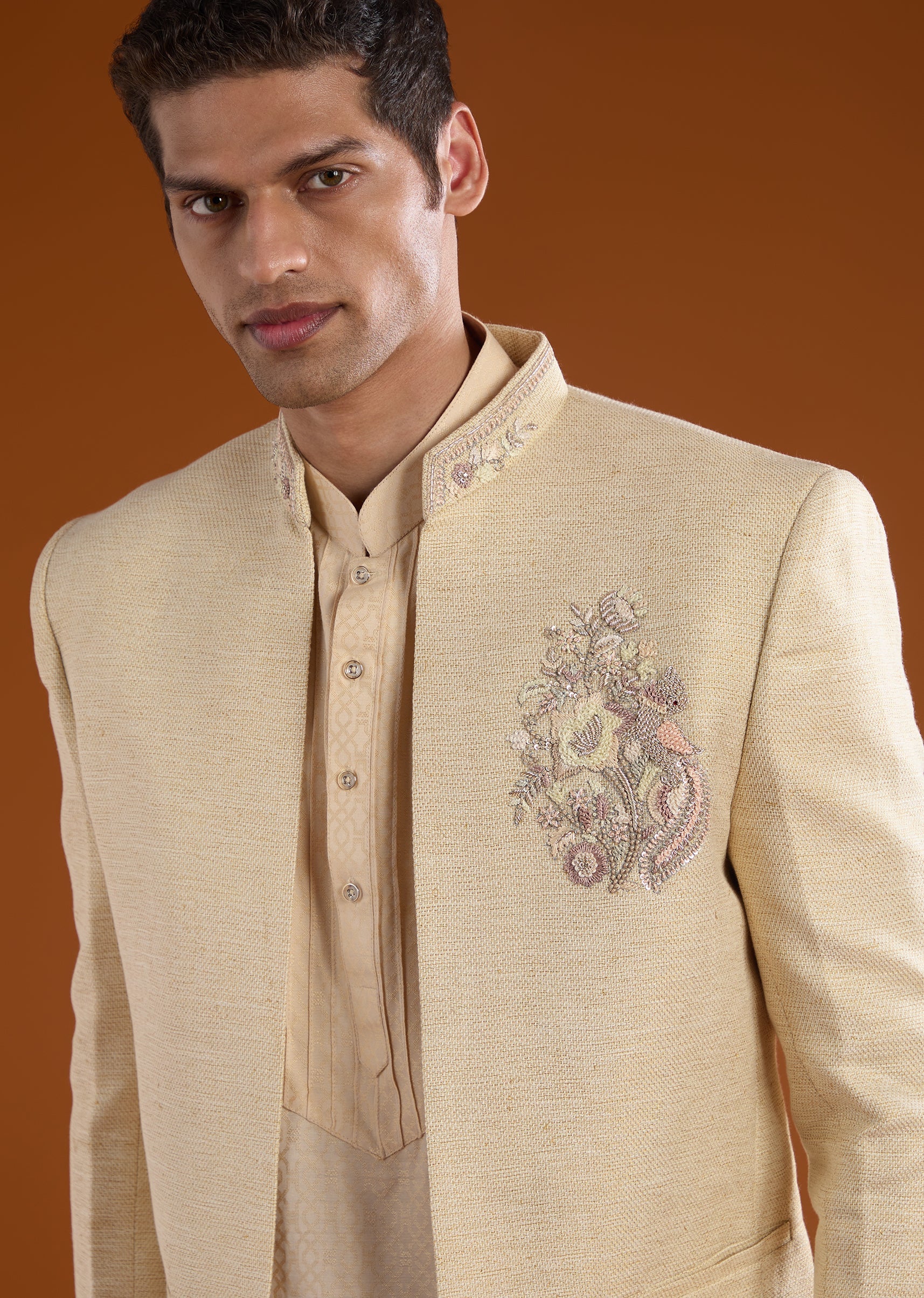 Rich in tradition with a refined festive edge, this matka silk jodhpuri kurta set is crafted for distinguished celebrations. The textured matka silk fabric is elevated with intricate thread and... More Product Details
