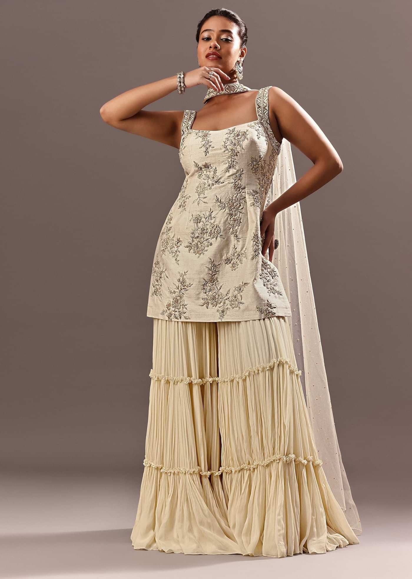 Ensure your kurta should skim your figure while the sharara should flow gracefully.