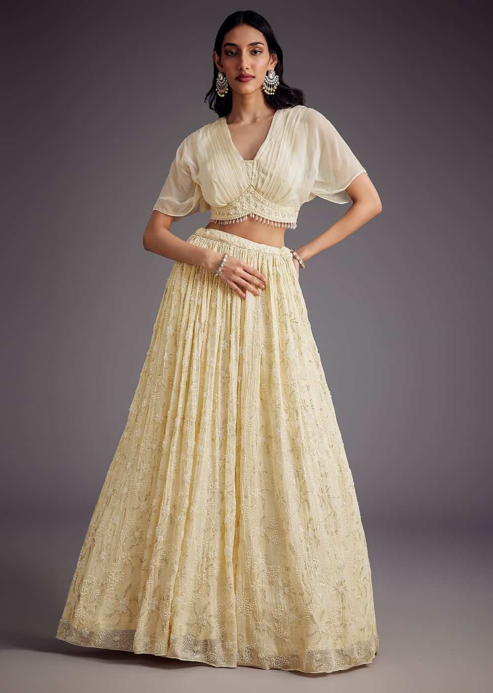 Delve into the ethereal charm of this offwhite ensemble, featuring an intricately embroidered pleated skirt paired with a delicate sheer layered croptop. The croptop's soft organza layers create a dreamy effect, while the detailed embroidery adds a touch of sophistication. Perfect for engagement ceremonies or pre-wedding celebrations, this outfit encapsulates grace and understated elegance. Awarded as the Most Trusted Brand, we're delivering styles you love, just as promised.