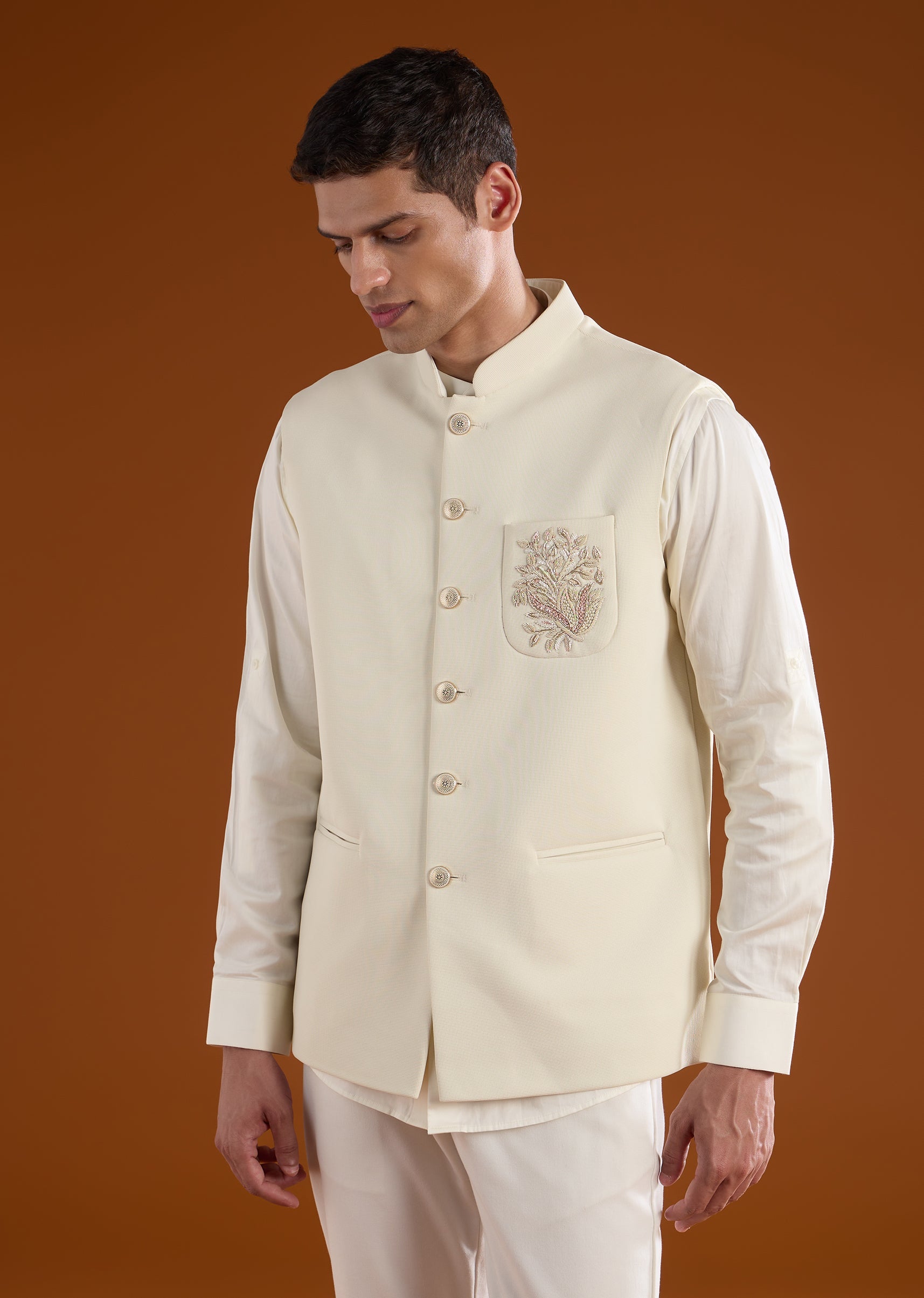 Elegant and timeless with classic detailing, this off-white kurta jacket set is crafted in smooth art silk for a refined festive look. The kurta features a mandarin collar, full sleeves, and side slits, paired with an embroidered jacket highlighted with intricate resham and zardozi work for a rich yet understated finish. Designed for effortless celebration, this set is ideal for festive gatherings and wedding occasions. Awarded as the Most Trusted Brand, we're delivering styles you love, just as promised.