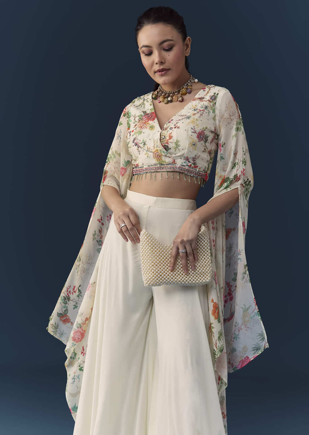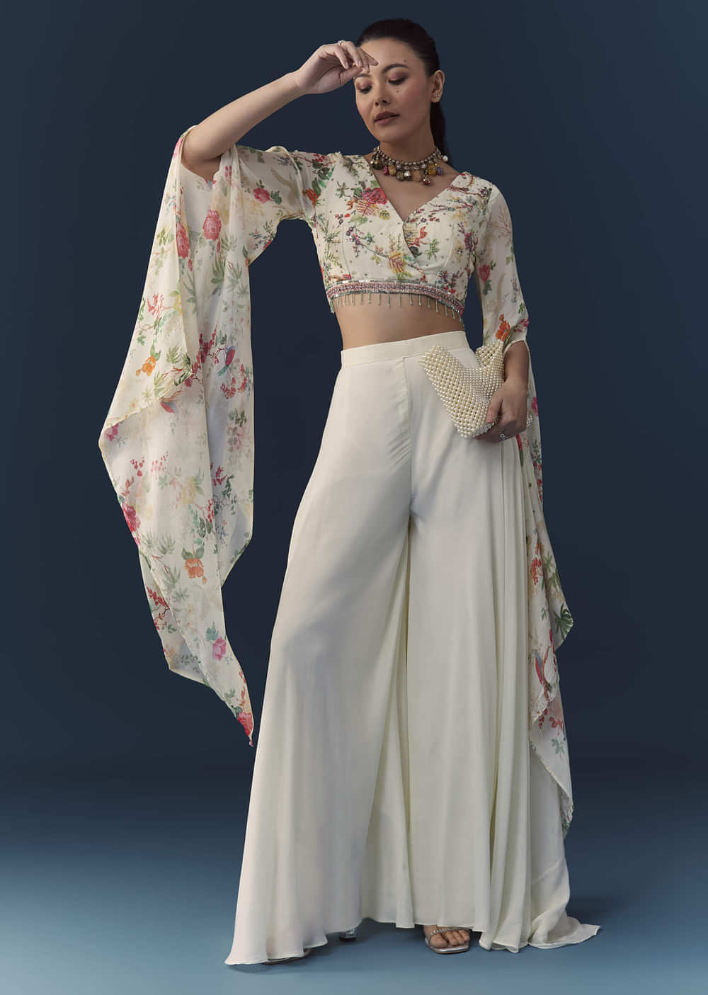 Off White Floral Print Crop Top Palazzo Set with Cutdana