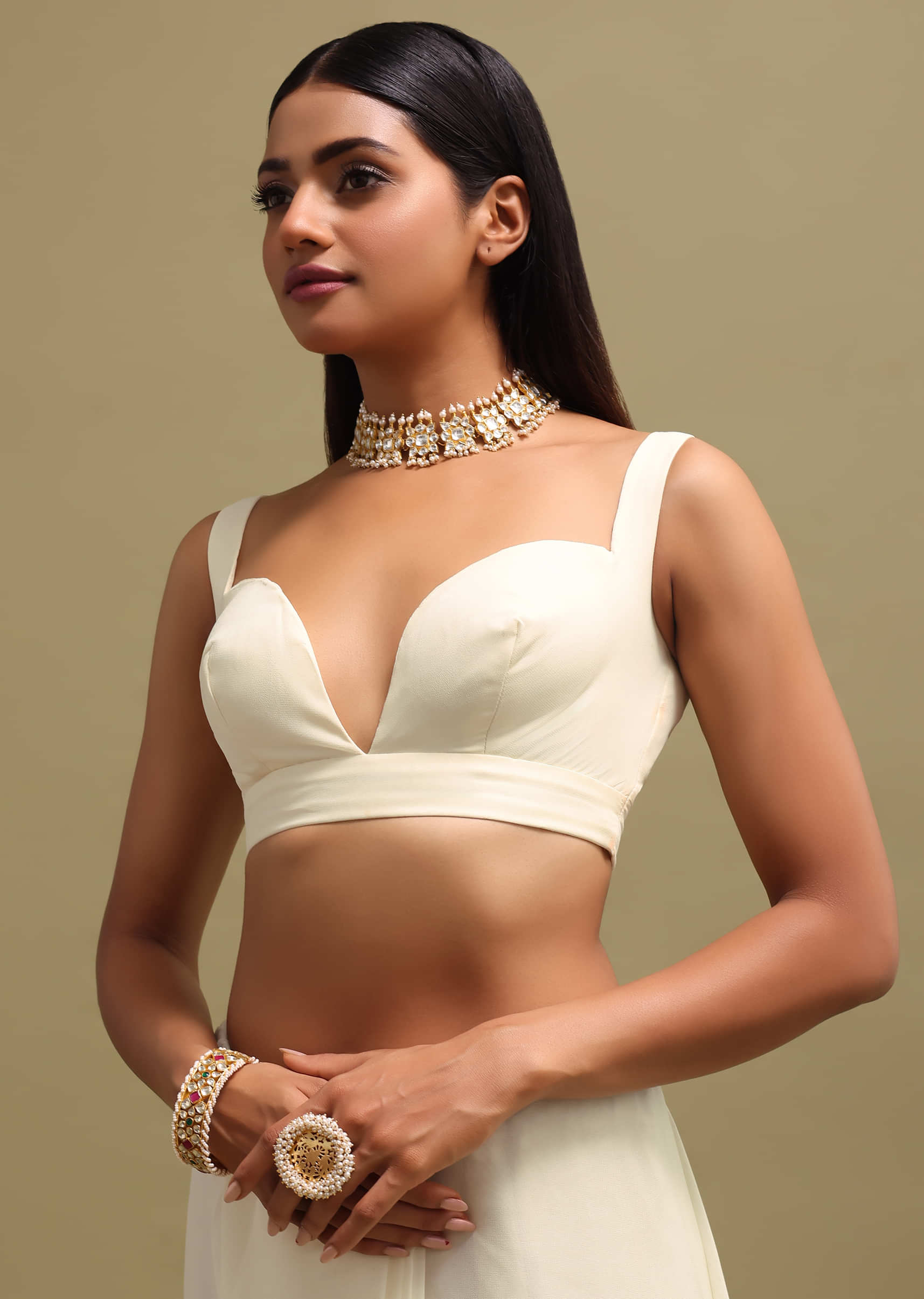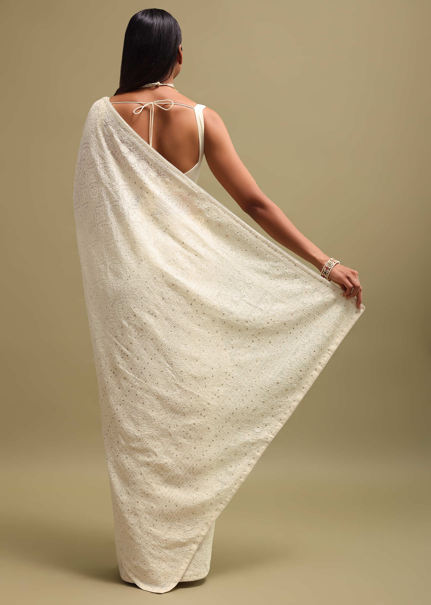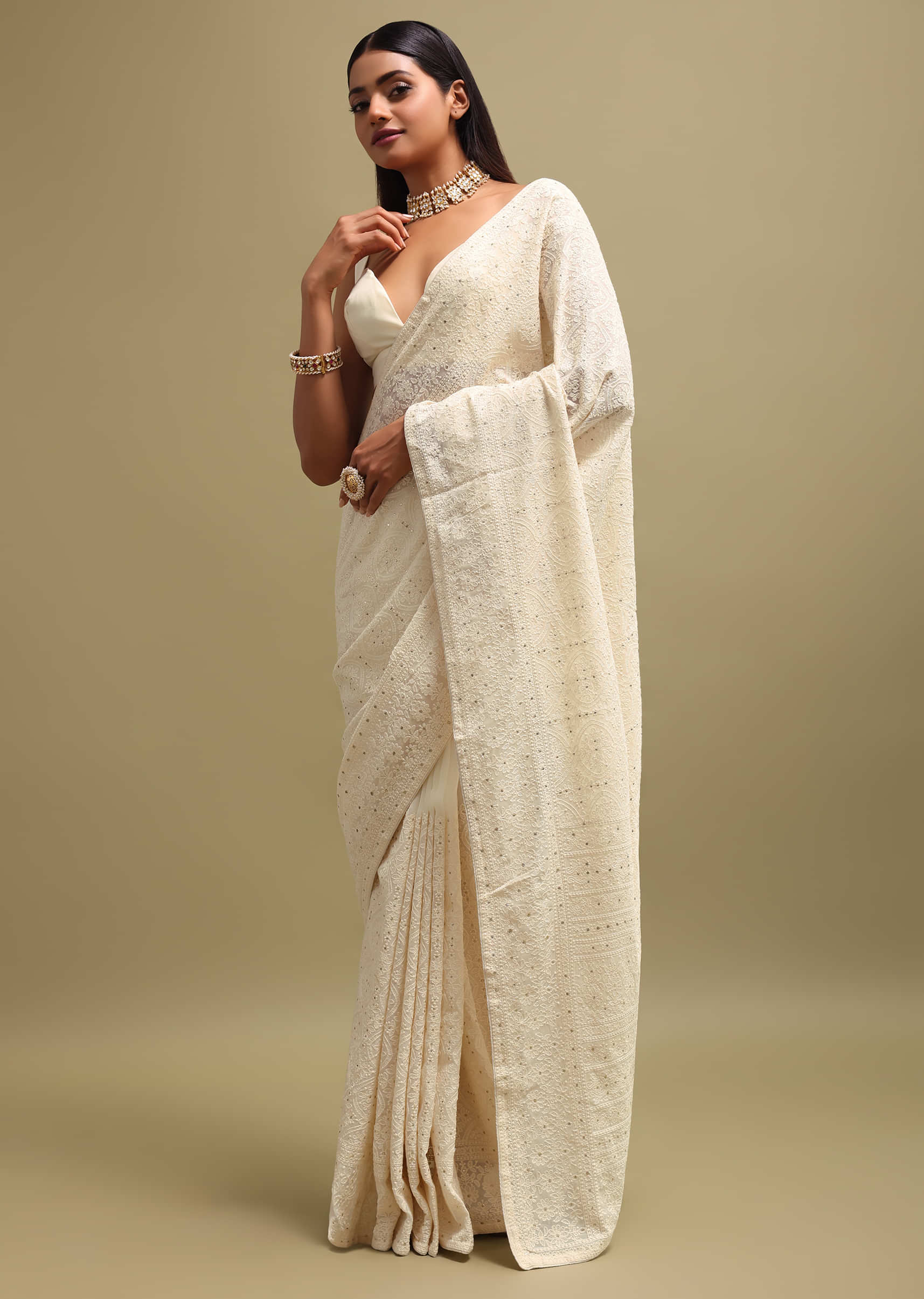 - With its delicate embroidery and timeless elegance, the off-white saree continues to be a fashion statement.