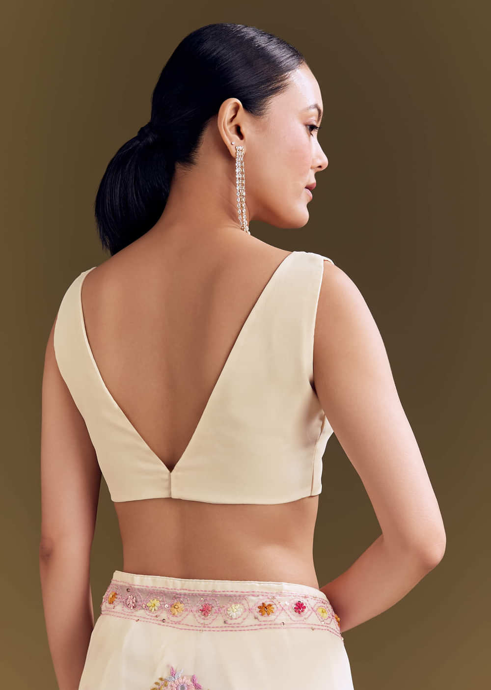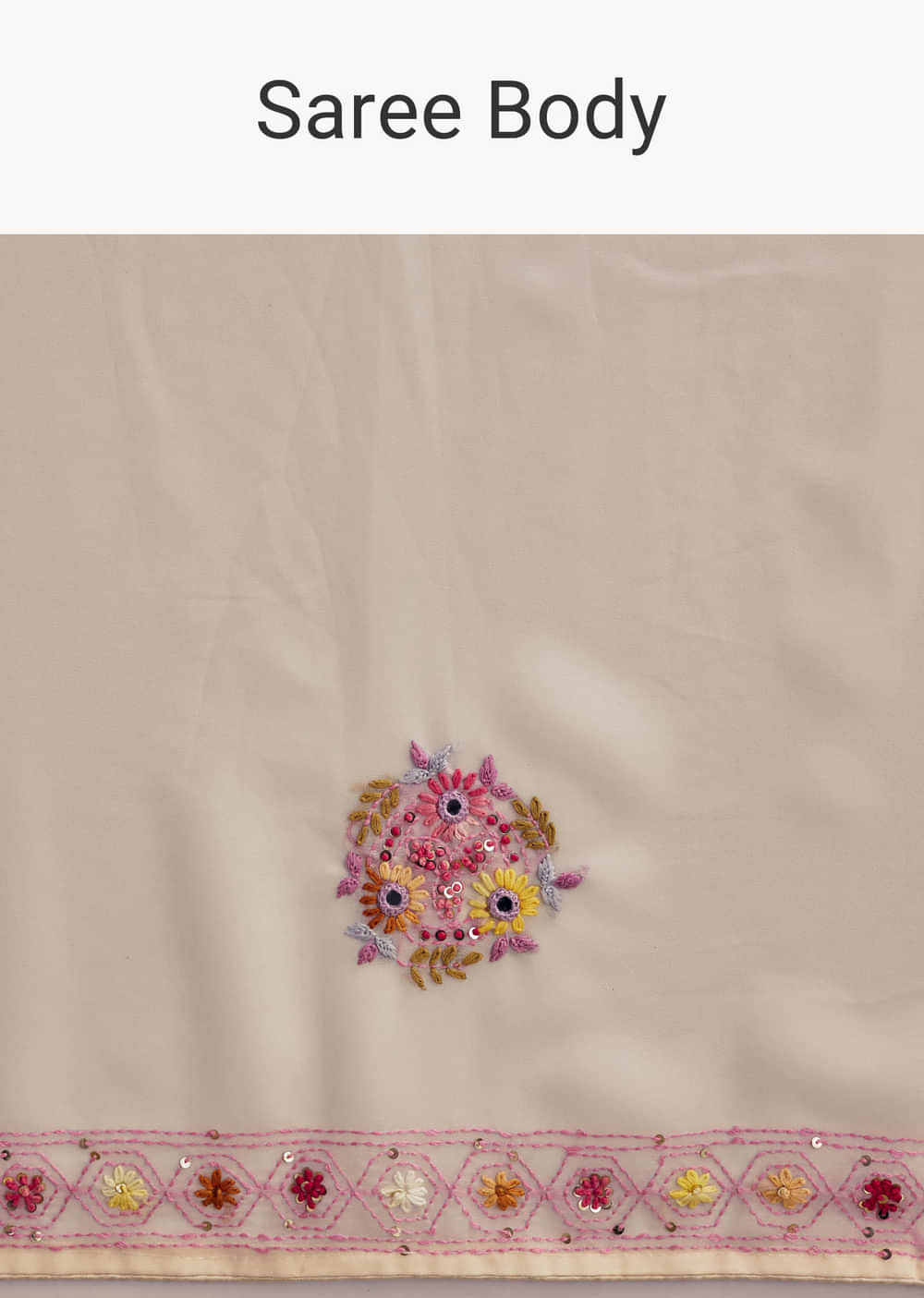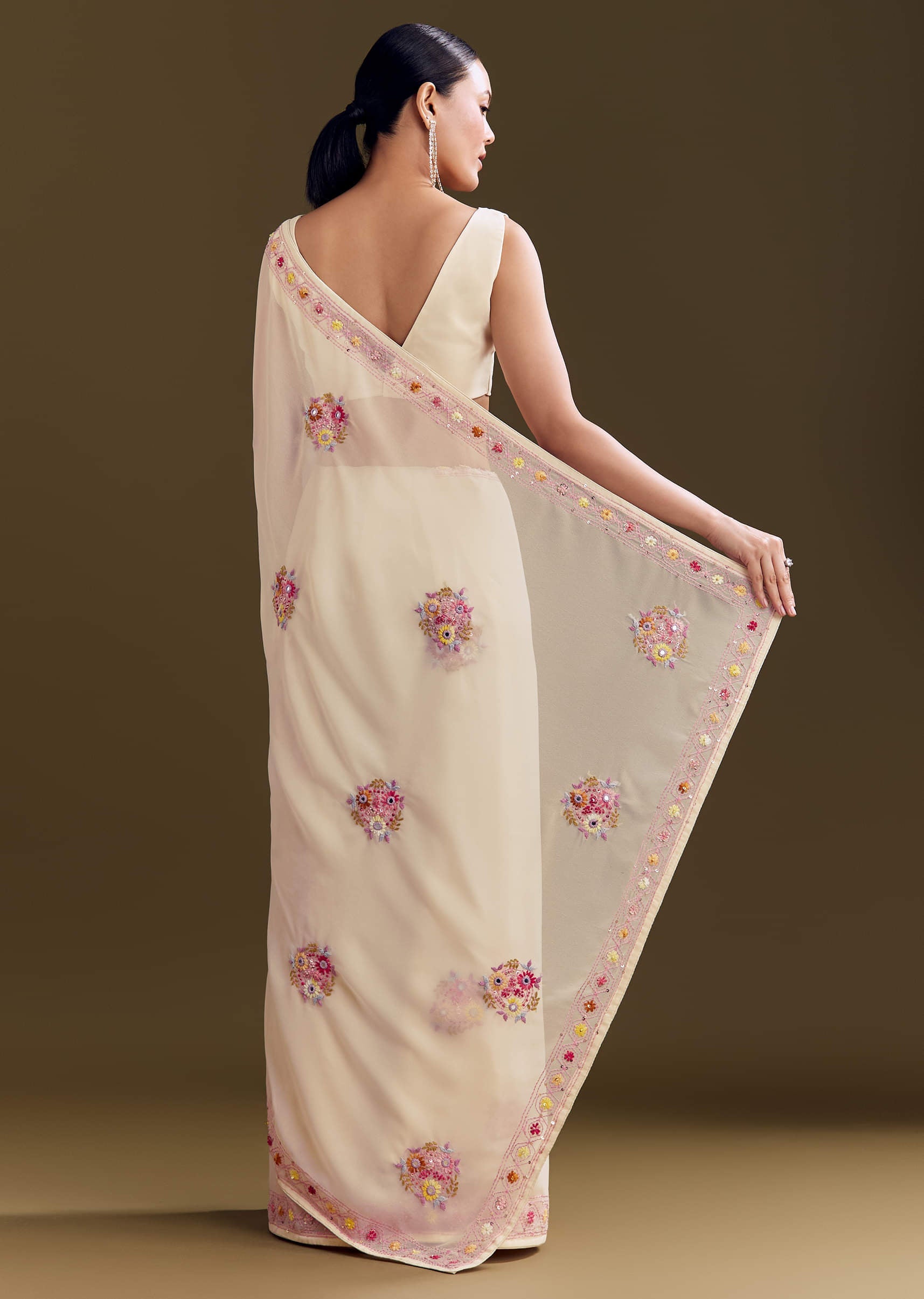 This off white saree in georgette showcases delicate Kashmiri bud embroidery across the drape. Understated elegance for refined festive wear. Awarded as the Most Trusted Brand, we're delivering styles you love, just as promised.